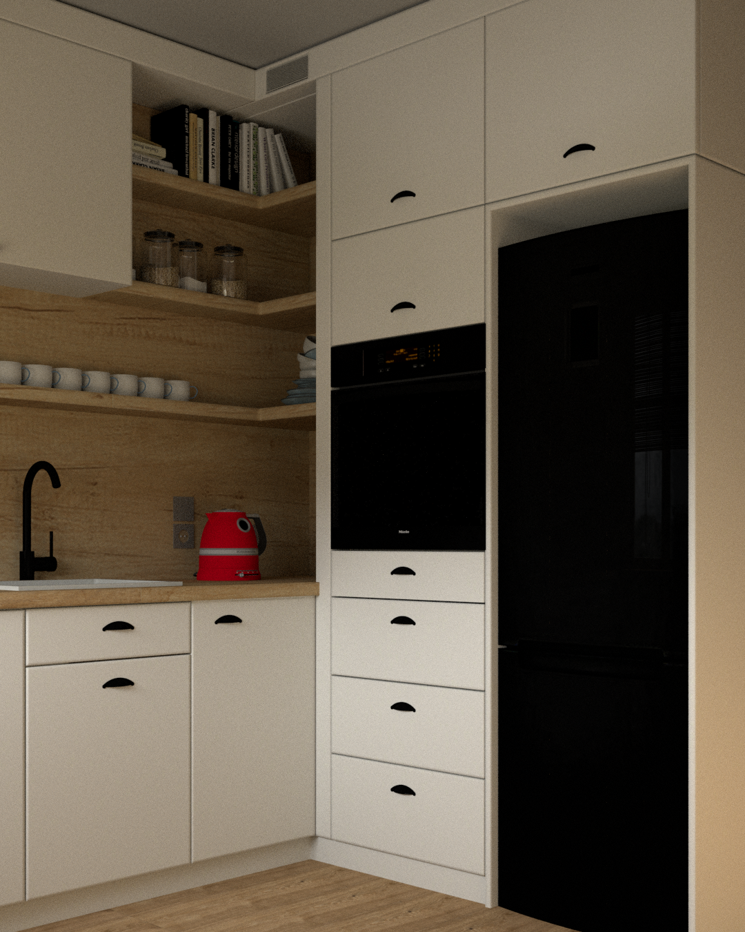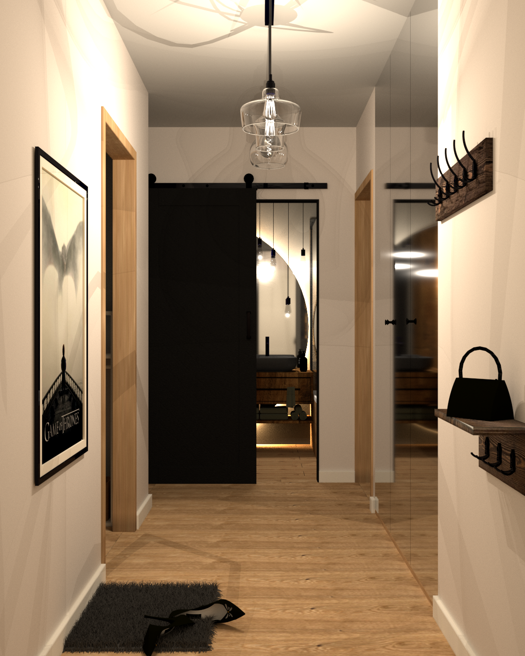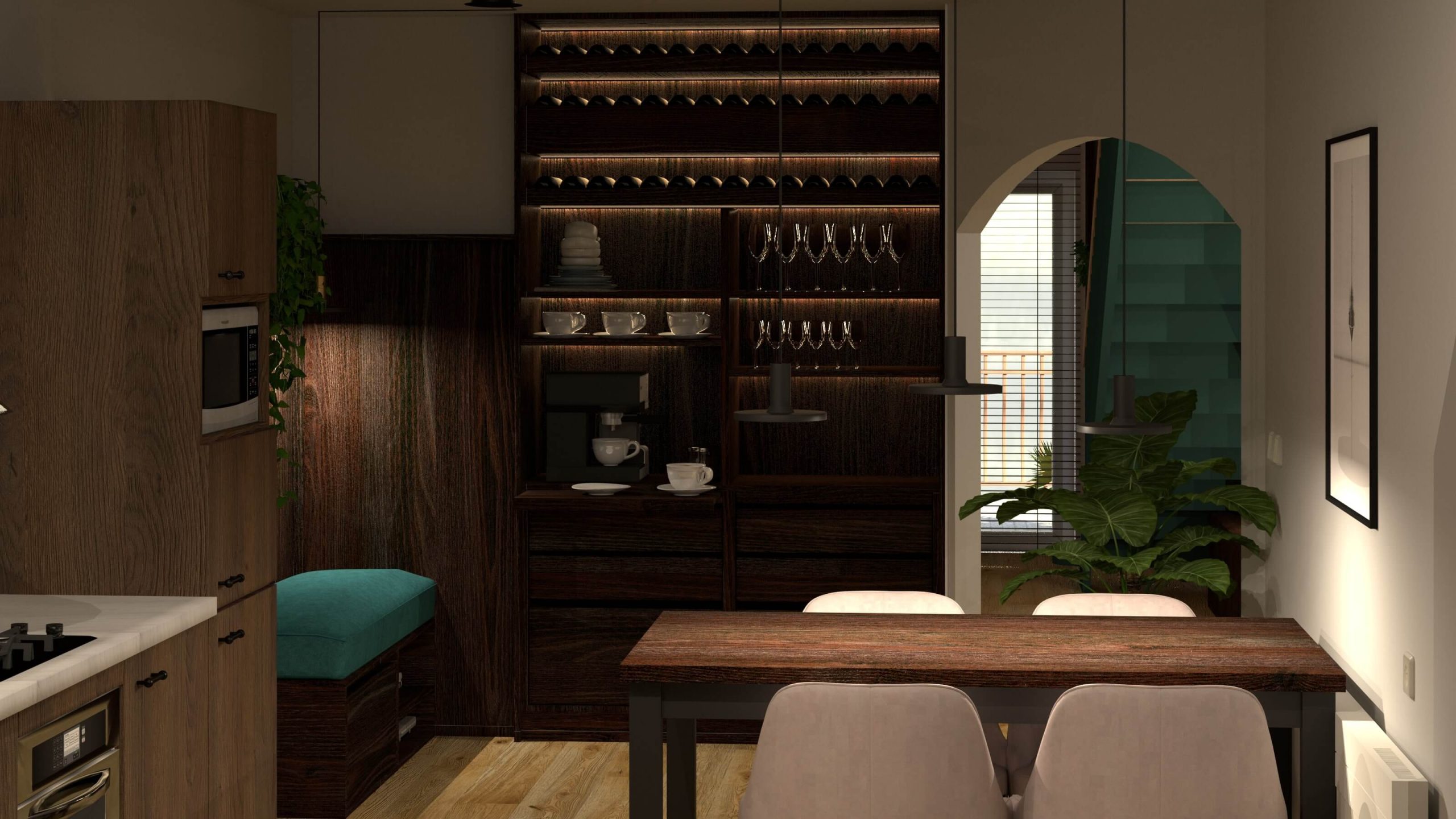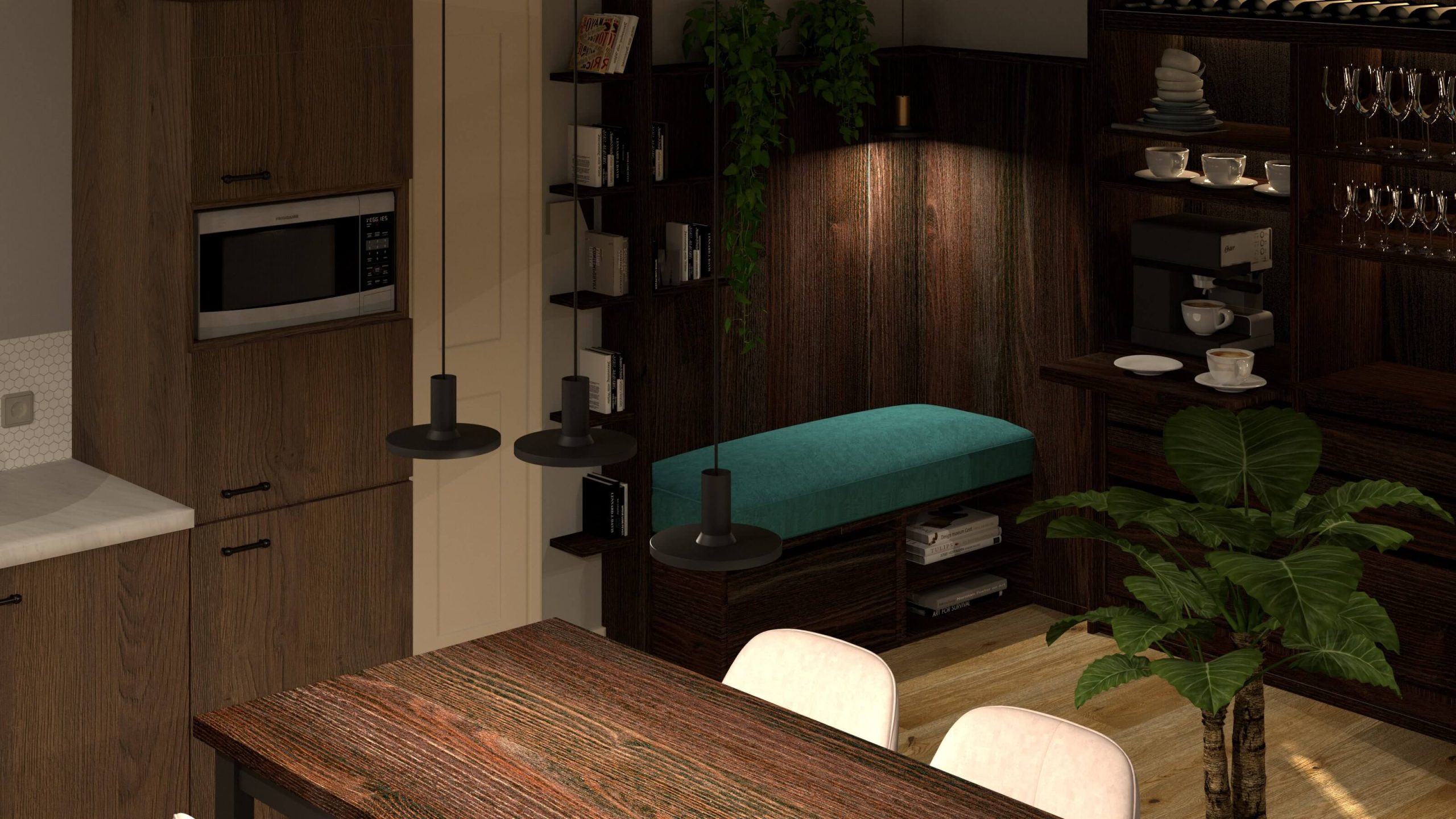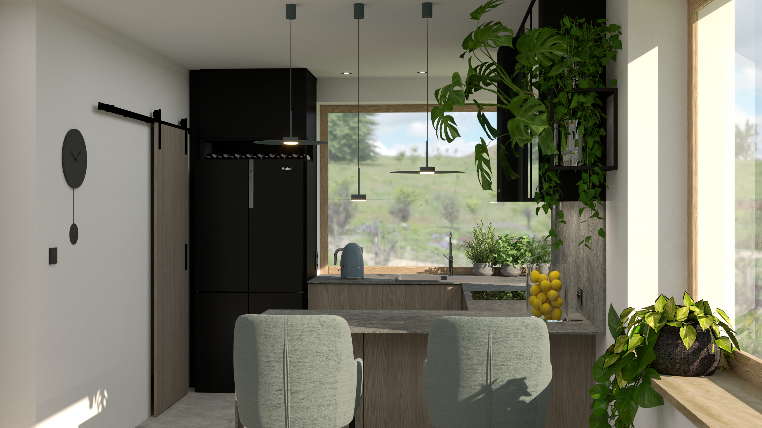 Miało być przestronnie i funkcjonalnie. Klimatyczna kuchnia o charakterze loftowym dla mężczyzny lubiącego dobre wino podczas gotowania, pasjonata rowerowych wycieczek górskich. Wysoka zabudowa z prostymi ciemnymi frontami, blat roboczy pod wiszącymi szafkami przedłużony barkiem odgradzającym kuchnię od części wypoczynkowej. Szafki bez uchwytów (system otwierania „klik-klak”). Elegancka kolorystyka nawiązująca do angielskich klubów. Kolor mebli współgrający z brązowo-szarymi deskami na podłodze oraz czarną cegłą na ścianie. Klimatyczne lampy na długich sznurach i designerski stołek barowy idealnie pasujące do surowego wnętrza.
