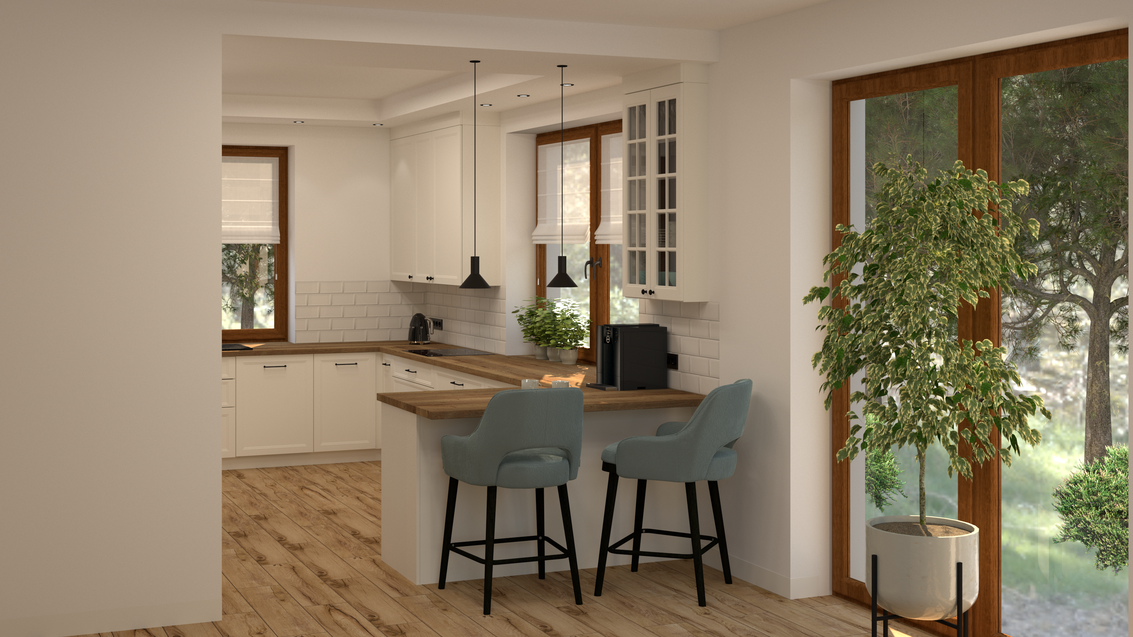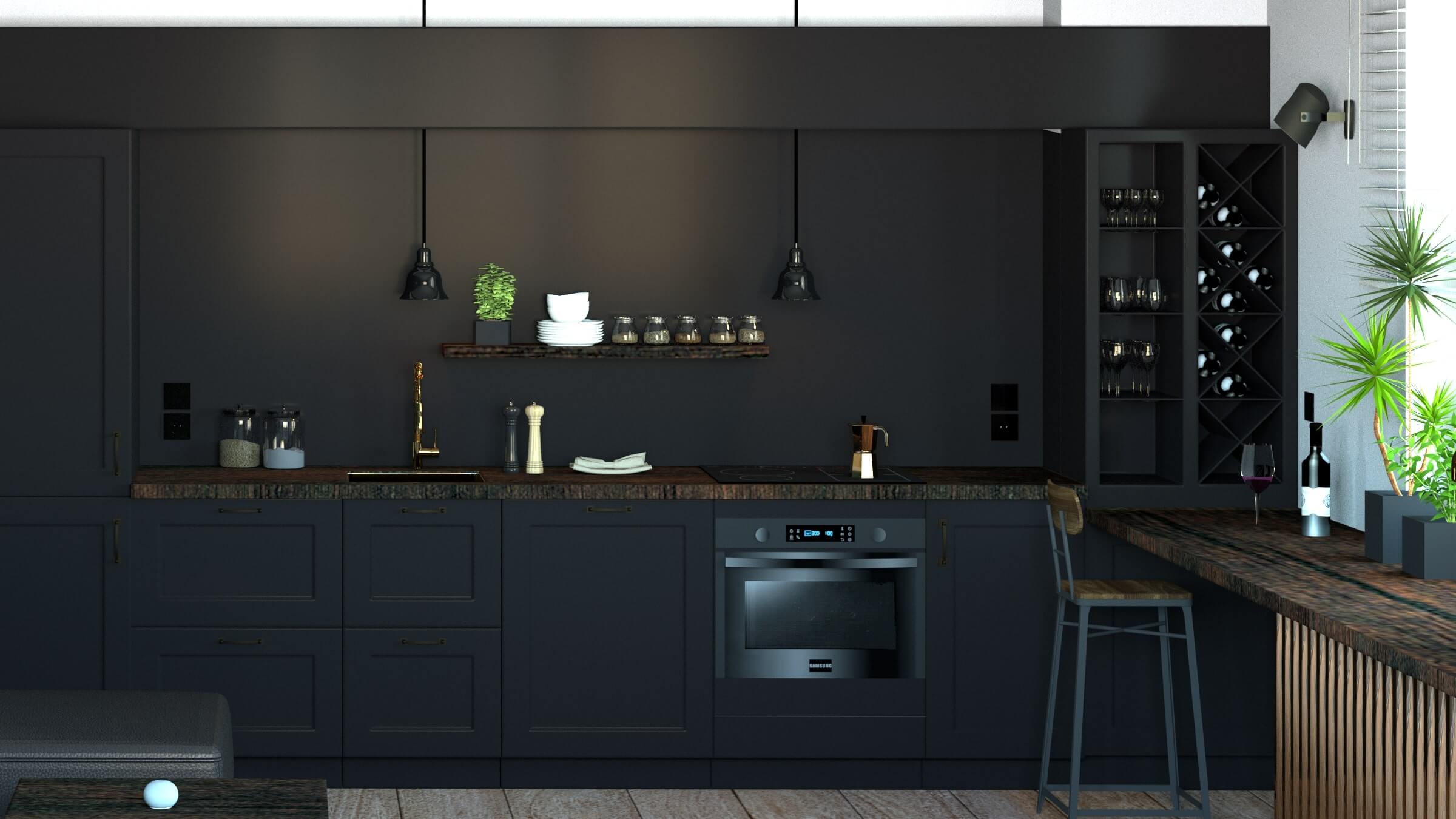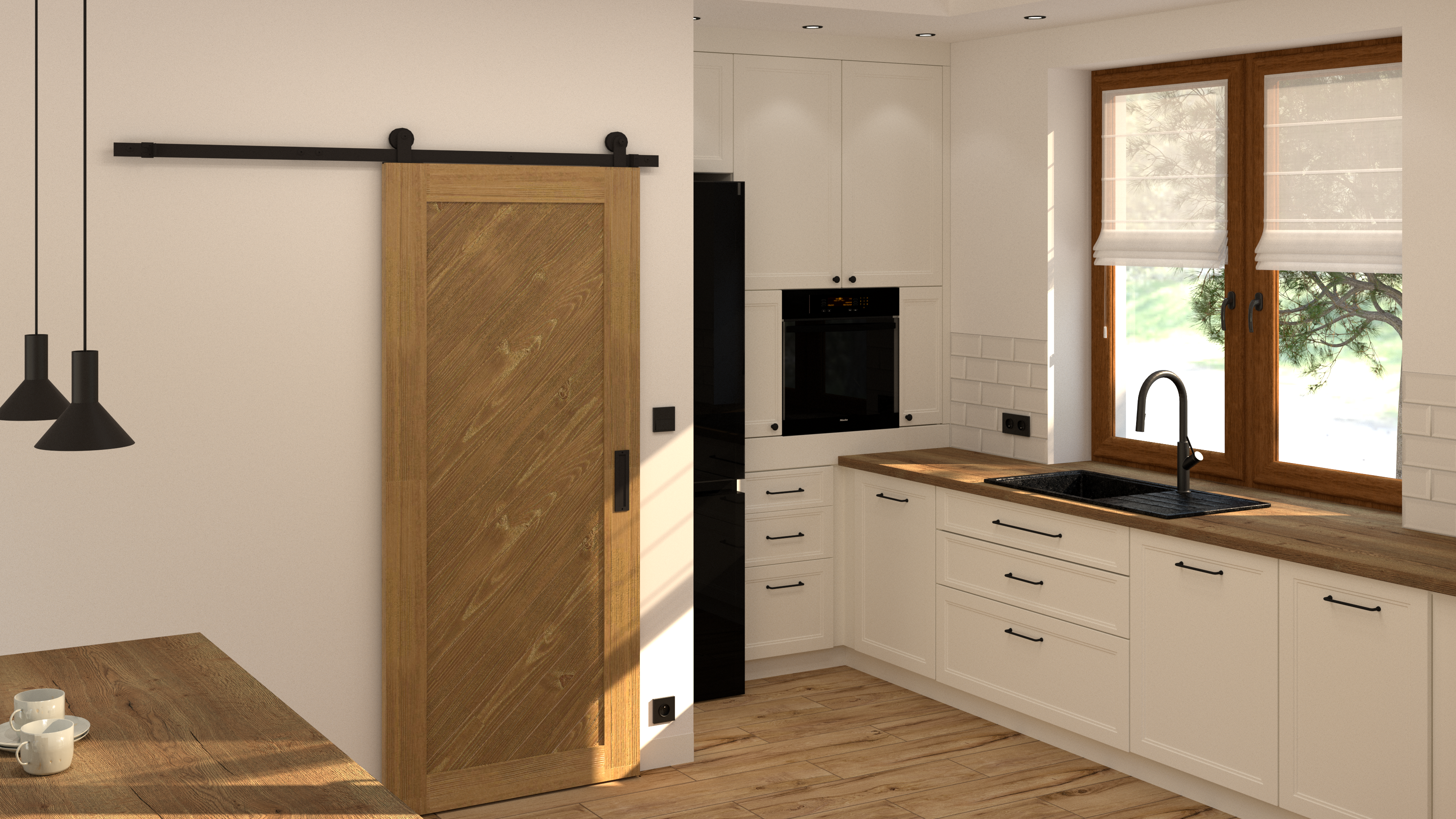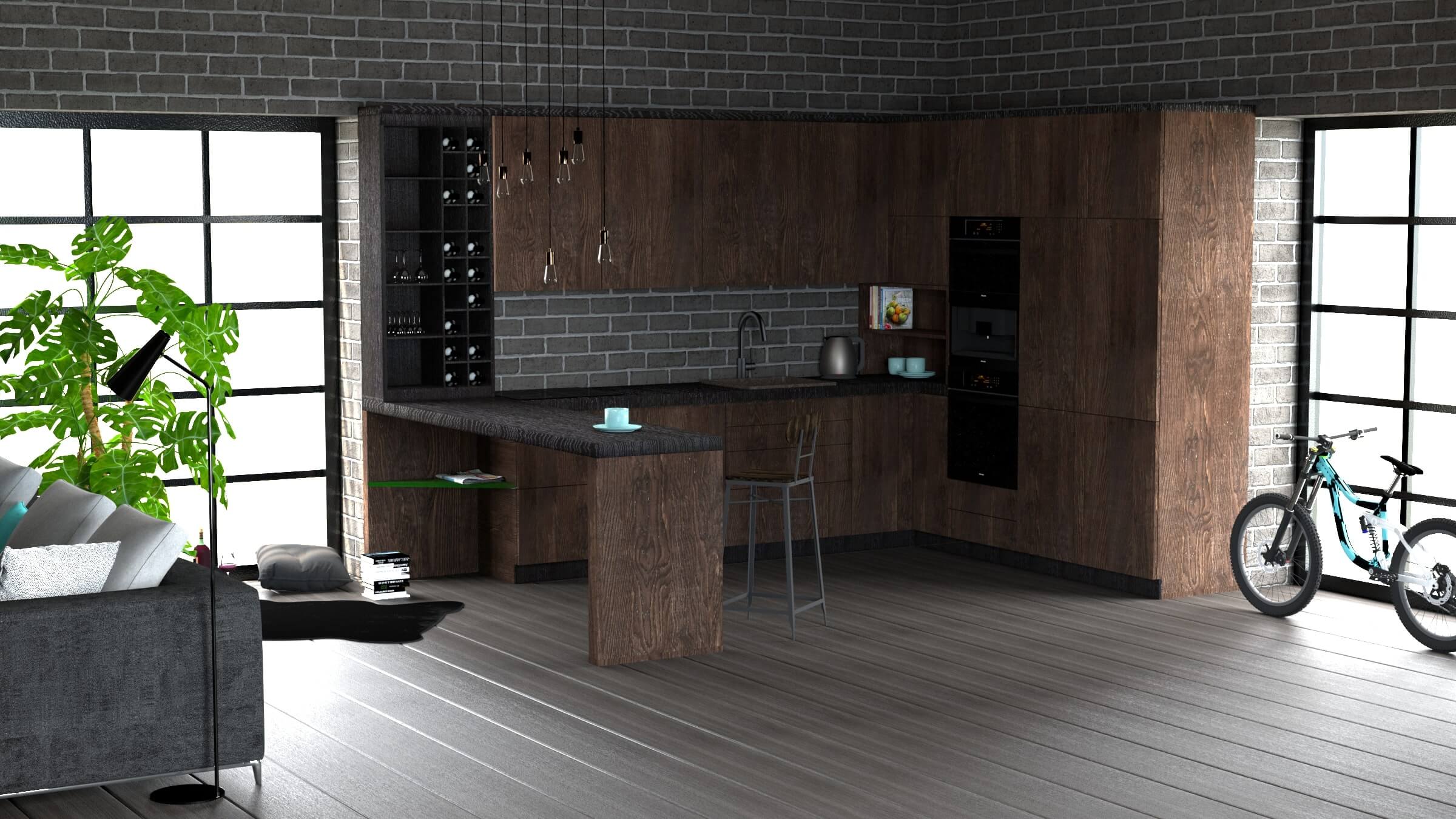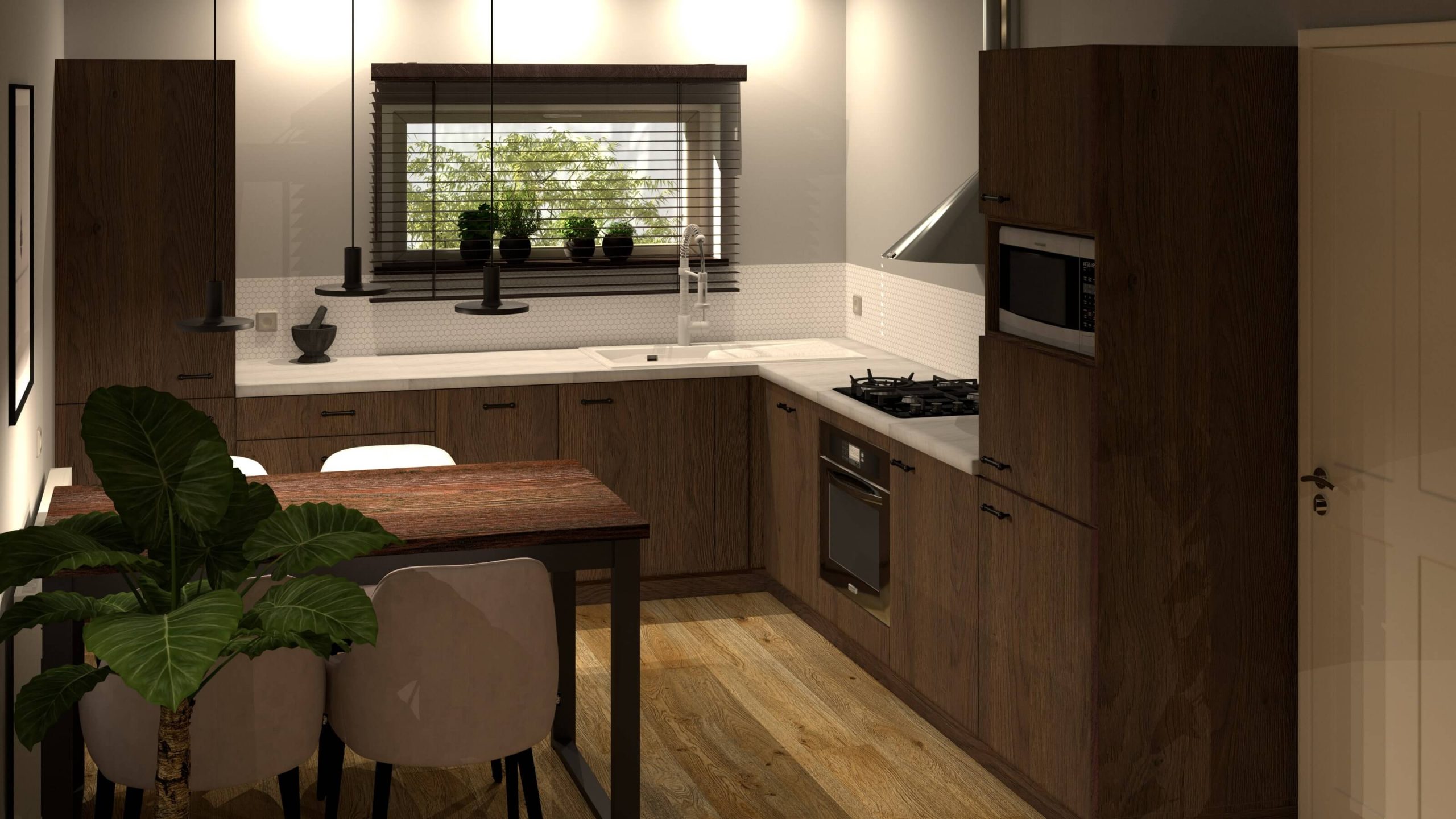 Miało być przestronnie i funkcjonalnie. Klimatyczna kuchnia o charakterze loftowym dla mężczyzny lubiącego dobre wino podczas gotowania, pasjonata rowerowych wycieczek górskich. Wysoka zabudowa z prostymi ciemnymi frontami, blat roboczy pod wiszącymi szafkami przedłużony barkiem odgradzającym kuchnię od części wypoczynkowej. Szafki bez uchwytów (system otwierania „klik-klak”). Elegancka kolorystyka nawiązująca do angielskich klubów. Kolor mebli współgrający z brązowo-szarymi deskami na podłodze oraz czarną cegłą na ścianie. Klimatyczne lampy na długich sznurach i designerski stołek barowy idealnie pasujące do surowego wnętrza.