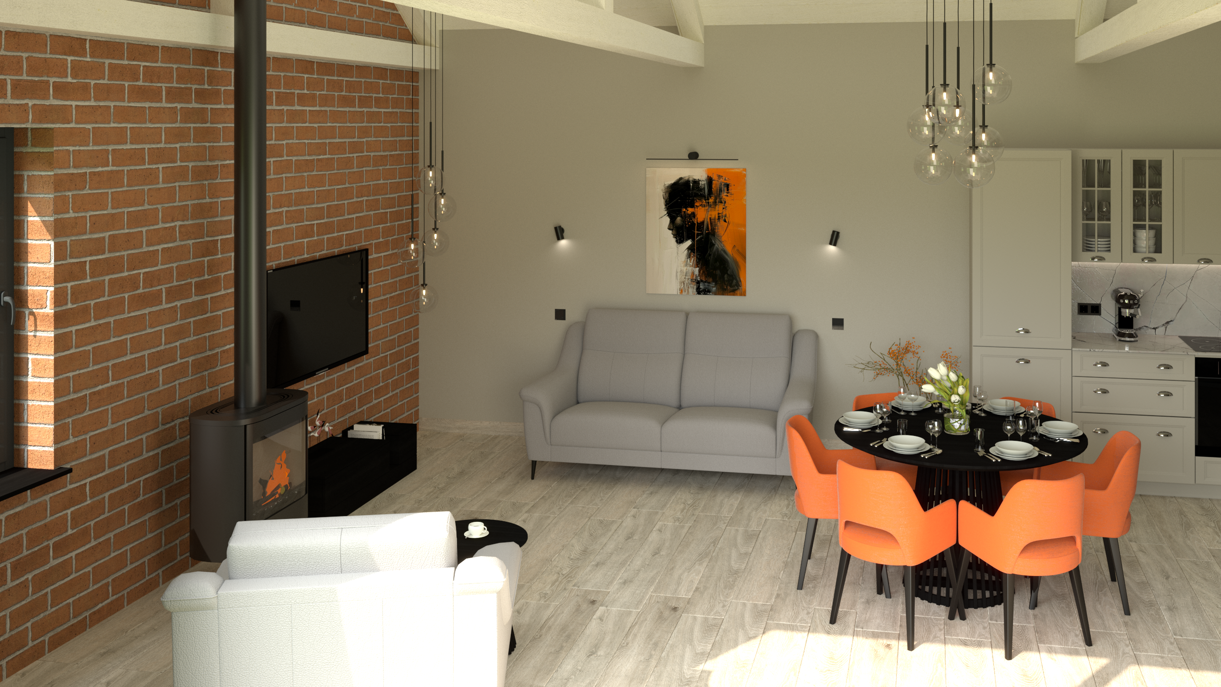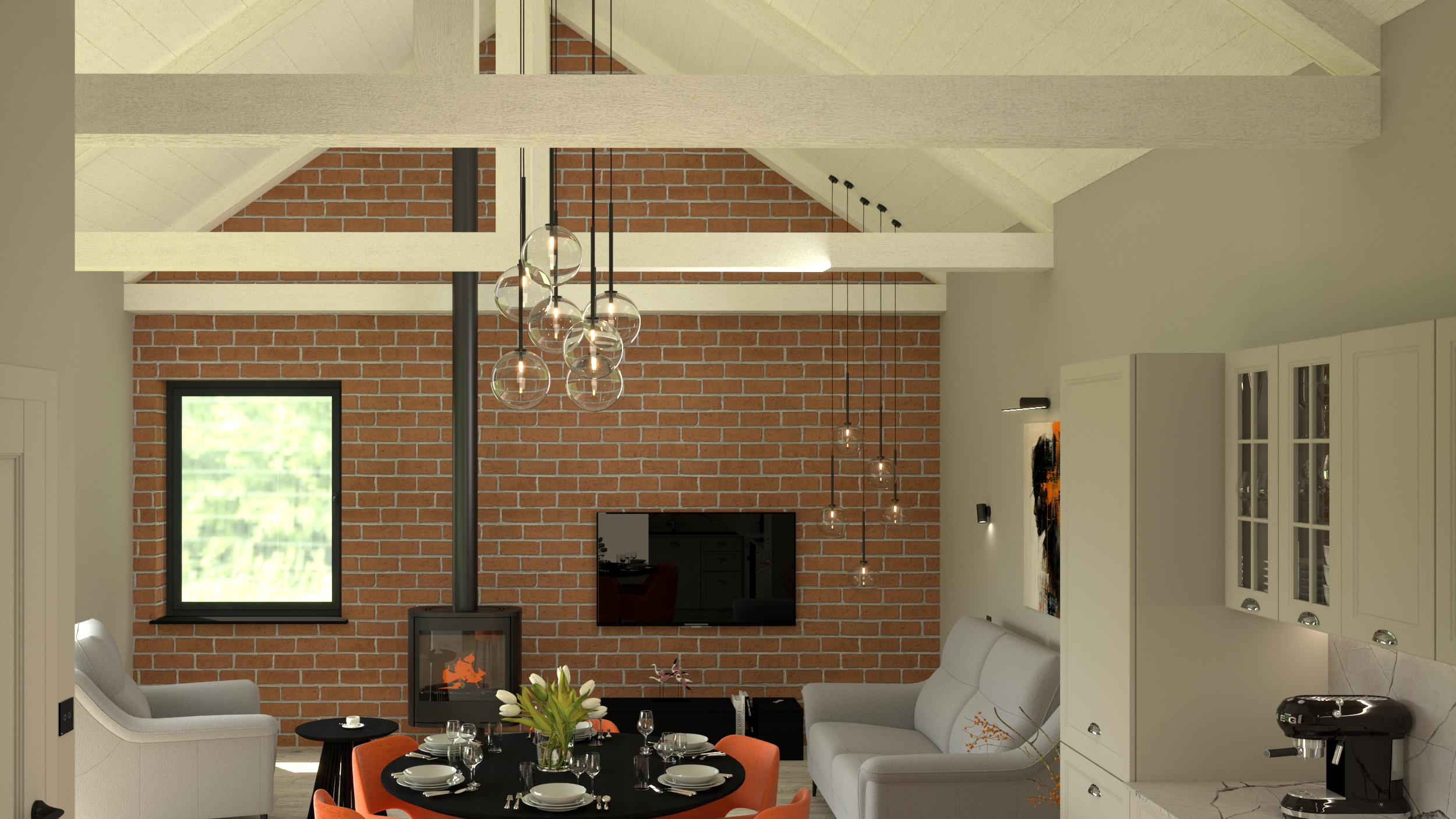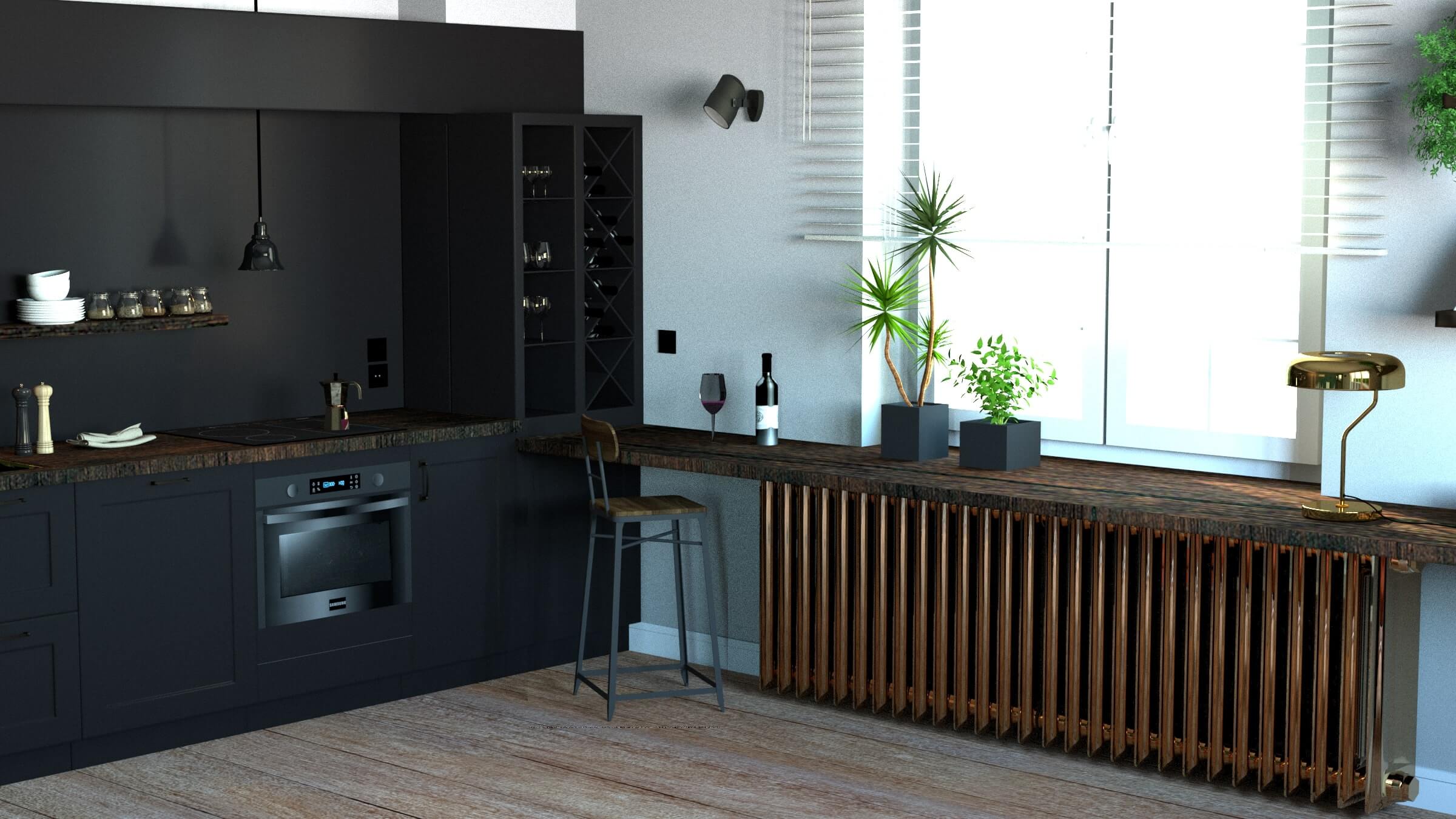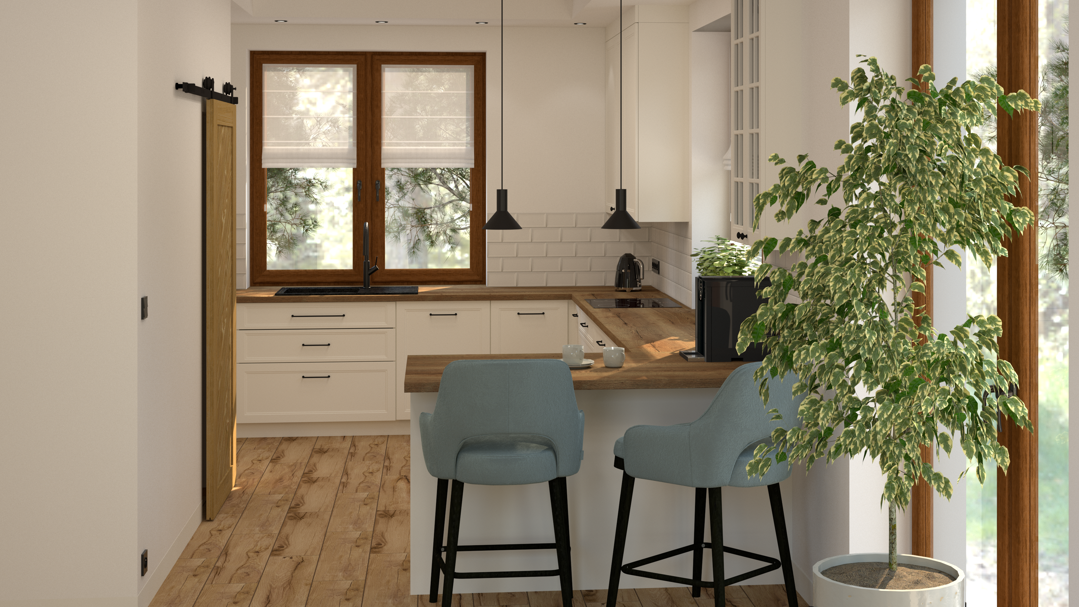 Miało być przestronnie i funkcjonalnie. Klimatyczna kuchnia o charakterze loftowym dla mężczyzny lubiącego dobre wino podczas gotowania, pasjonata rowerowych wycieczek górskich. Wysoka zabudowa z prostymi ciemnymi frontami, blat roboczy pod wiszącymi szafkami przedłużony barkiem odgradzającym kuchnię od części wypoczynkowej. Szafki bez uchwytów (system otwierania „klik-klak”). Elegancka kolorystyka nawiązująca do angielskich klubów. Kolor mebli współgrający z brązowo-szarymi deskami na podłodze oraz czarną cegłą na ścianie. Klimatyczne lampy na długich sznurach i designerski stołek barowy idealnie pasujące do surowego wnętrza.