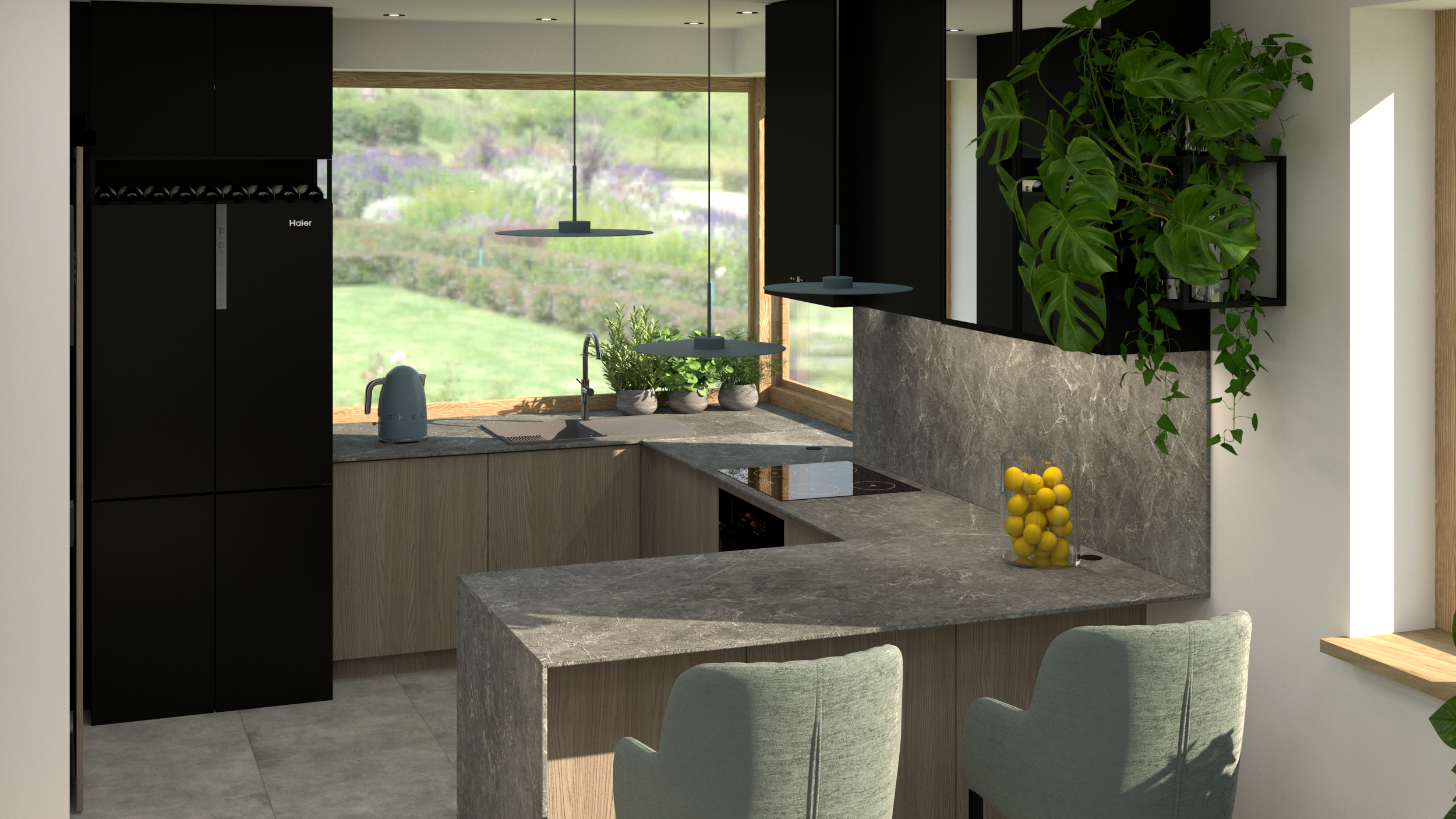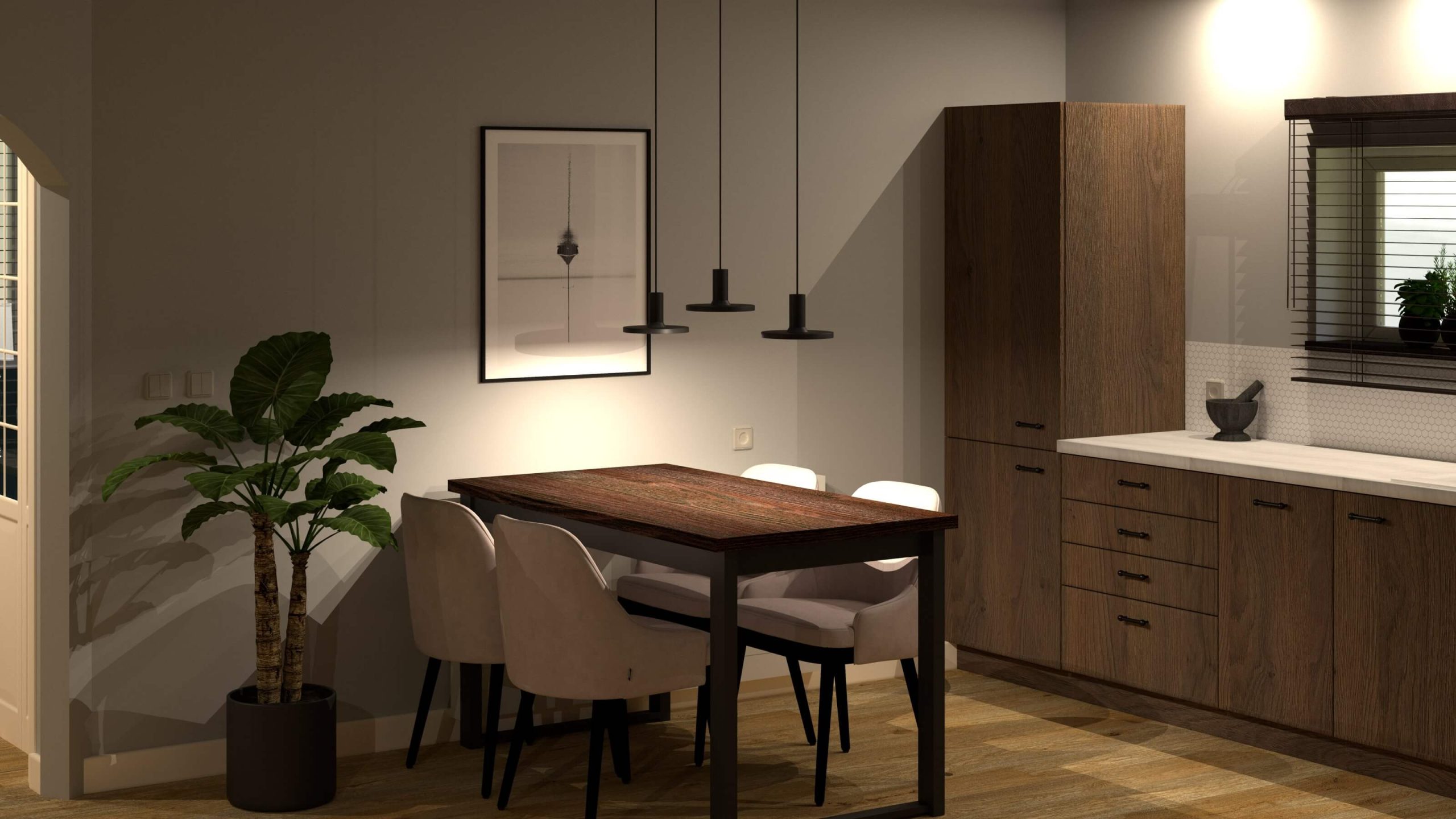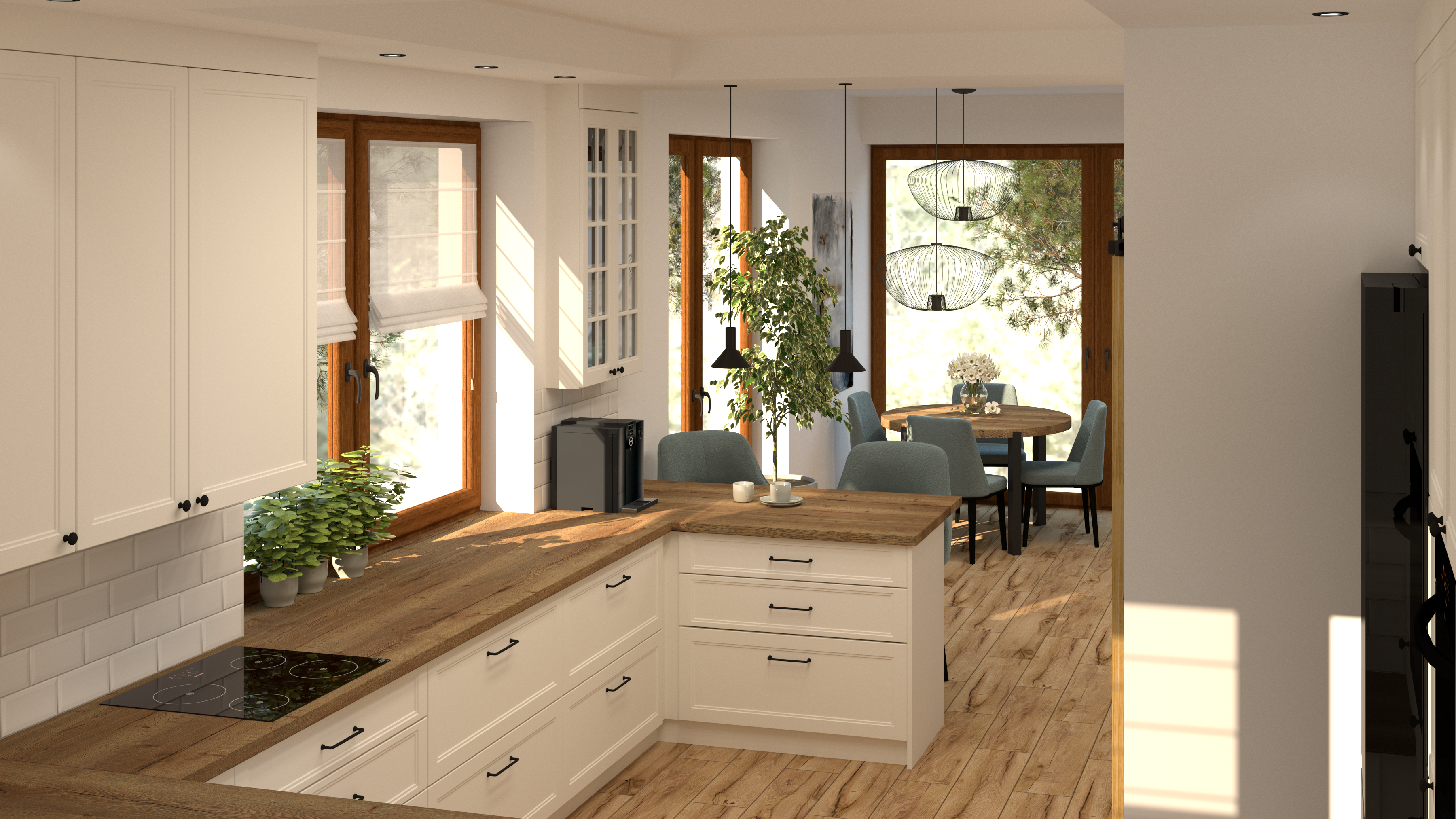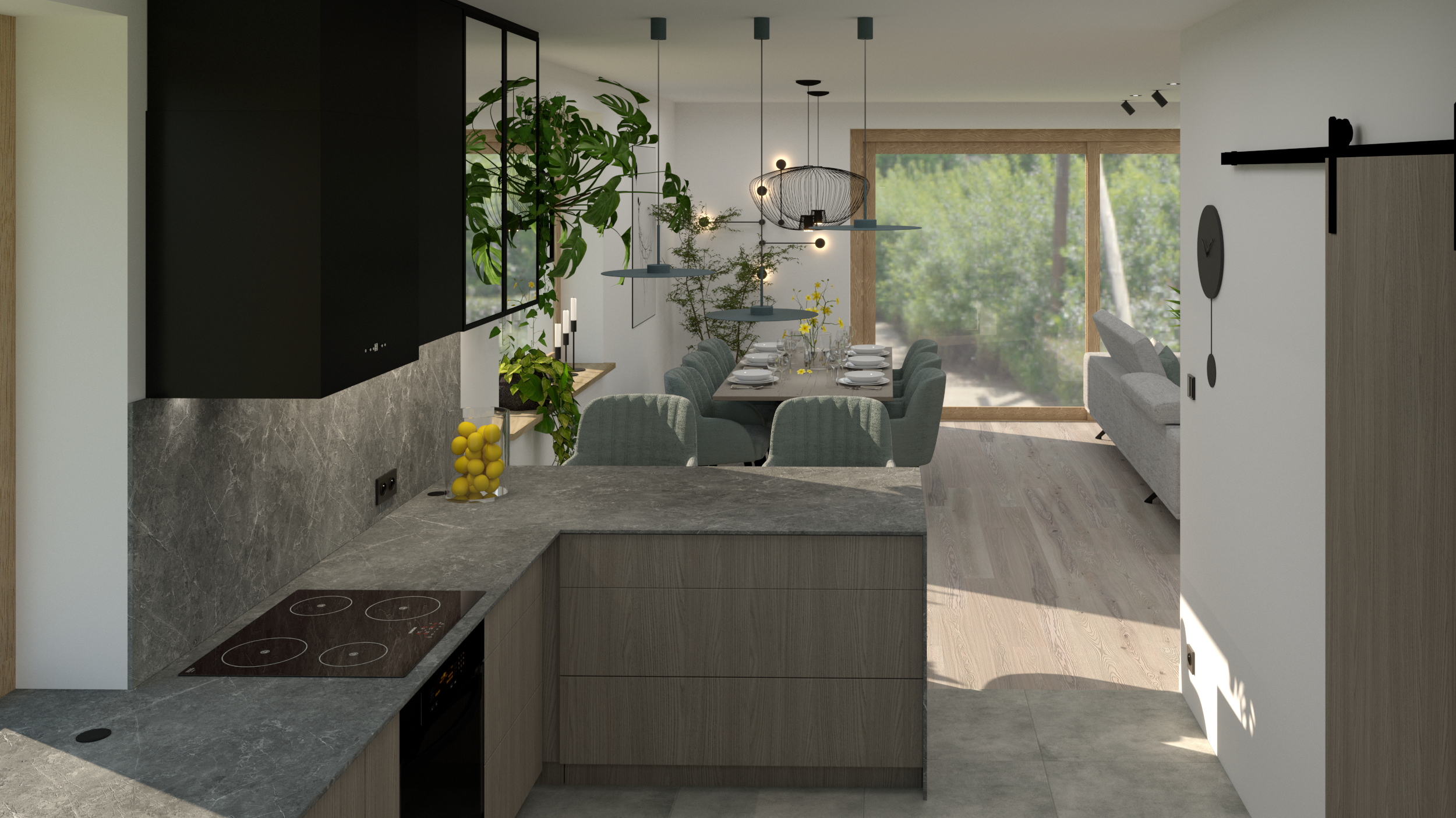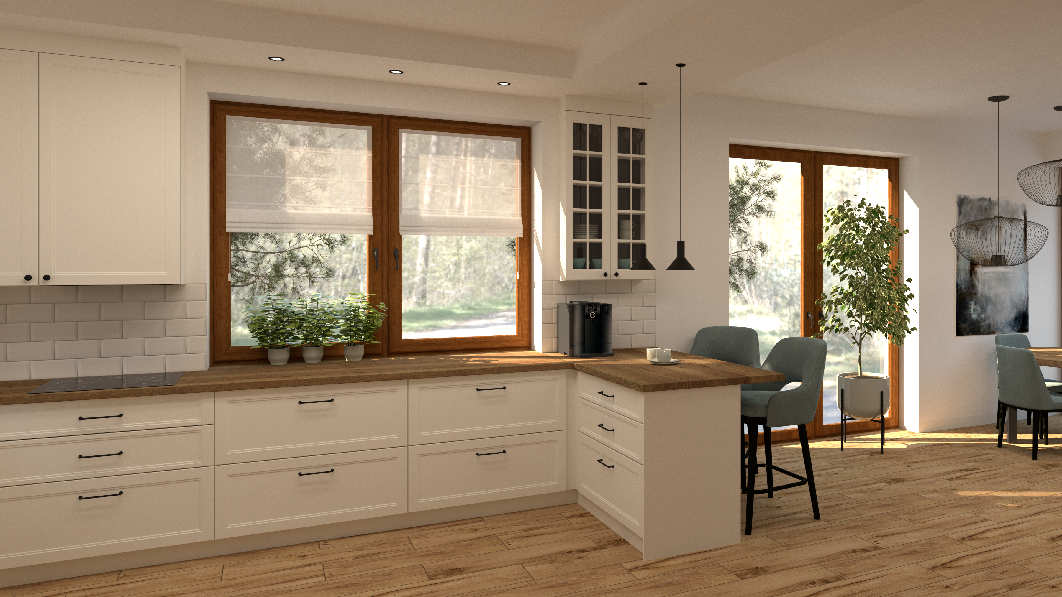 Miało być przestronnie i funkcjonalnie. Klimatyczna kuchnia o charakterze loftowym dla mężczyzny lubiącego dobre wino podczas gotowania, pasjonata rowerowych wycieczek górskich. Wysoka zabudowa z prostymi ciemnymi frontami, blat roboczy pod wiszącymi szafkami przedłużony barkiem odgradzającym kuchnię od części wypoczynkowej. Szafki bez uchwytów (system otwierania „klik-klak”). Elegancka kolorystyka nawiązująca do angielskich klubów. Kolor mebli współgrający z brązowo-szarymi deskami na podłodze oraz czarną cegłą na ścianie. Klimatyczne lampy na długich sznurach i designerski stołek barowy idealnie pasujące do surowego wnętrza.