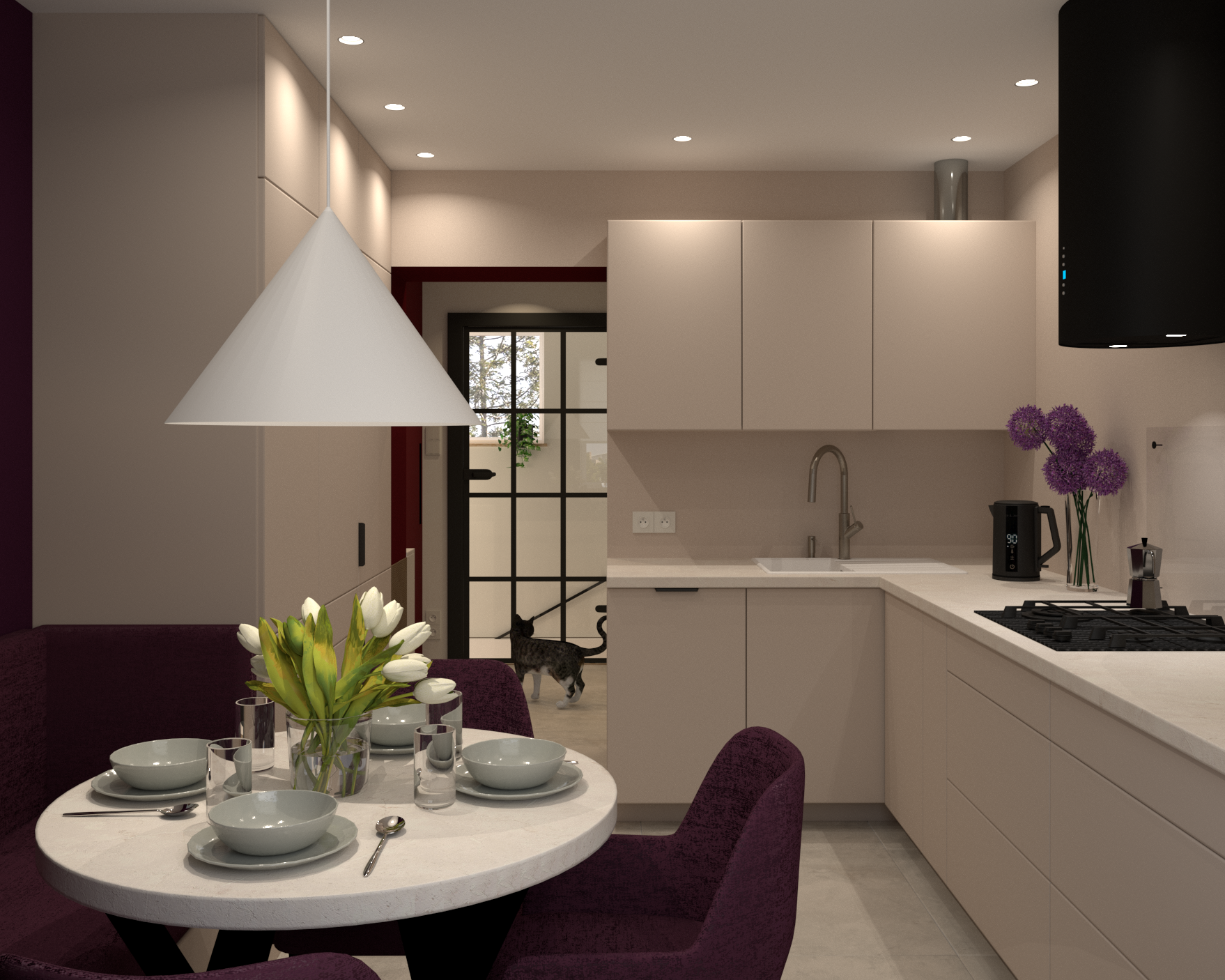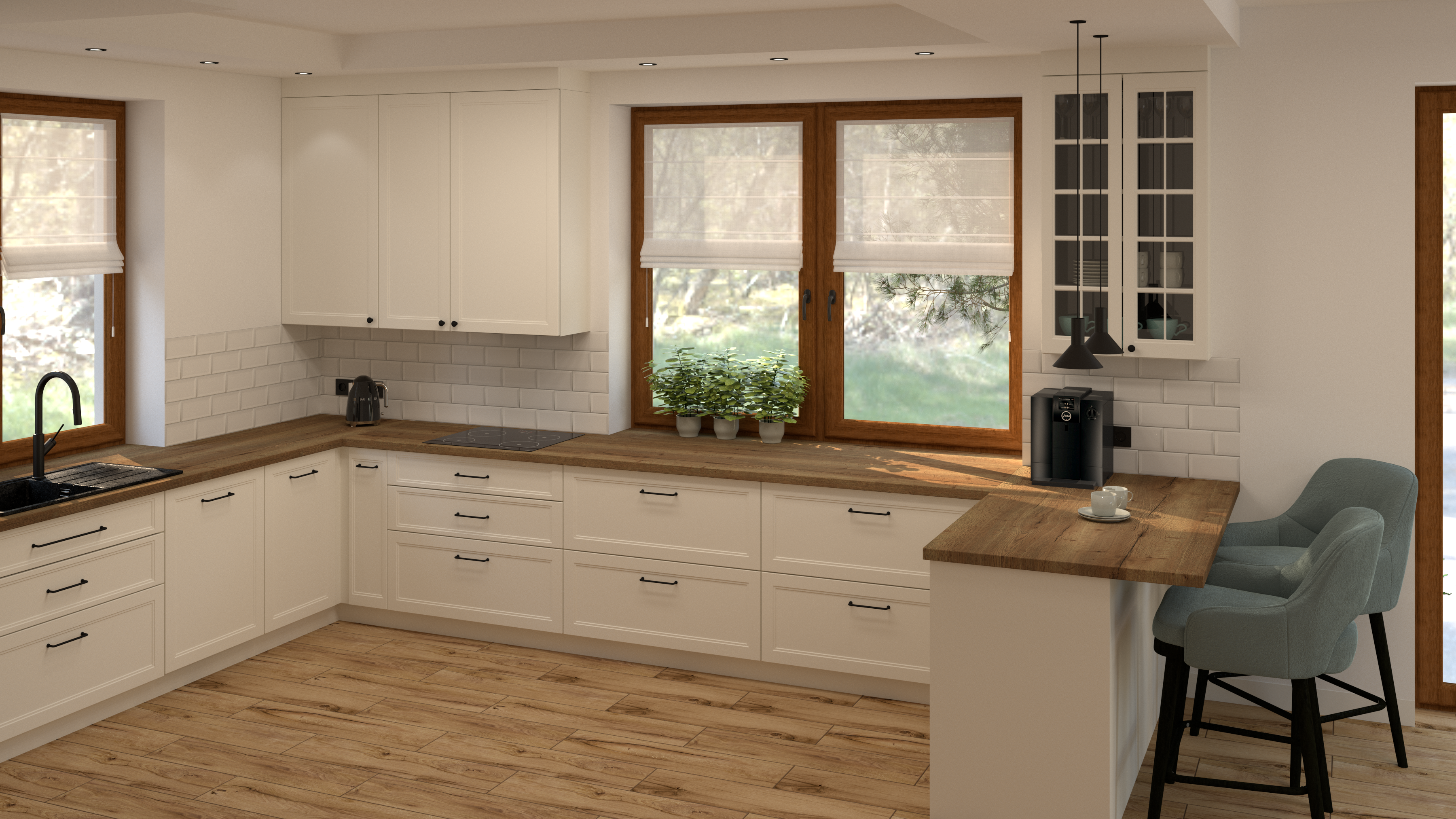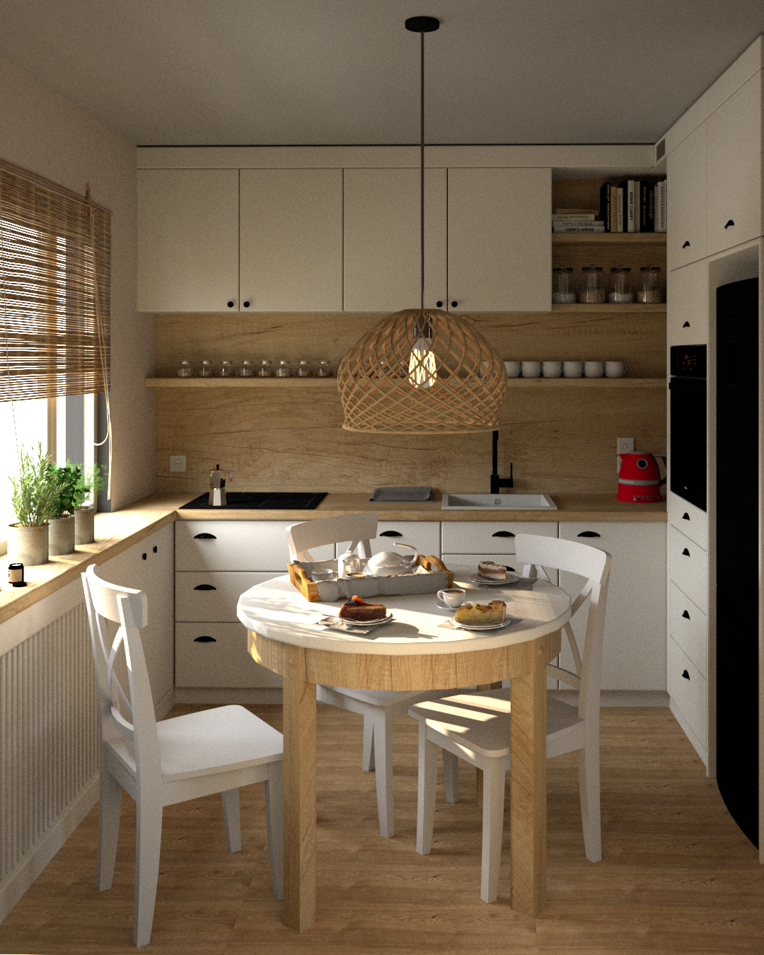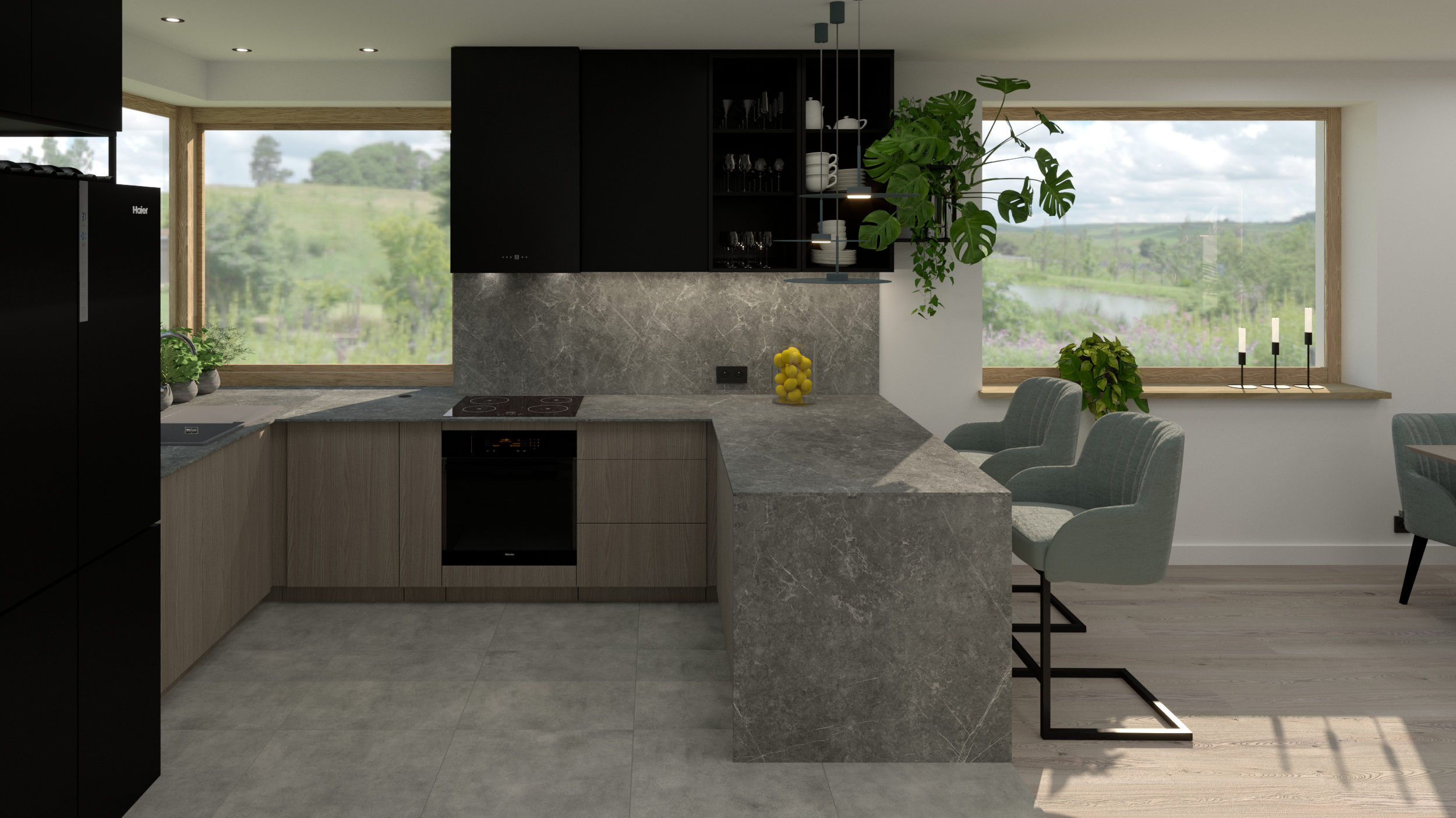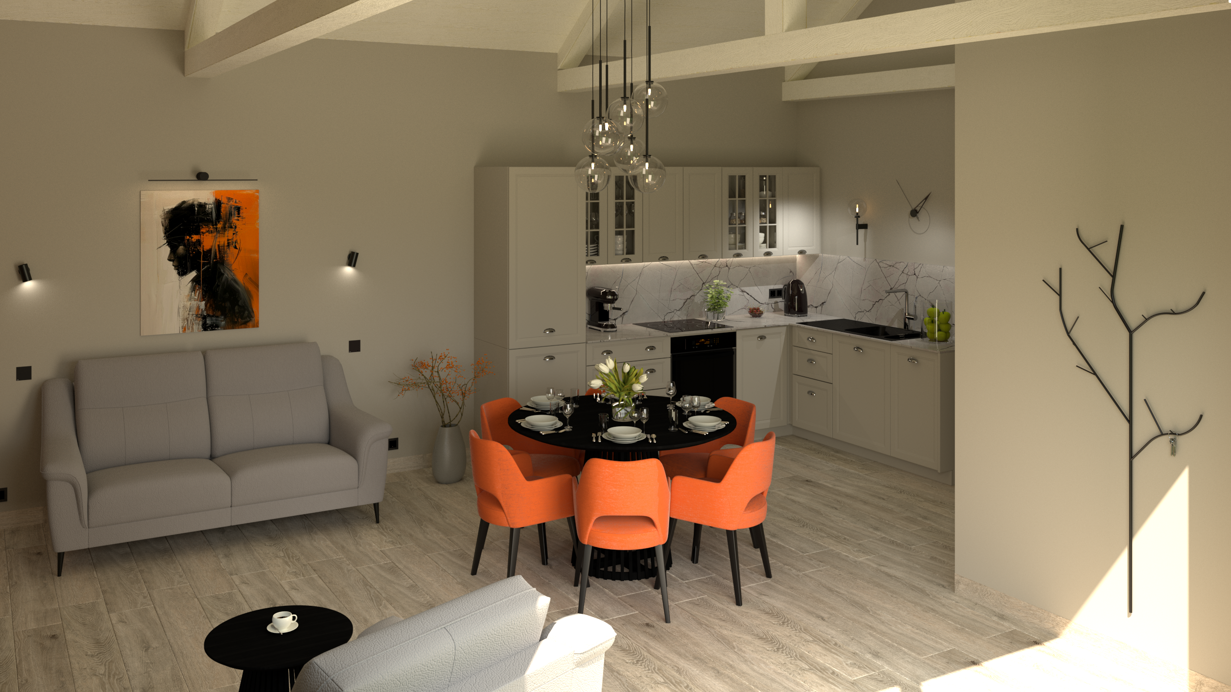 Miało być przestronnie i funkcjonalnie. Klimatyczna kuchnia o charakterze loftowym dla mężczyzny lubiącego dobre wino podczas gotowania, pasjonata rowerowych wycieczek górskich. Wysoka zabudowa z prostymi ciemnymi frontami, blat roboczy pod wiszącymi szafkami przedłużony barkiem odgradzającym kuchnię od części wypoczynkowej. Szafki bez uchwytów (system otwierania „klik-klak”). Elegancka kolorystyka nawiązująca do angielskich klubów. Kolor mebli współgrający z brązowo-szarymi deskami na podłodze oraz czarną cegłą na ścianie. Klimatyczne lampy na długich sznurach i designerski stołek barowy idealnie pasujące do surowego wnętrza.