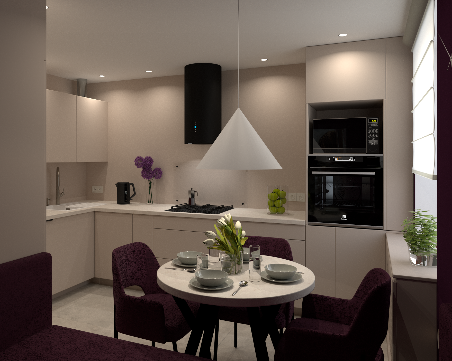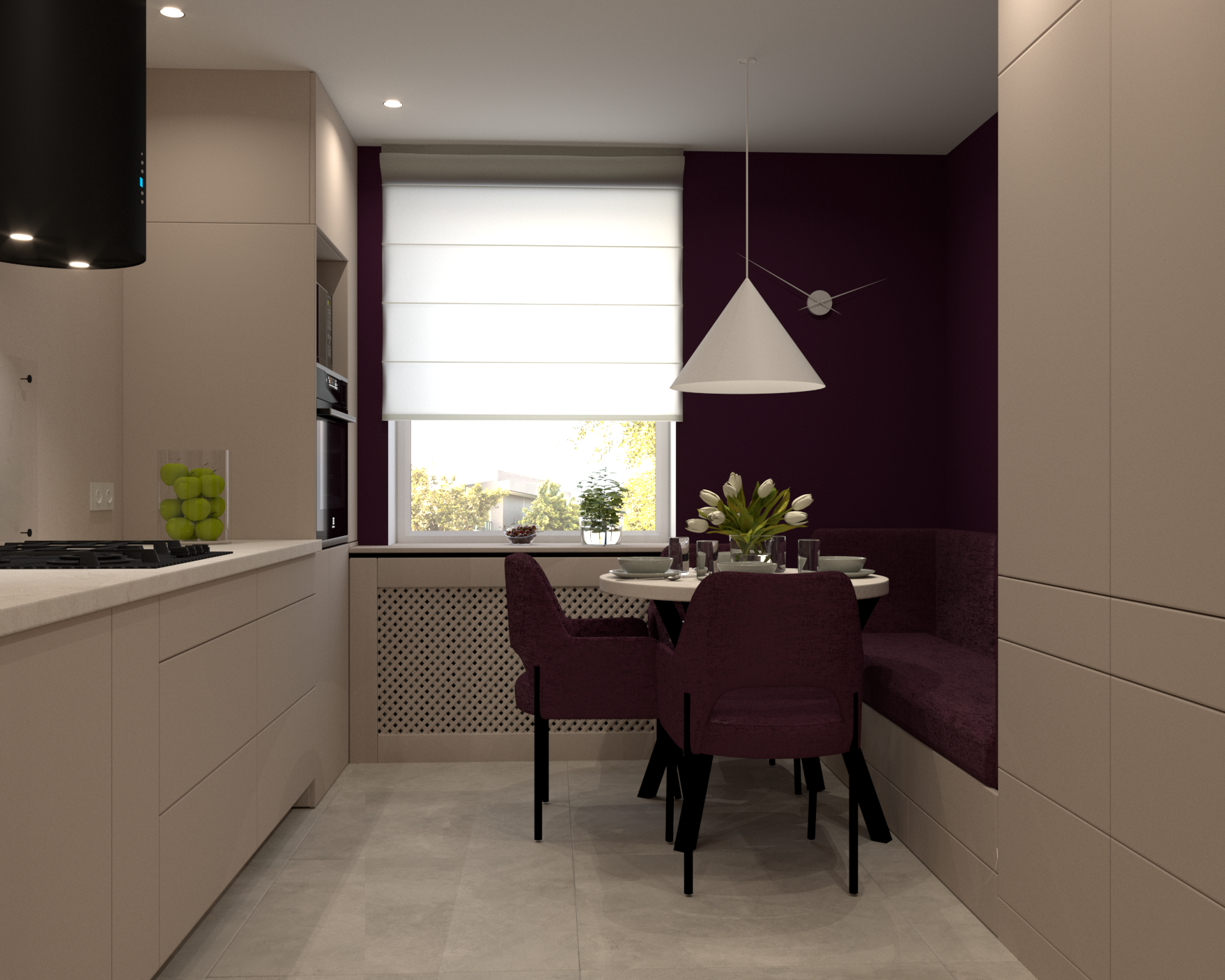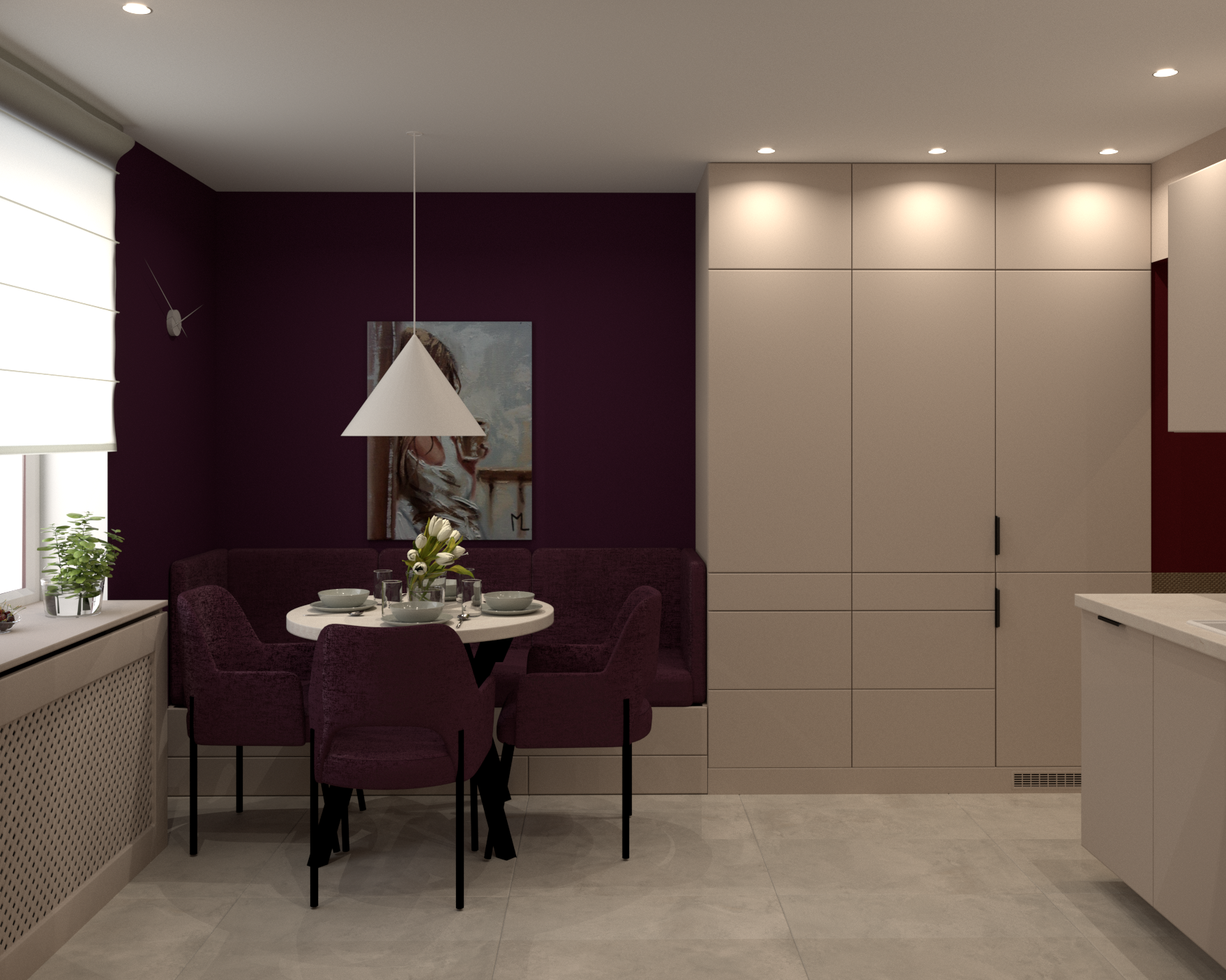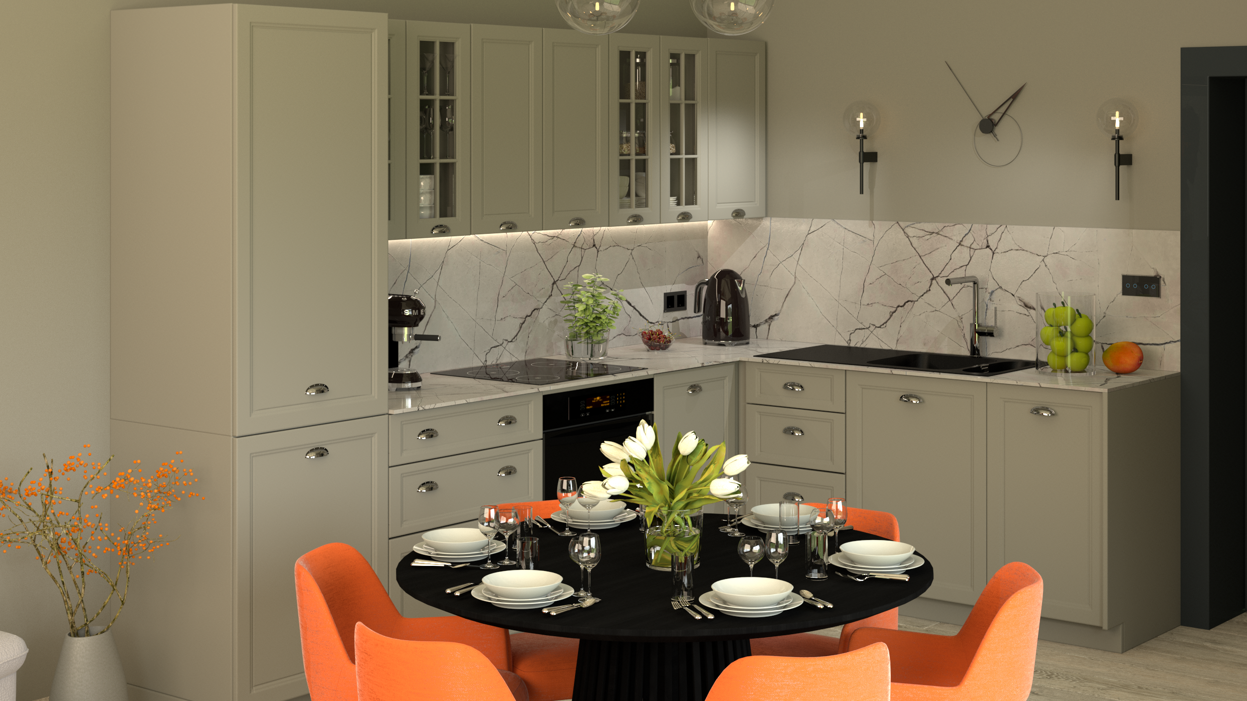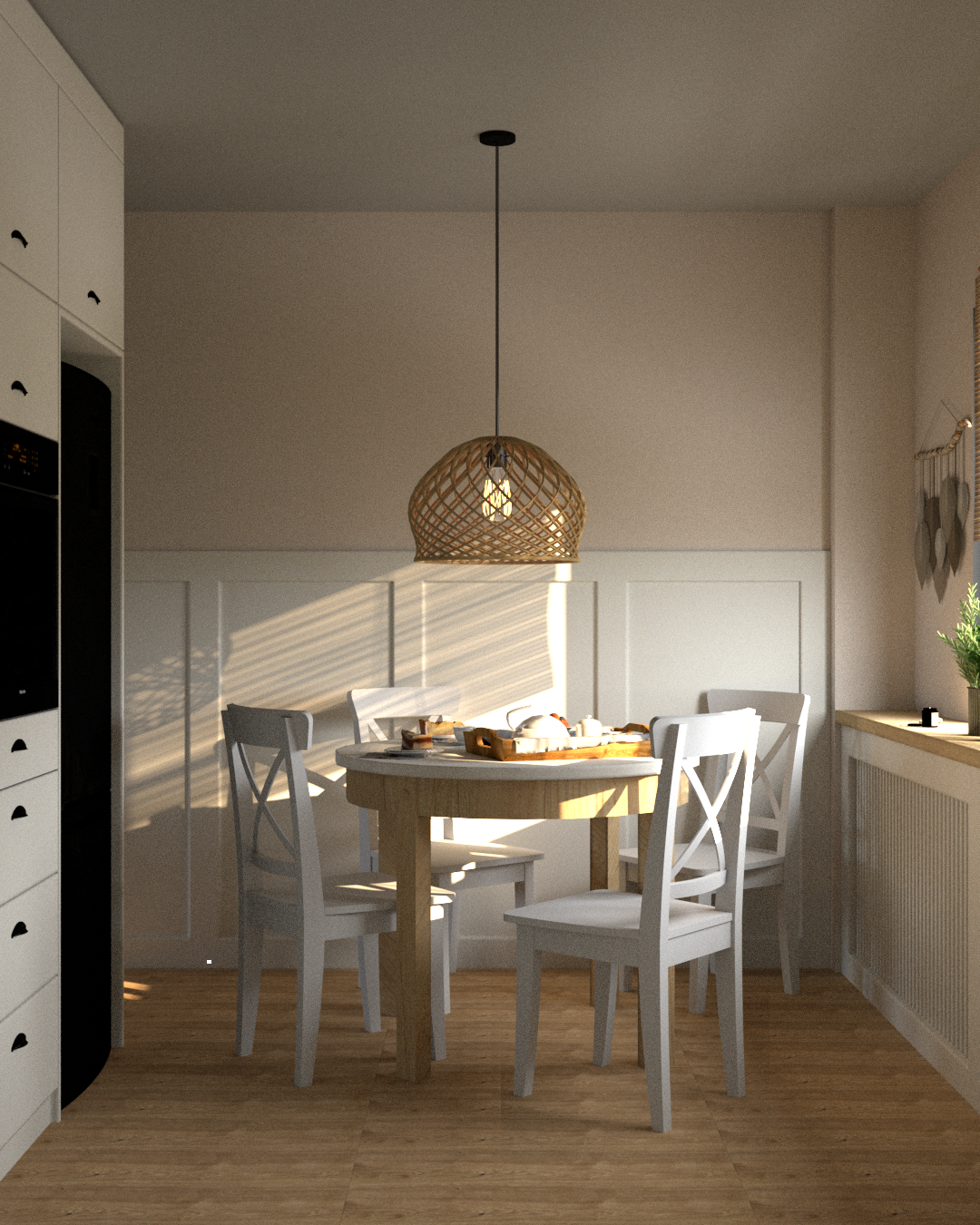 Miało być przestronnie i funkcjonalnie. Klimatyczna kuchnia o charakterze loftowym dla mężczyzny lubiącego dobre wino podczas gotowania, pasjonata rowerowych wycieczek górskich. Wysoka zabudowa z prostymi ciemnymi frontami, blat roboczy pod wiszącymi szafkami przedłużony barkiem odgradzającym kuchnię od części wypoczynkowej. Szafki bez uchwytów (system otwierania „klik-klak”). Elegancka kolorystyka nawiązująca do angielskich klubów. Kolor mebli współgrający z brązowo-szarymi deskami na podłodze oraz czarną cegłą na ścianie. Klimatyczne lampy na długich sznurach i designerski stołek barowy idealnie pasujące do surowego wnętrza.