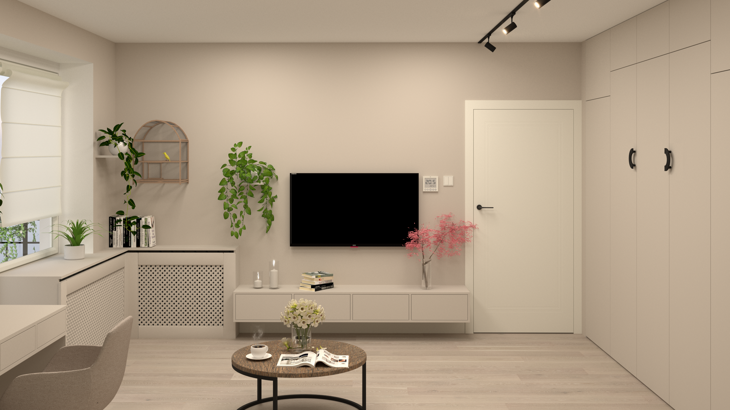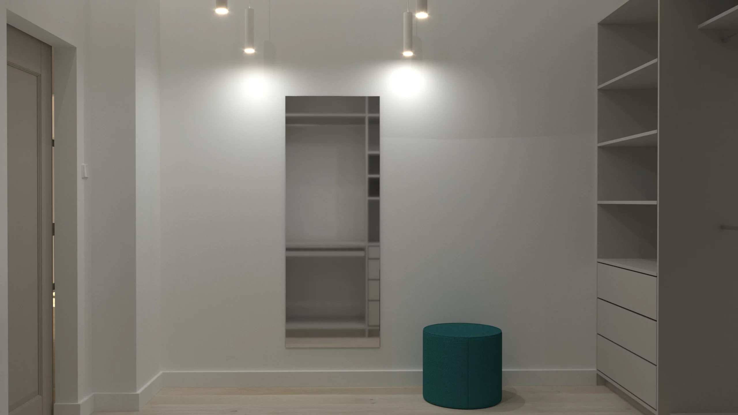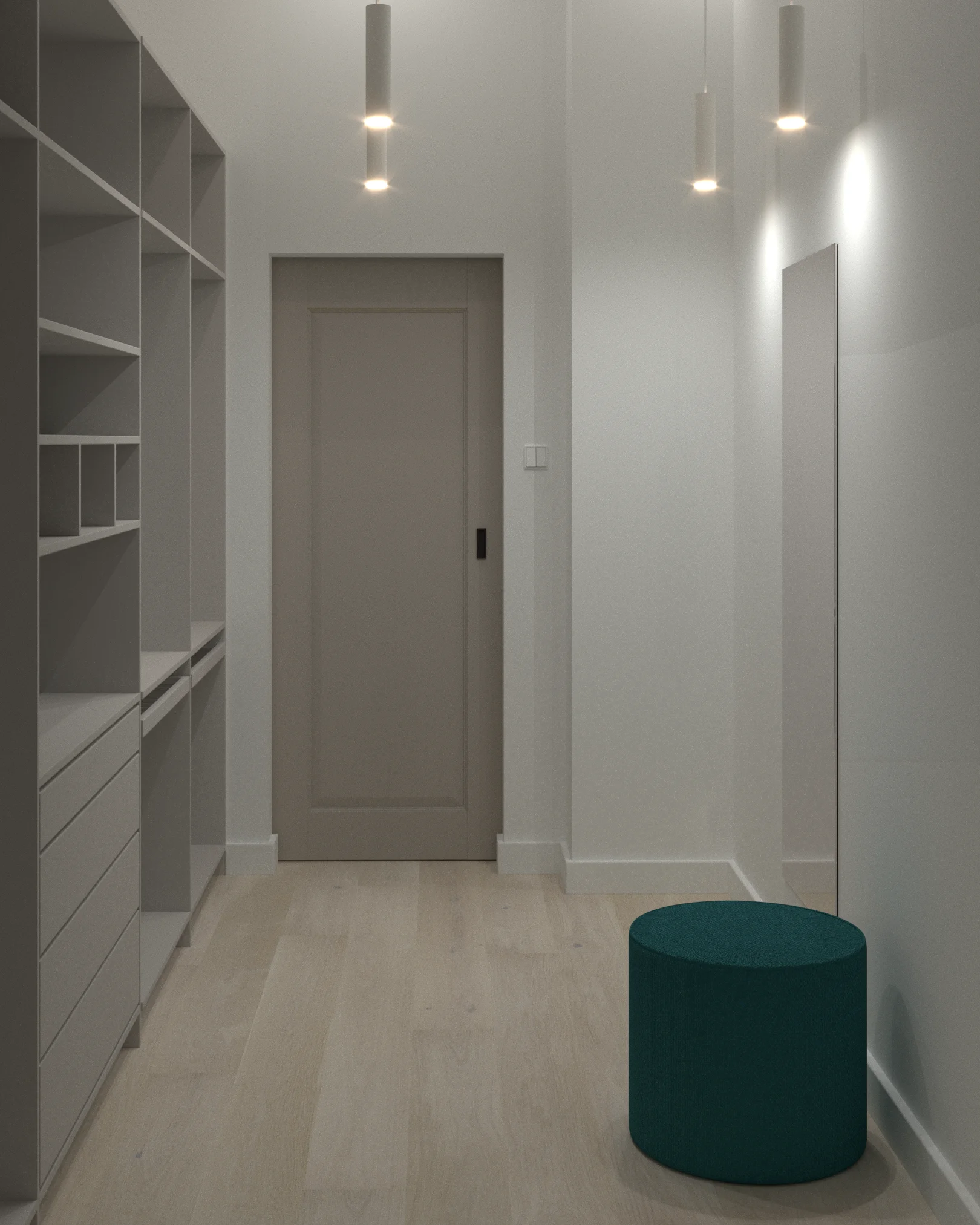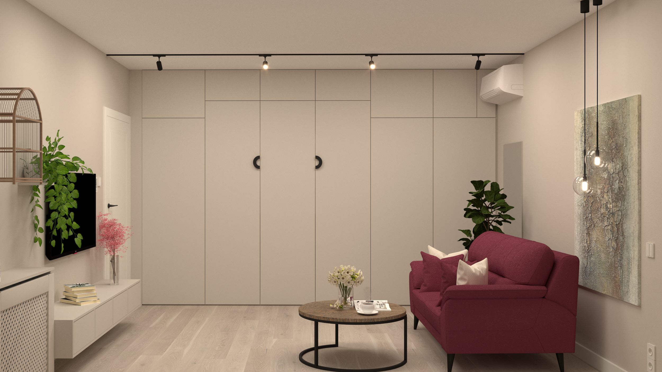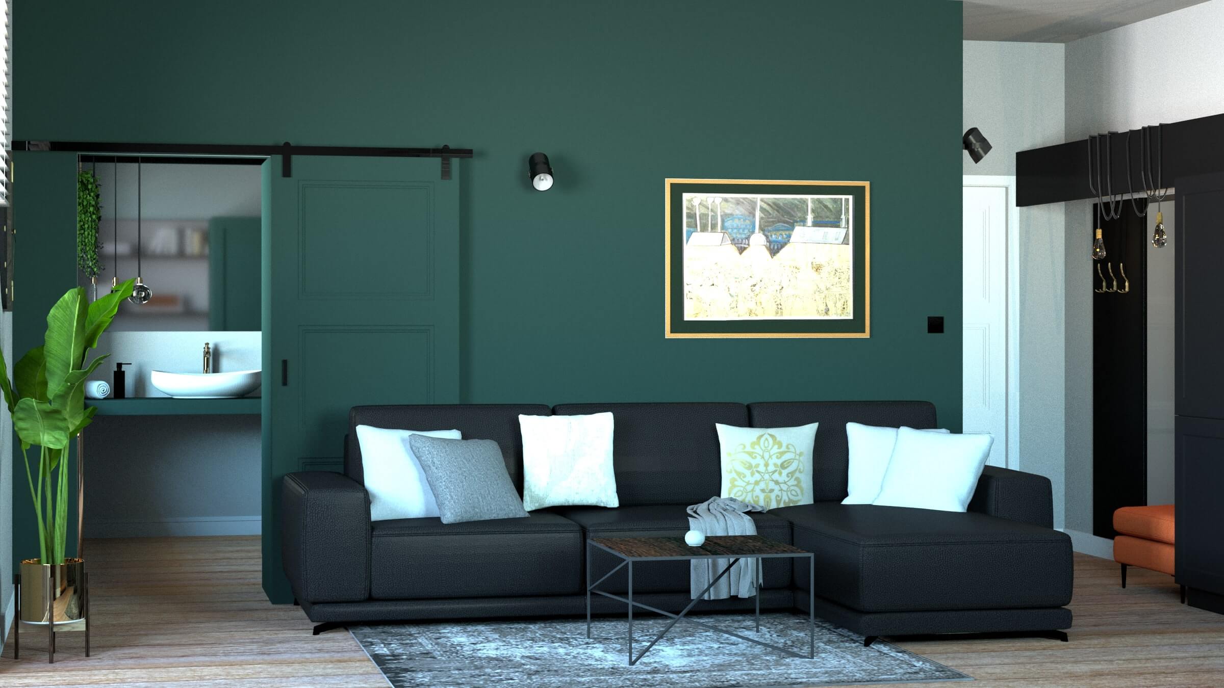 Mieszkanie w starym budownictwie 50 m2 dla mężczyzny, którego praca jest związana z częstymi wyjazdami. Mieszkanie o funkcji rekreacyjno-wypoczynkowej. Z czterech małych pomieszczeń zostały zaprojektowane dwa duże: salon z aneksem kuchennym oraz salon kąpielowy z garderobą, pralnią i pomieszczeniem gospodarczym. W powiększeniu łazienki przeszkadzały rury CO biegnące na jednej ze ścian działowych. Po wyburzeniu ścinki wyeksponowano je wymieniając na polerowane rury mosiężne. Było to też inspiracją do stworzenia pozostałej kolorystyki mieszkania – mosiądz pięknie komponuje się tutaj z zielenią oraz naturalnymi materiałami (drewnem i skórą), a także ze starą cegłą odsłoniętą na części murów . Pozostałe elementy są w klasycznej czerni, bieli i szarościach. „Kropeczką nad i” są białe drewniane żaluzje na oknach.