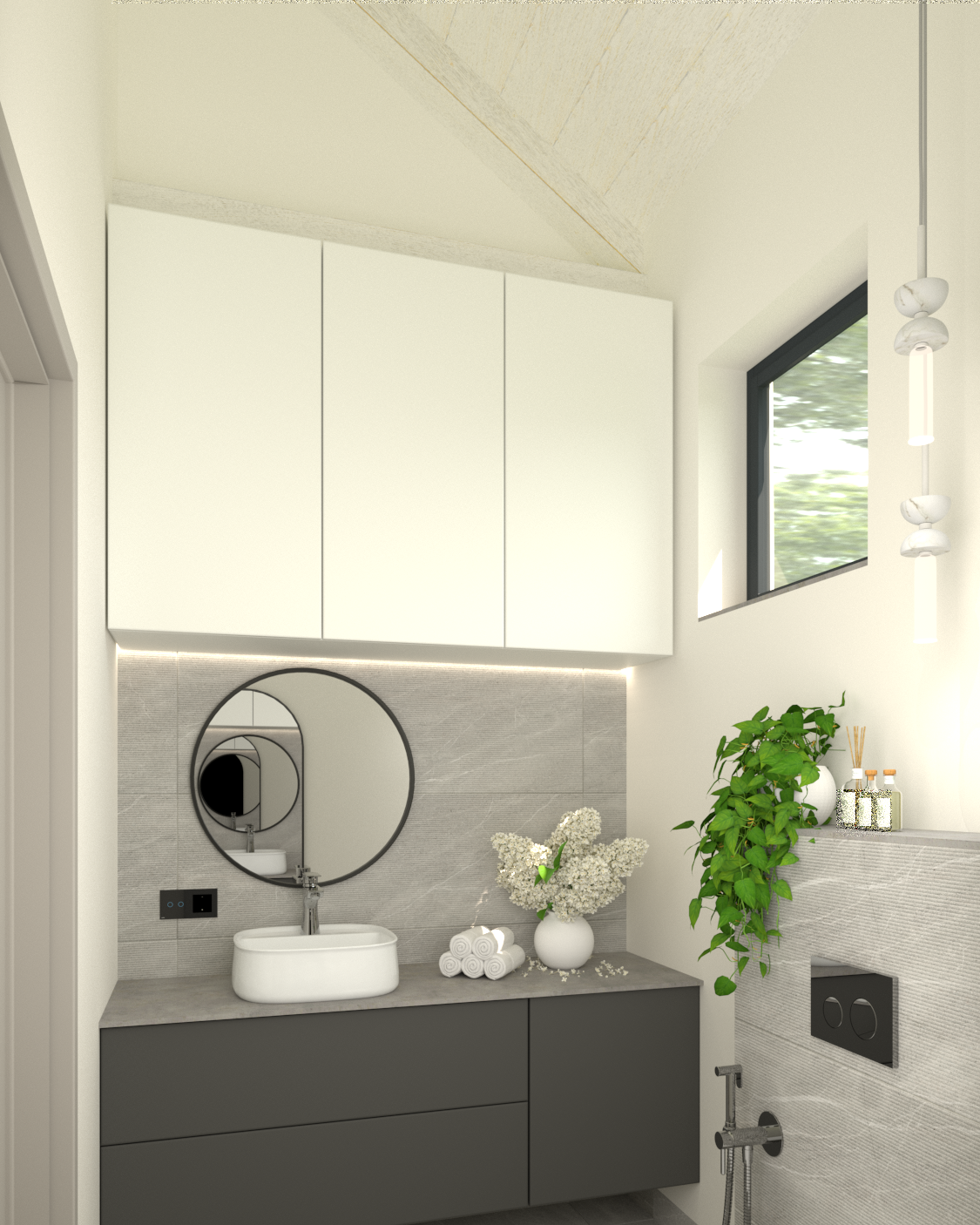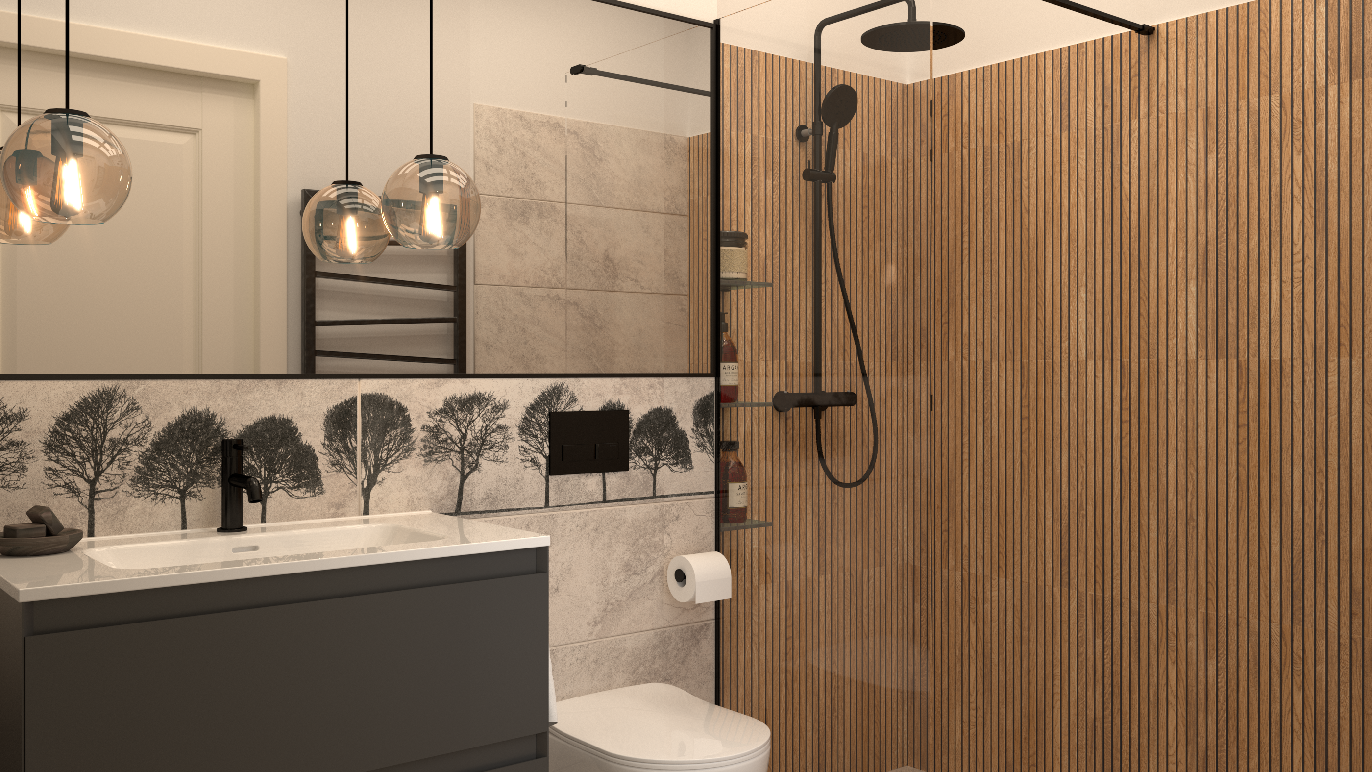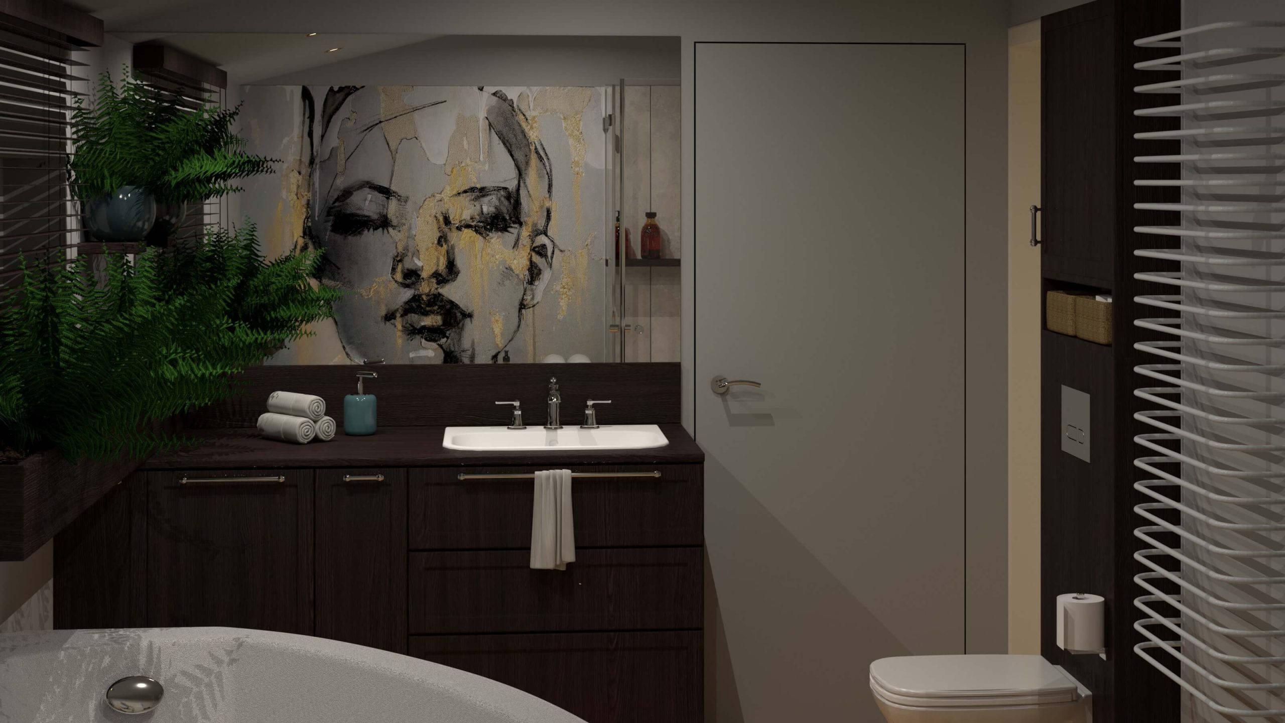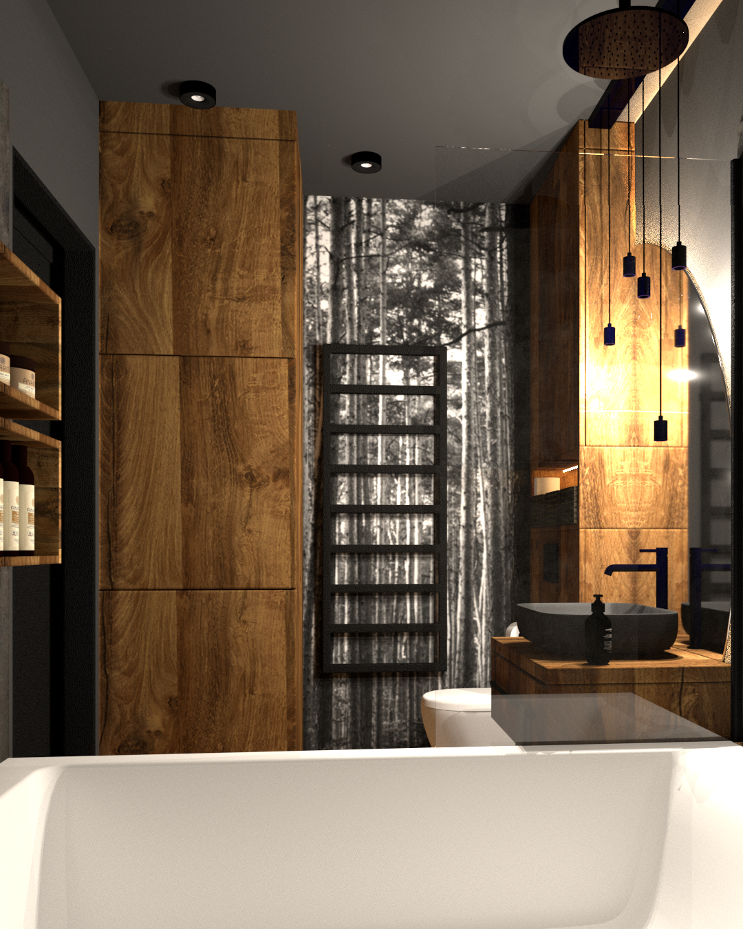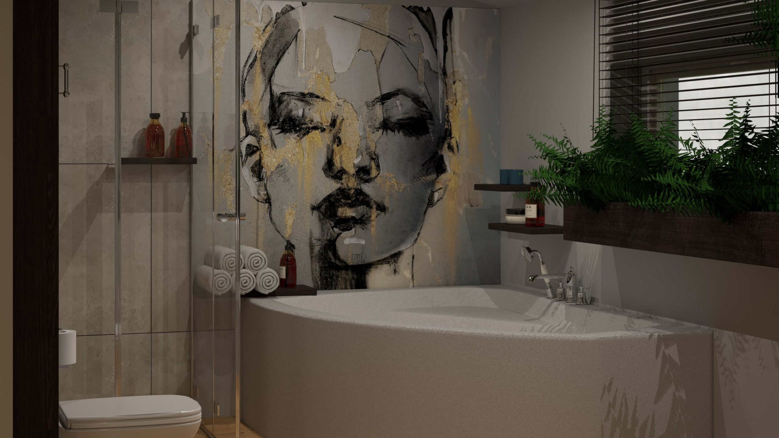 W projekcie wykorzystano grafiki polskiej artystki Mai Gajewskiej, których delikatność podkreśla charakter łazienki. Przesuwane drzwi w kolorze jasnego różu tworzą z grafikami idealną całość. Mocniejszym akcentem we wnętrzu jest soczysto-zielony preparowany chrobotek reniferowy na fragmencie ściany przy oknie. Różowa szklana mozaika otaczająca wnękę pod prysznicem nadaje temu miejscu niepowtarzalny charakter. Wnętrze ocieplają elementy z naturalnego drewna i podłoga z wysokiej jakości płytek gresowych o strukturze drewna.