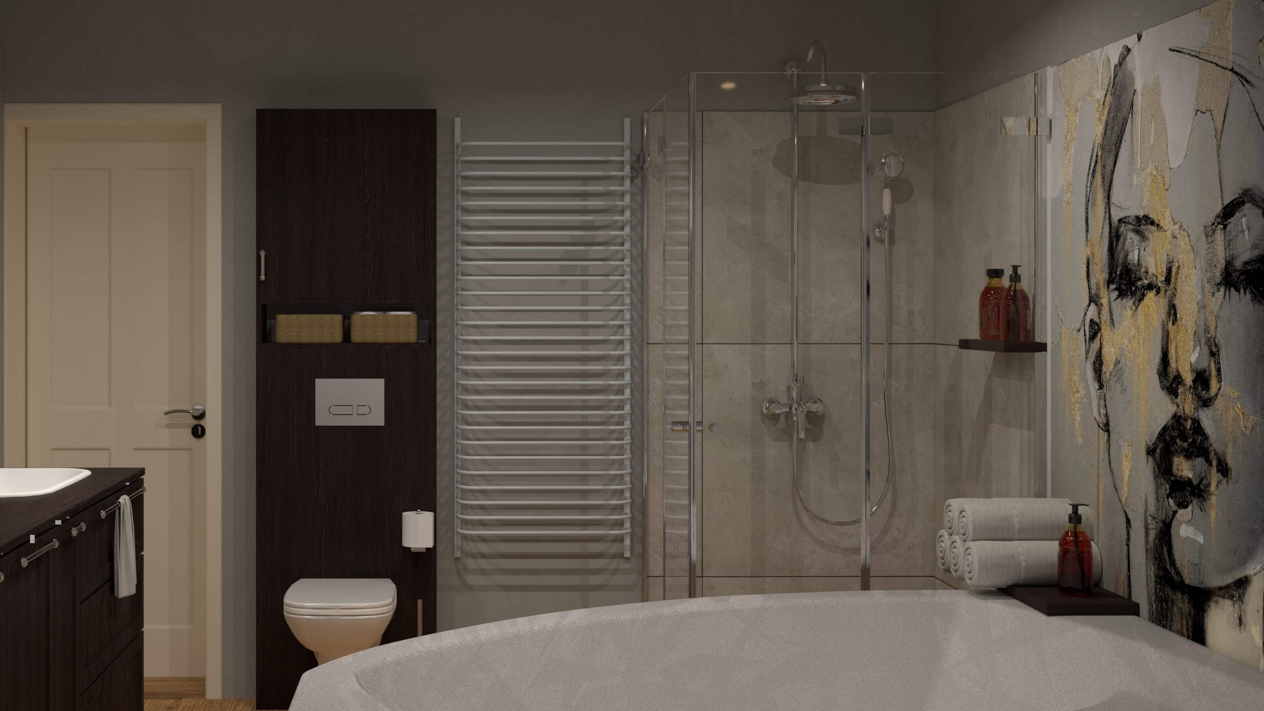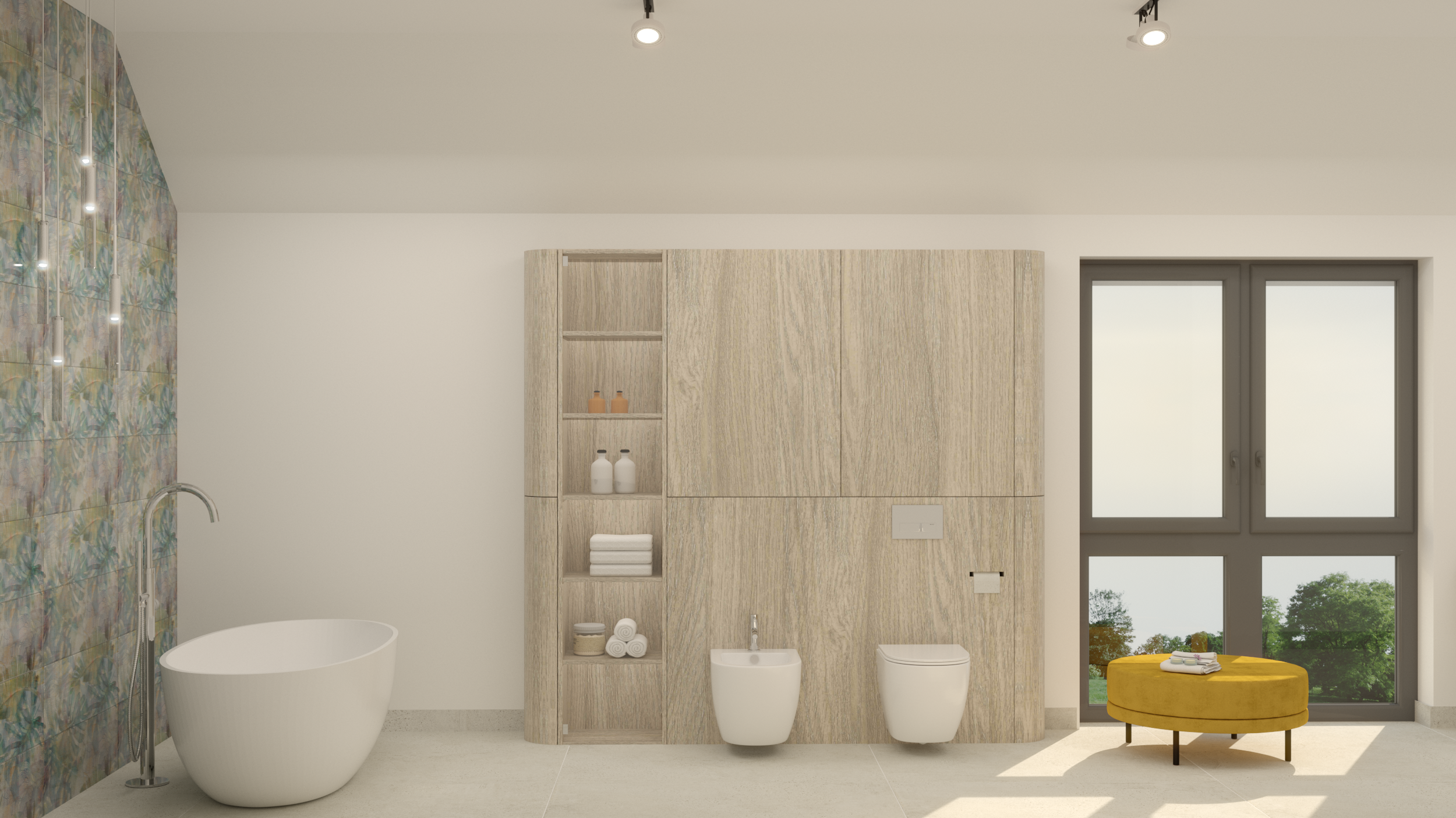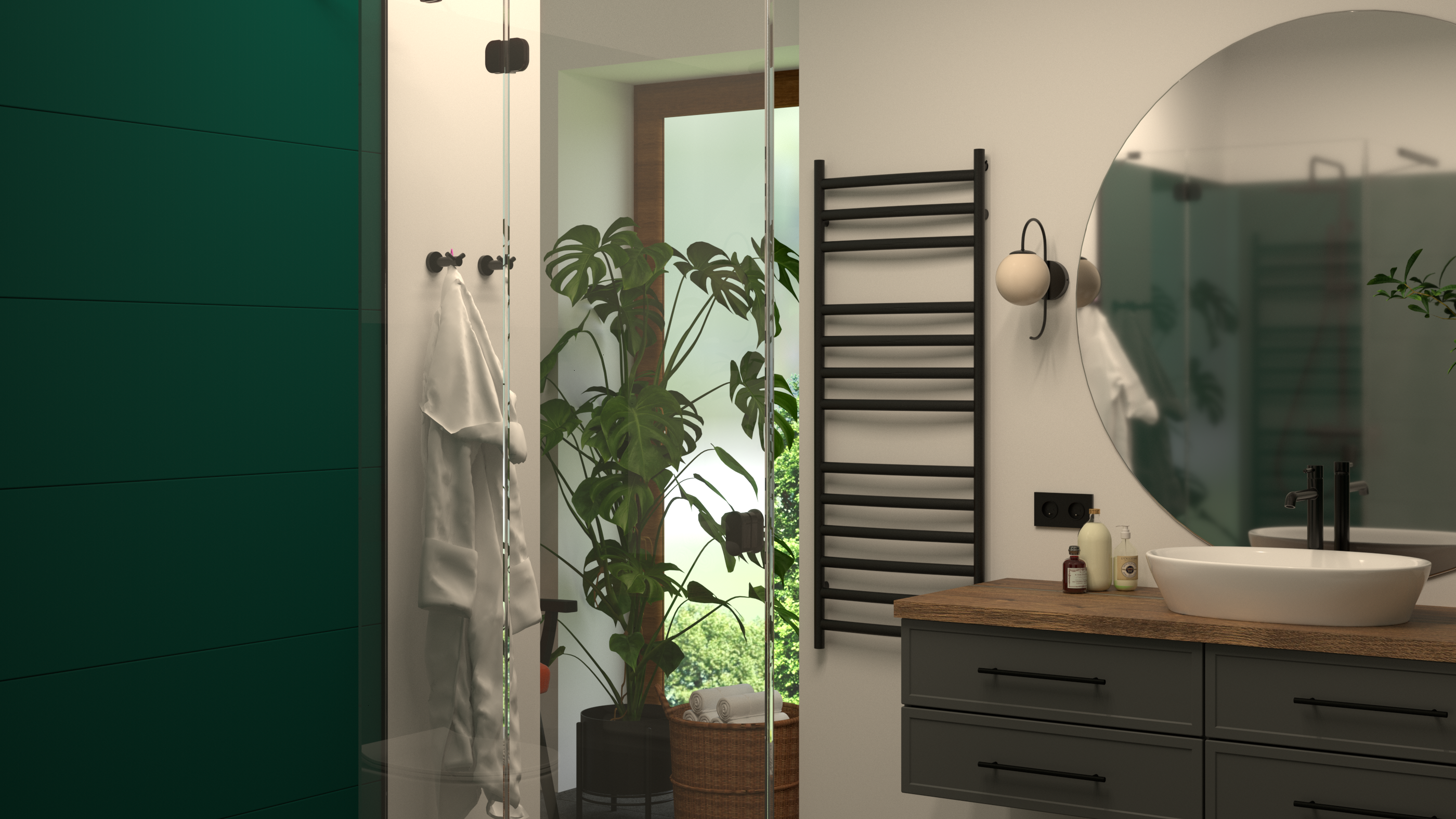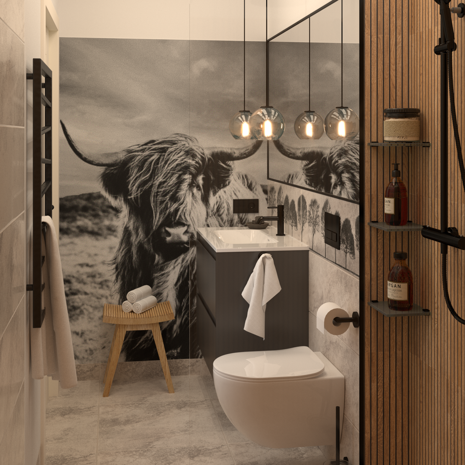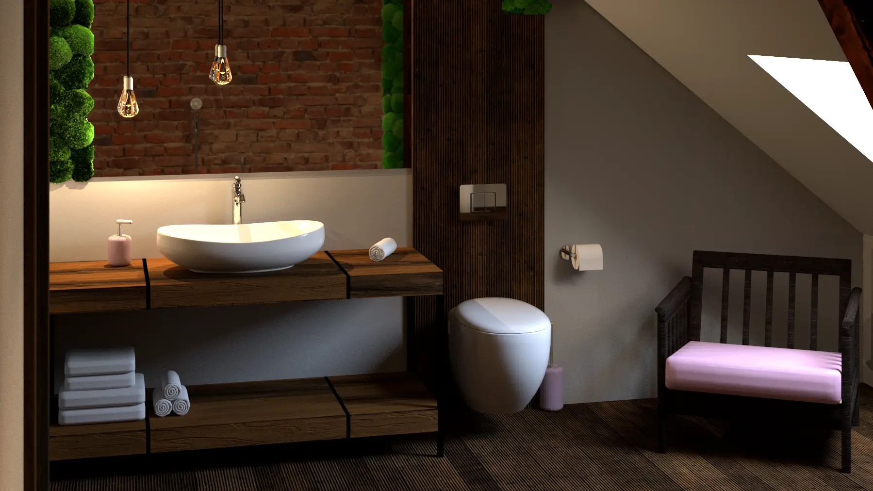 W projekcie wykorzystano grafiki polskiej artystki Mai Gajewskiej, których delikatność podkreśla charakter łazienki. Przesuwane drzwi w kolorze jasnego różu tworzą z grafikami idealną całość. Mocniejszym akcentem we wnętrzu jest soczysto-zielony preparowany chrobotek reniferowy na fragmencie ściany przy oknie. Różowa szklana mozaika otaczająca wnękę pod prysznicem nadaje temu miejscu niepowtarzalny charakter. Wnętrze ocieplają elementy z naturalnego drewna i podłoga z wysokiej jakości płytek gresowych o strukturze drewna.