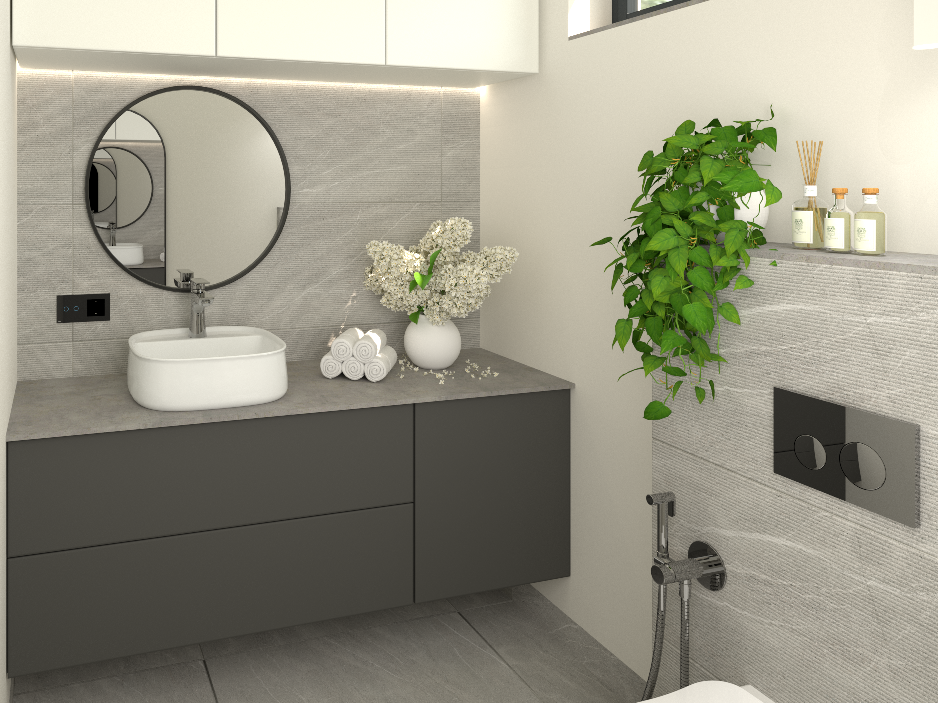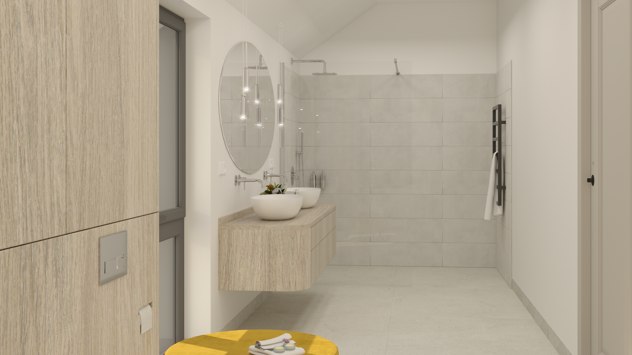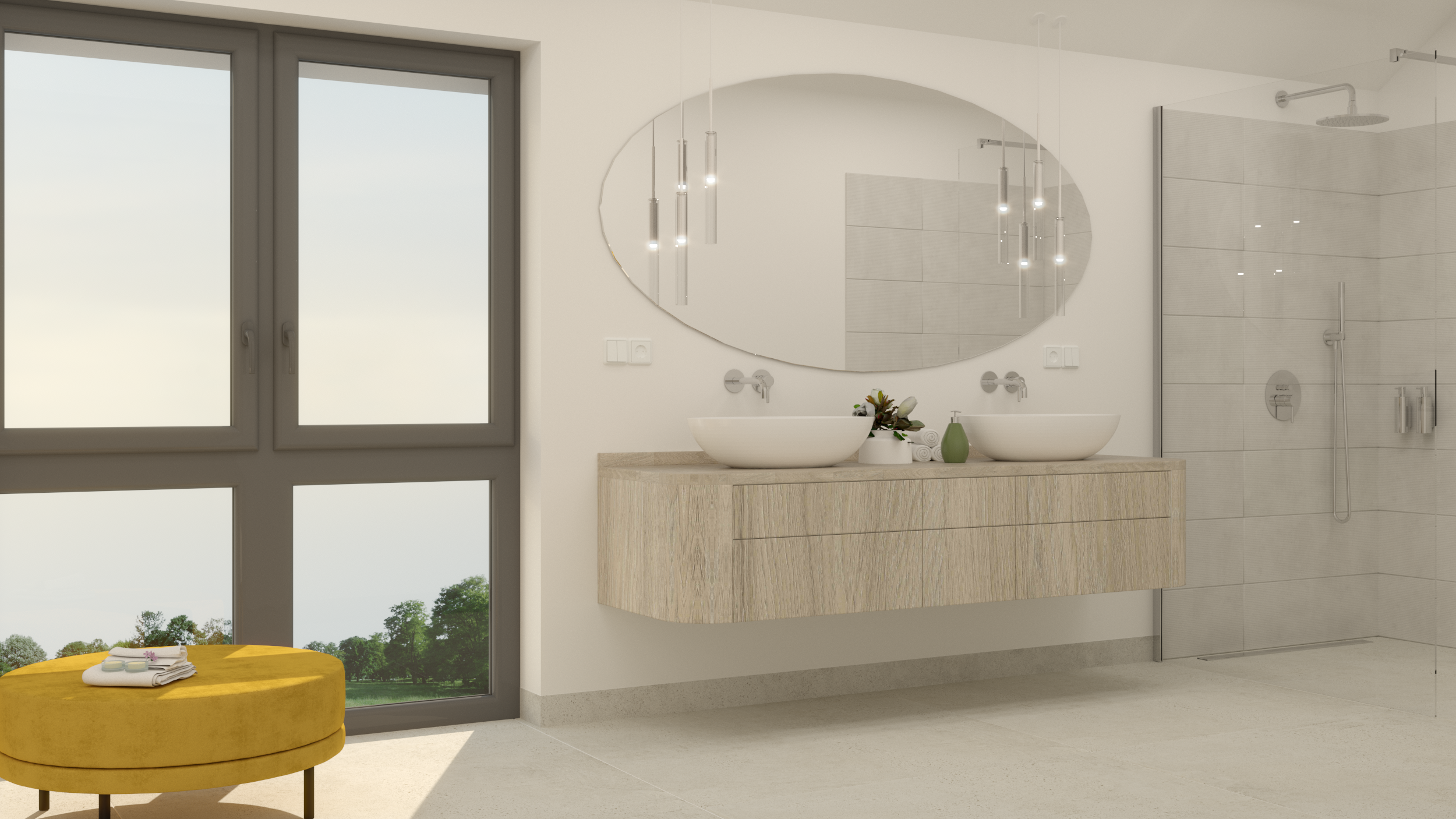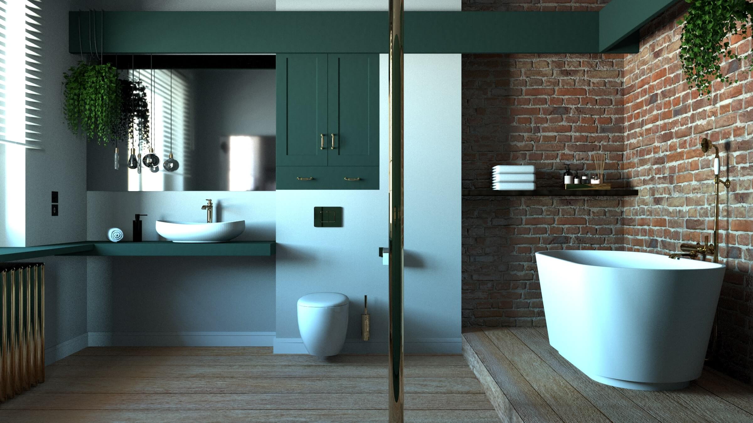 W projekcie wykorzystano grafiki polskiej artystki Mai Gajewskiej, których delikatność podkreśla charakter łazienki. Przesuwane drzwi w kolorze jasnego różu tworzą z grafikami idealną całość. Mocniejszym akcentem we wnętrzu jest soczysto-zielony preparowany chrobotek reniferowy na fragmencie ściany przy oknie. Różowa szklana mozaika otaczająca wnękę pod prysznicem nadaje temu miejscu niepowtarzalny charakter. Wnętrze ocieplają elementy z naturalnego drewna i podłoga z wysokiej jakości płytek gresowych o strukturze drewna.