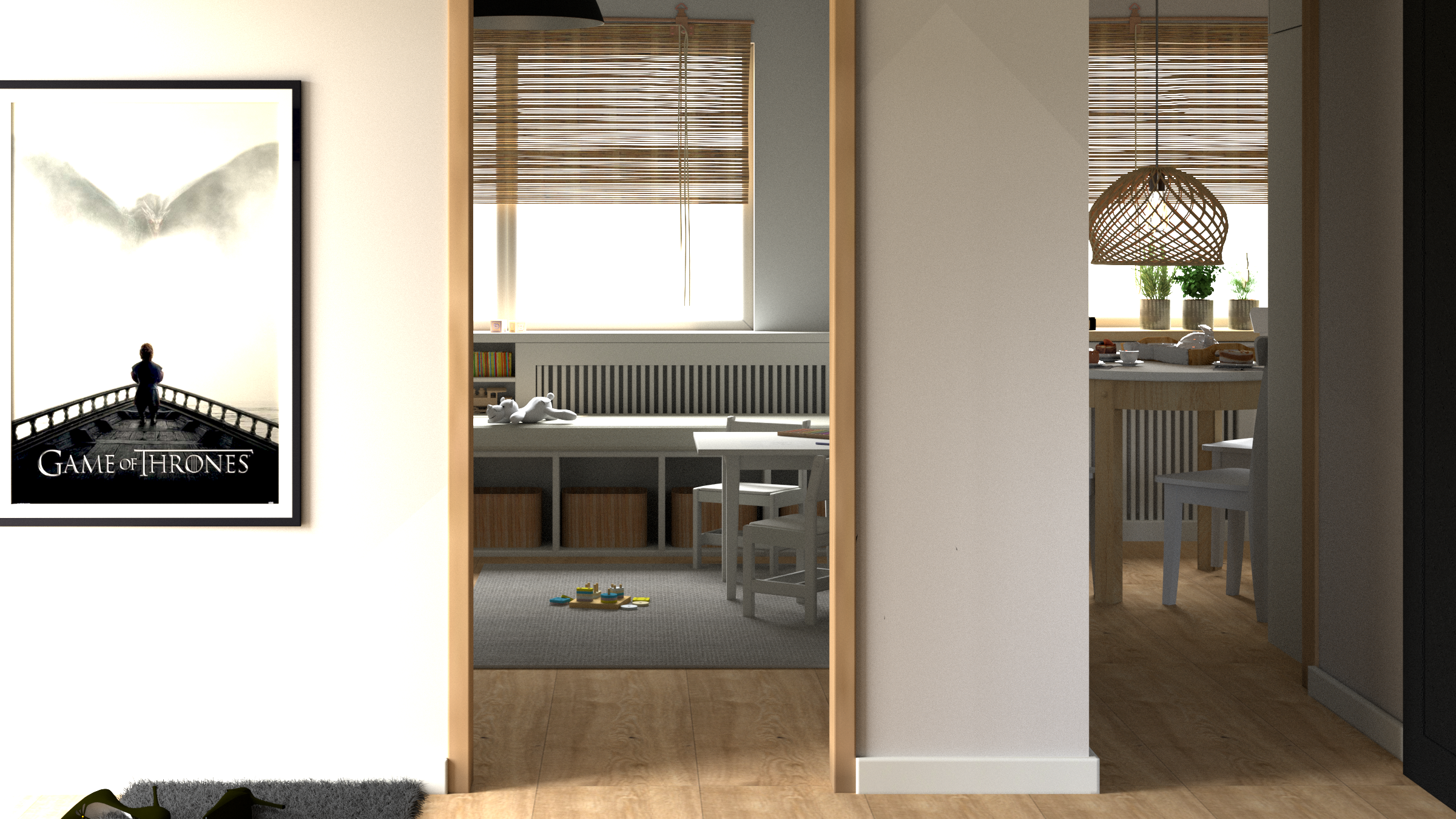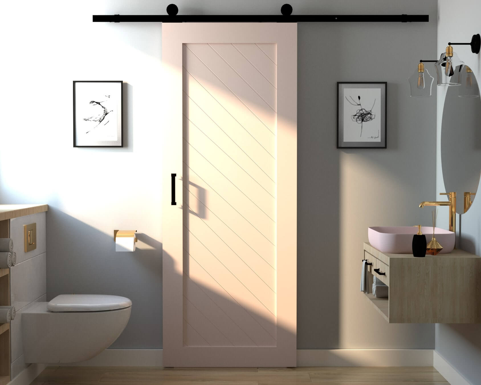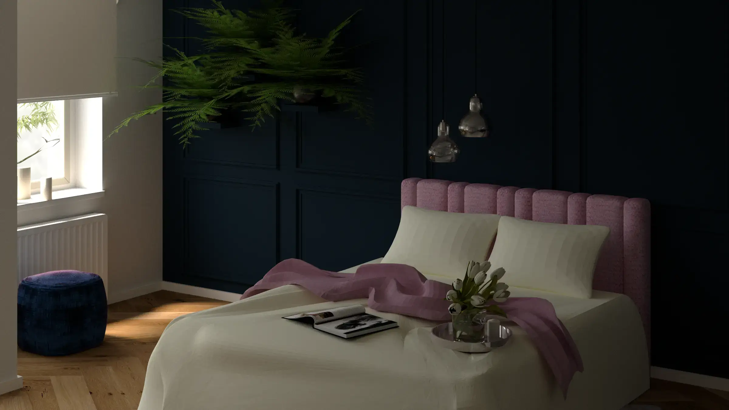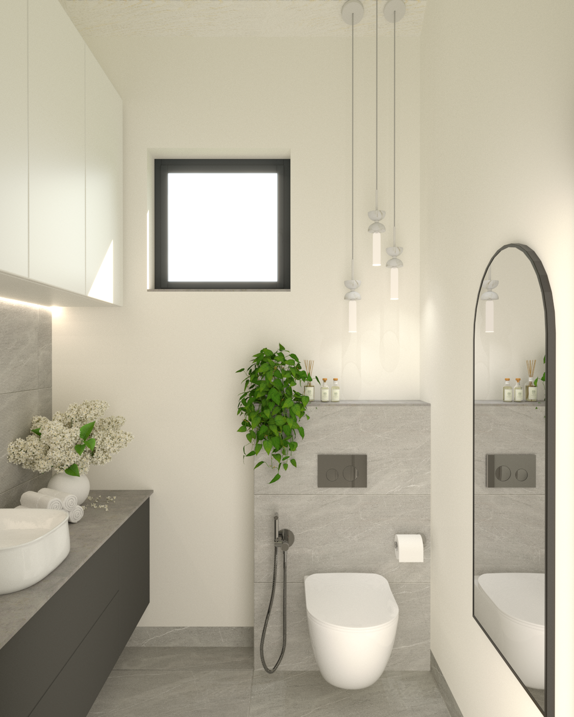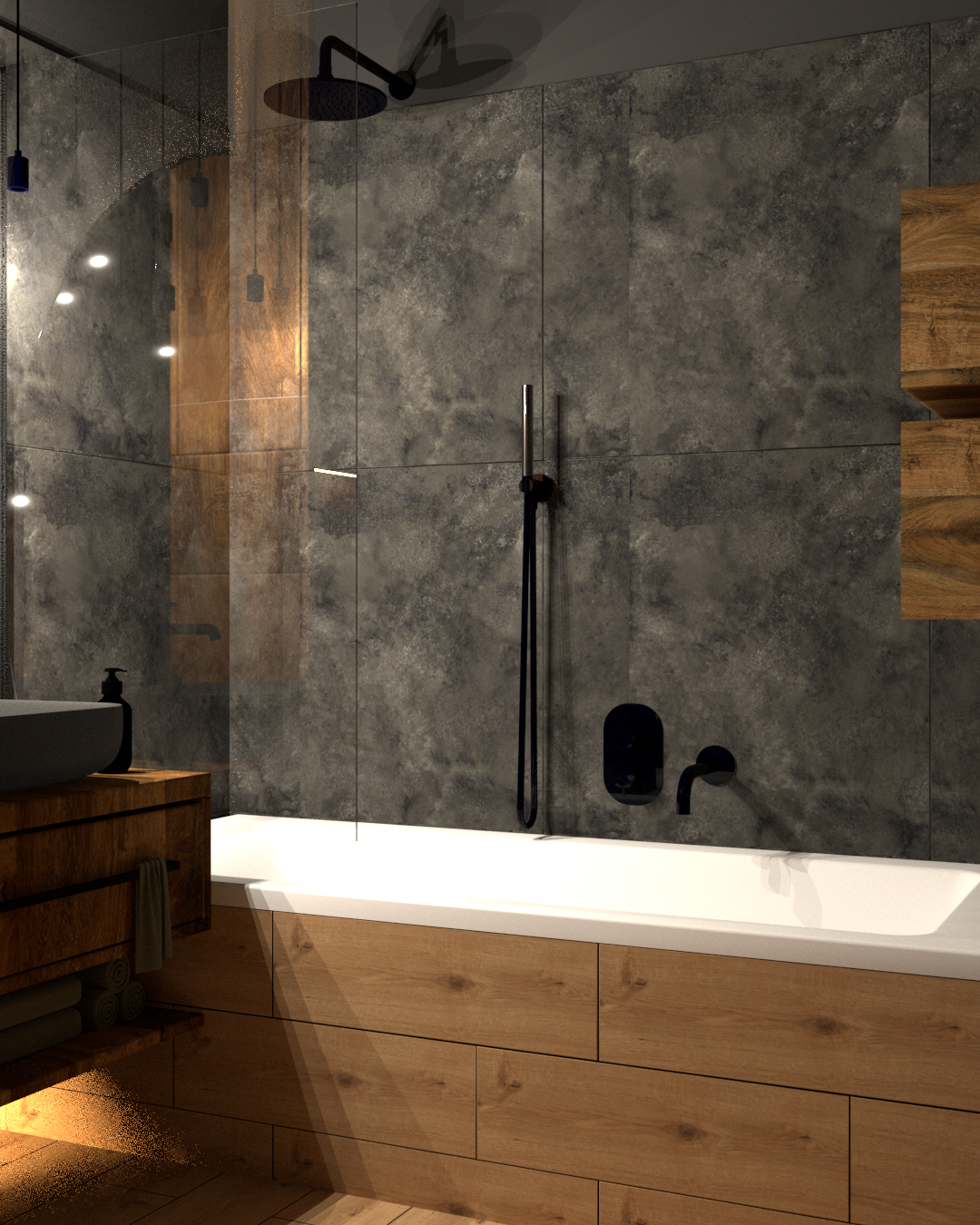 W projekcie wykorzystano grafiki polskiej artystki Mai Gajewskiej, których delikatność podkreśla charakter łazienki. Przesuwane drzwi w kolorze jasnego różu tworzą z grafikami idealną całość. Mocniejszym akcentem we wnętrzu jest soczysto-zielony preparowany chrobotek reniferowy na fragmencie ściany przy oknie. Różowa szklana mozaika otaczająca wnękę pod prysznicem nadaje temu miejscu niepowtarzalny charakter. Wnętrze ocieplają elementy z naturalnego drewna i podłoga z wysokiej jakości płytek gresowych o strukturze drewna.
