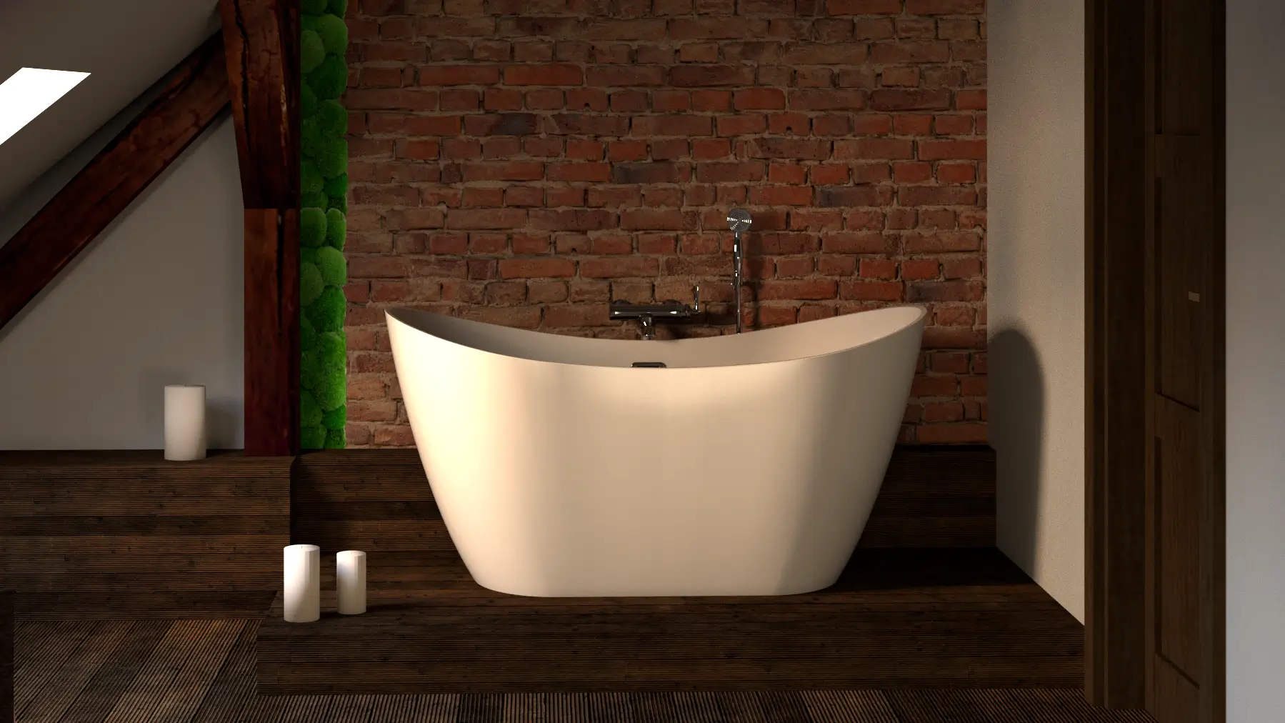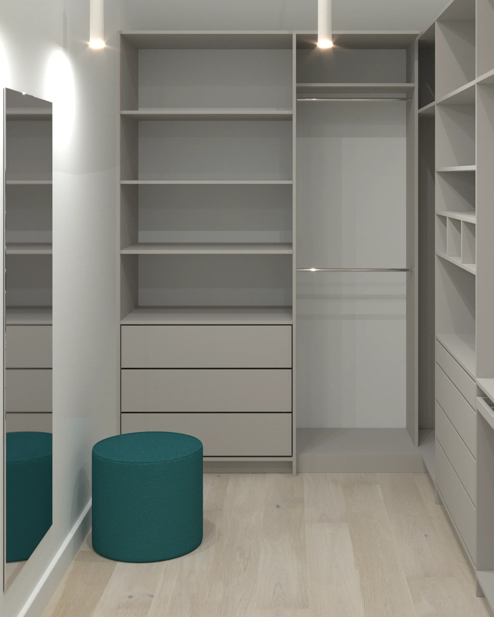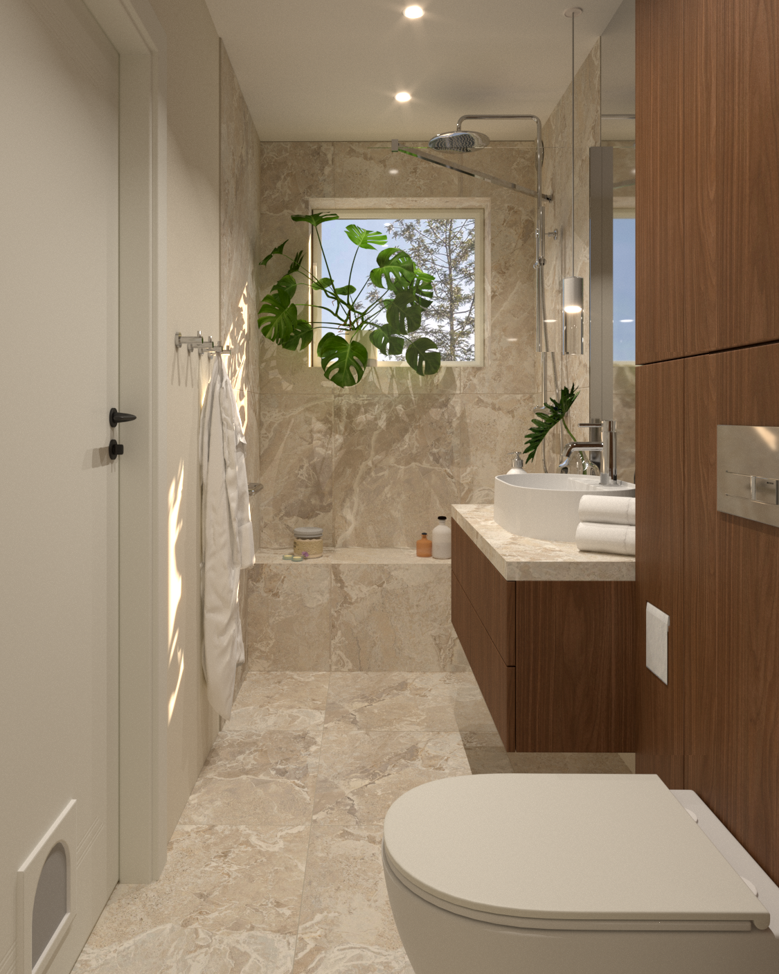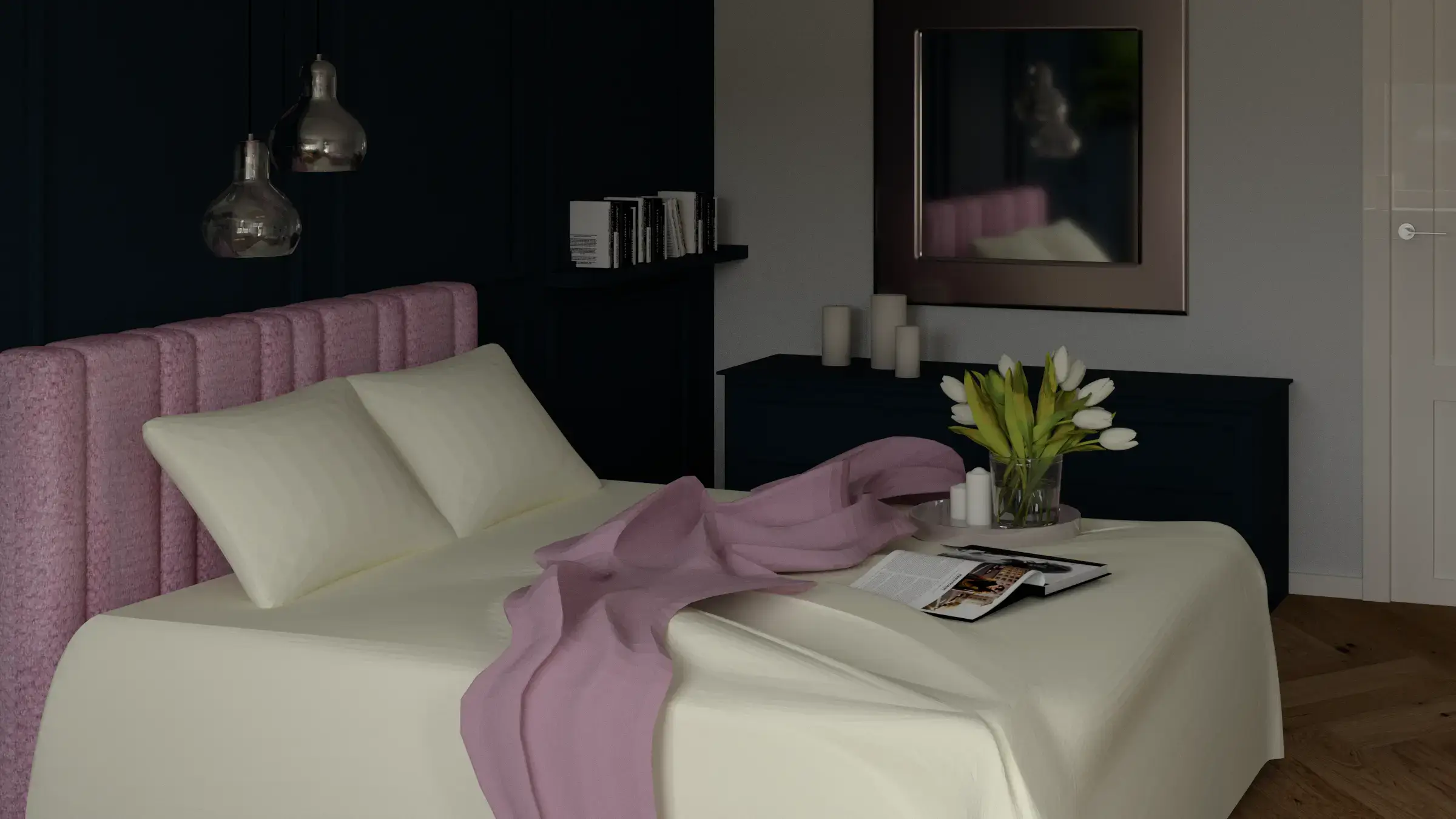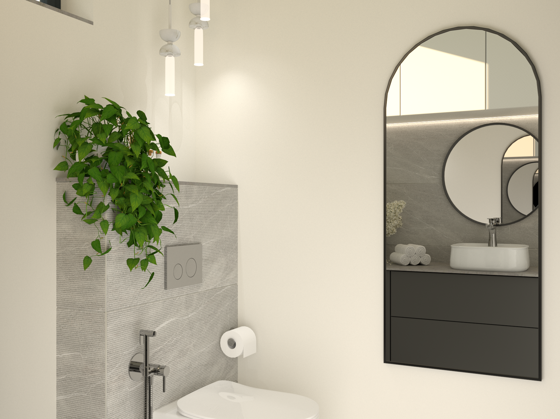 W projekcie wykorzystano grafiki polskiej artystki Mai Gajewskiej, których delikatność podkreśla charakter łazienki. Przesuwane drzwi w kolorze jasnego różu tworzą z grafikami idealną całość. Mocniejszym akcentem we wnętrzu jest soczysto-zielony preparowany chrobotek reniferowy na fragmencie ściany przy oknie. Różowa szklana mozaika otaczająca wnękę pod prysznicem nadaje temu miejscu niepowtarzalny charakter. Wnętrze ocieplają elementy z naturalnego drewna i podłoga z wysokiej jakości płytek gresowych o strukturze drewna.