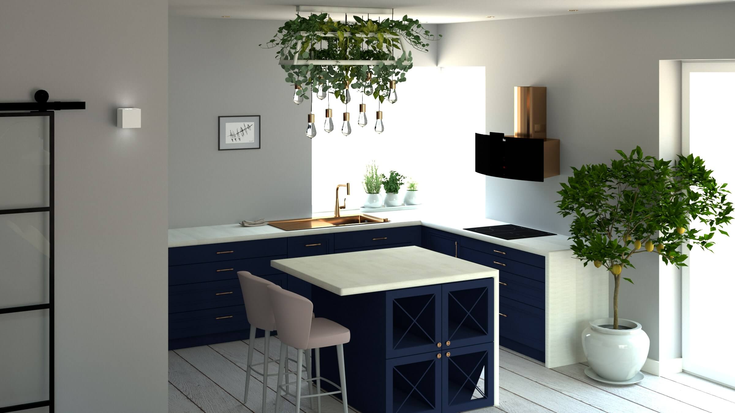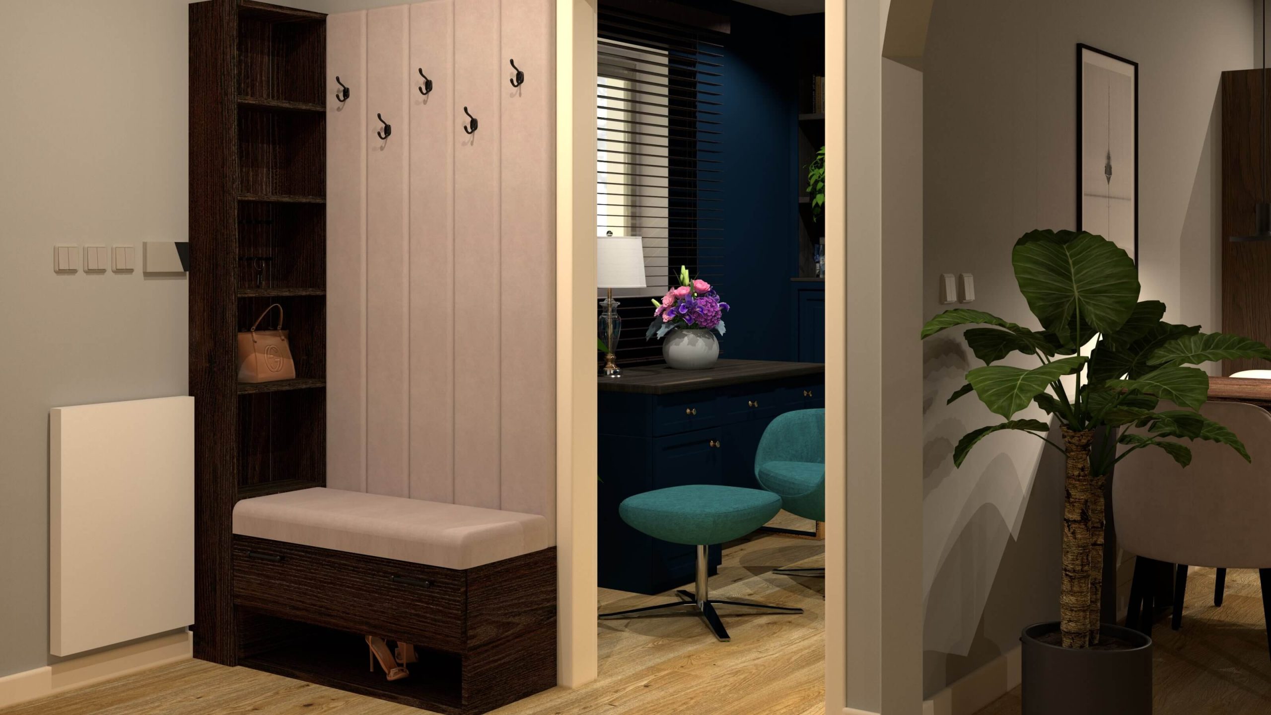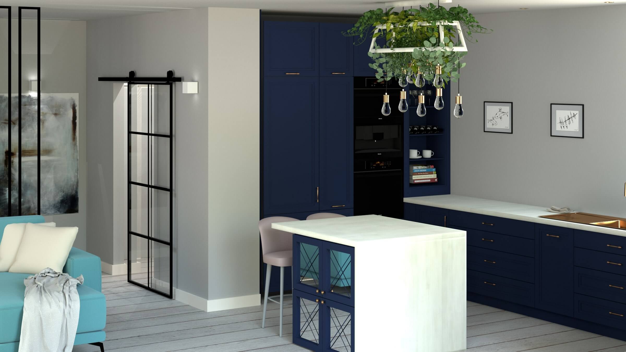 Elegancka aranżacja z elementami loftowymi obejmowała salon z aneksem kuchennym i wiatrołap. Kolorystyka kuchni nawiązuje do barw marynarki wojennej – fronty w kolorze navy blue, blaty i podłoga z bielonego drewna, mosiężna armatura, zlewozmywak i uchwyty. Z barwami kuchni pięknie współgrają czarne elementy w pozostałej części mieszkania – balustrada na schodach i szklane drzwi do przedpokoju w metalowych czarnych ramach. Hokery z różową tapicerką oraz pastelowe tkaniny w salonie dodają wnętrzu lekkości, a rośliny tworzą przytulny klimat. Na ścianach wiszą grafiki oraz obraz olejny polskiej artystki Mai Gajewskiej. Całość dopełnia czarno-biały plakat w salonie, który łączy dwa style.