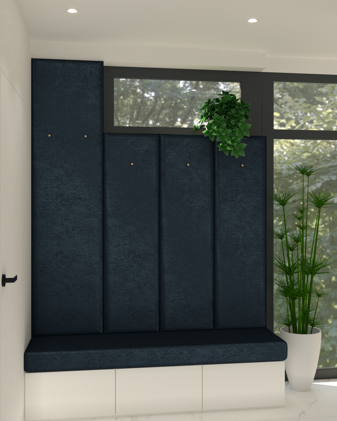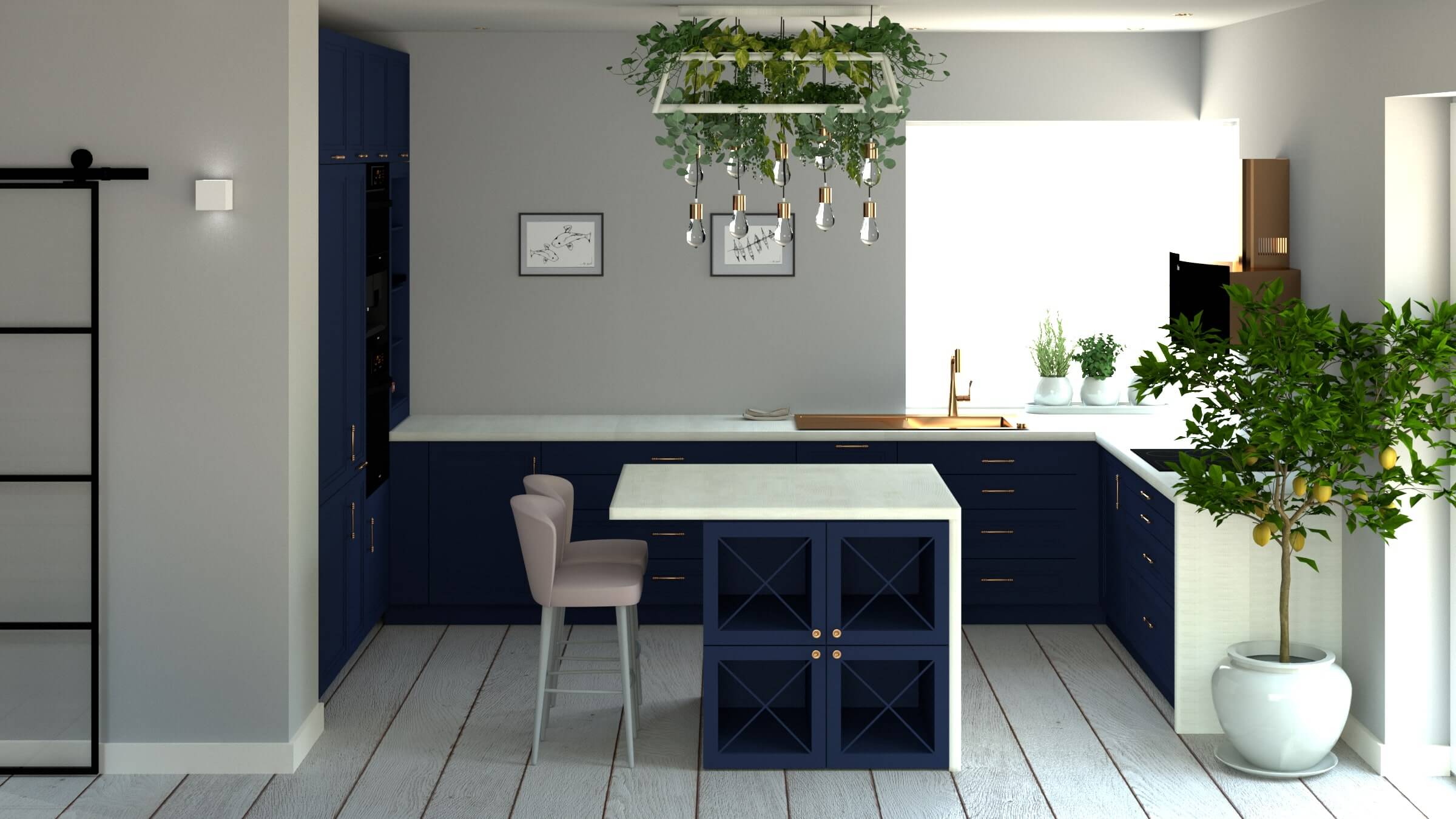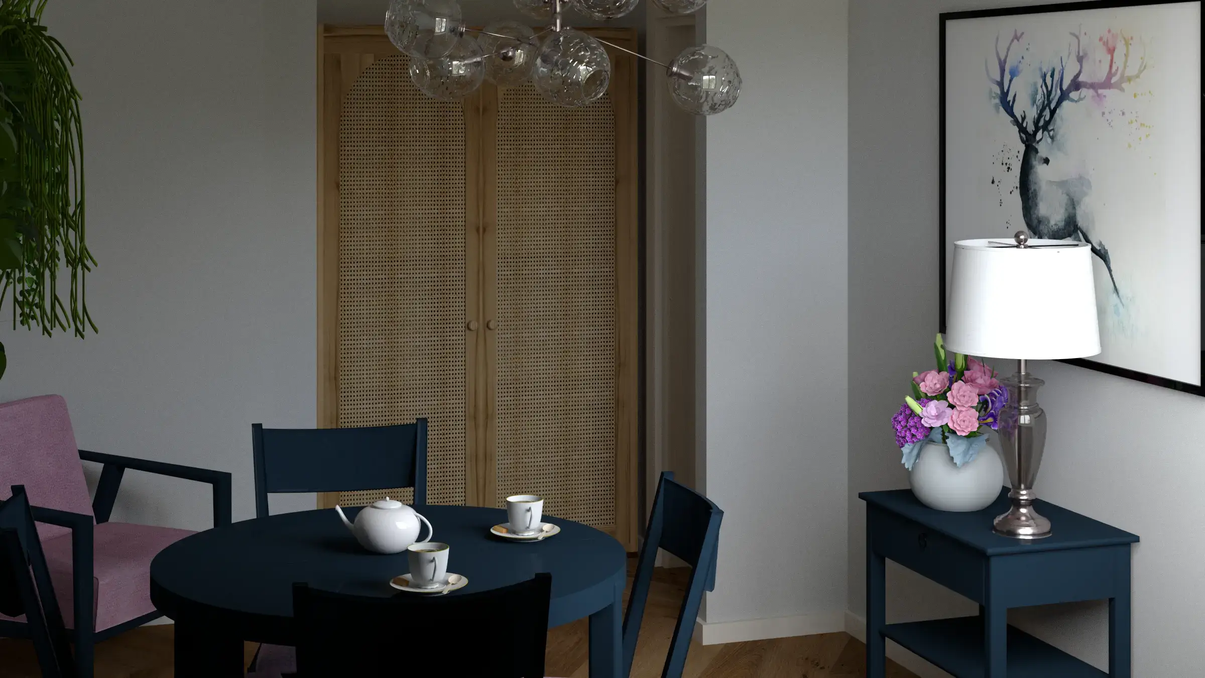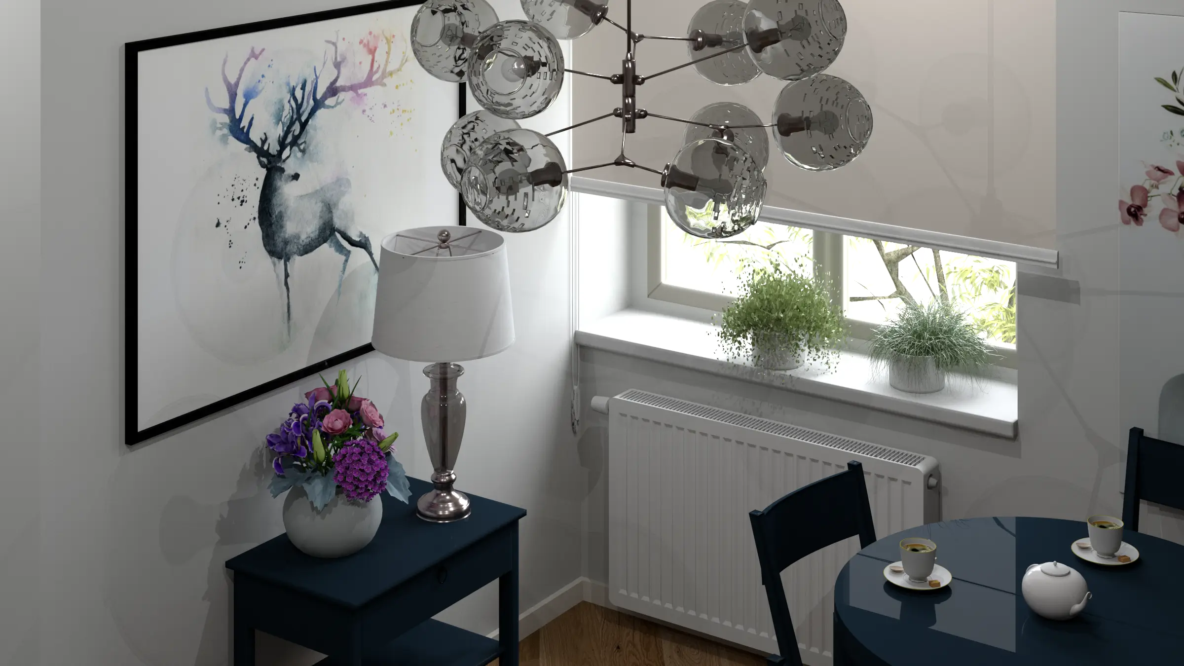 Elegancka aranżacja z elementami loftowymi obejmowała salon z aneksem kuchennym i wiatrołap. Kolorystyka kuchni nawiązuje do barw marynarki wojennej – fronty w kolorze navy blue, blaty i podłoga z bielonego drewna, mosiężna armatura, zlewozmywak i uchwyty. Z barwami kuchni pięknie współgrają czarne elementy w pozostałej części mieszkania – balustrada na schodach i szklane drzwi do przedpokoju w metalowych czarnych ramach. Hokery z różową tapicerką oraz pastelowe tkaniny w salonie dodają wnętrzu lekkości, a rośliny tworzą przytulny klimat. Na ścianach wiszą grafiki oraz obraz olejny polskiej artystki Mai Gajewskiej. Całość dopełnia czarno-biały plakat w salonie, który łączy dwa style.