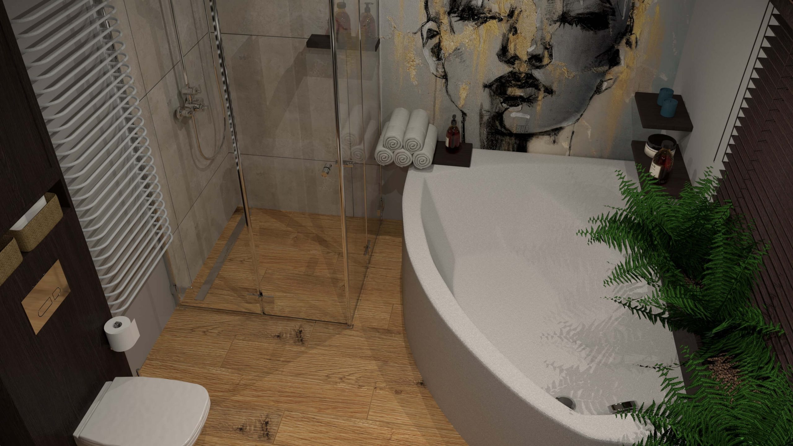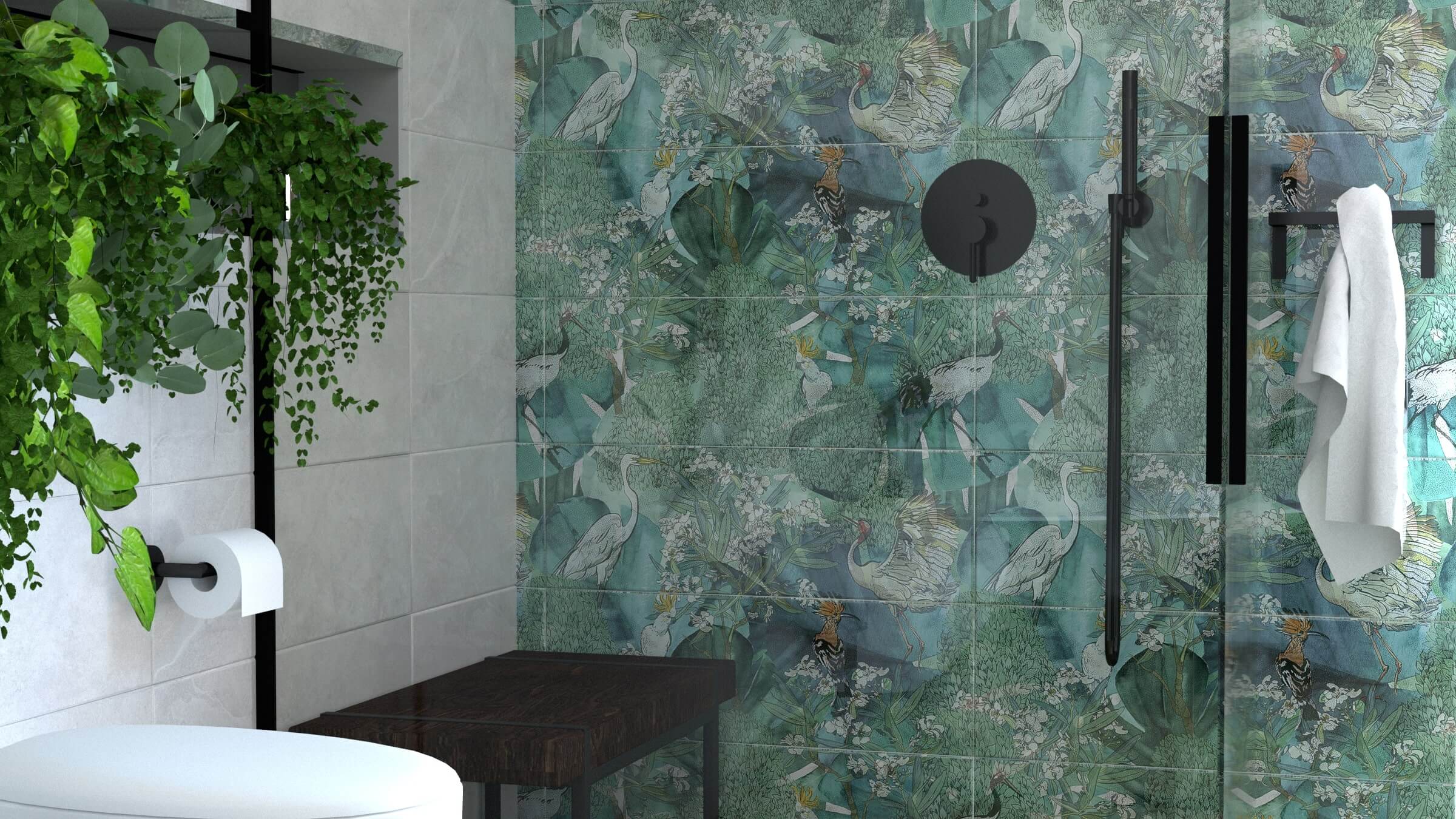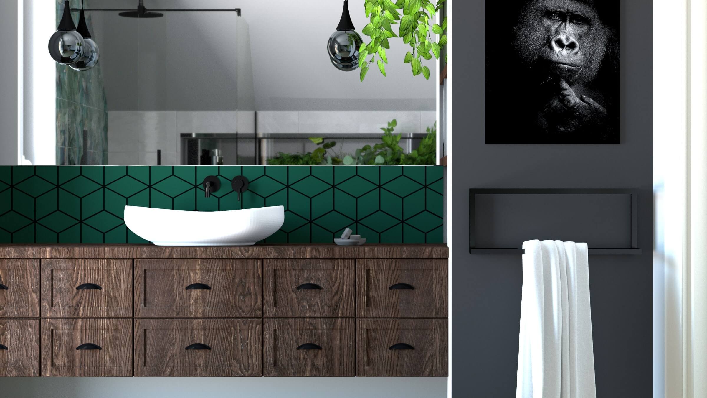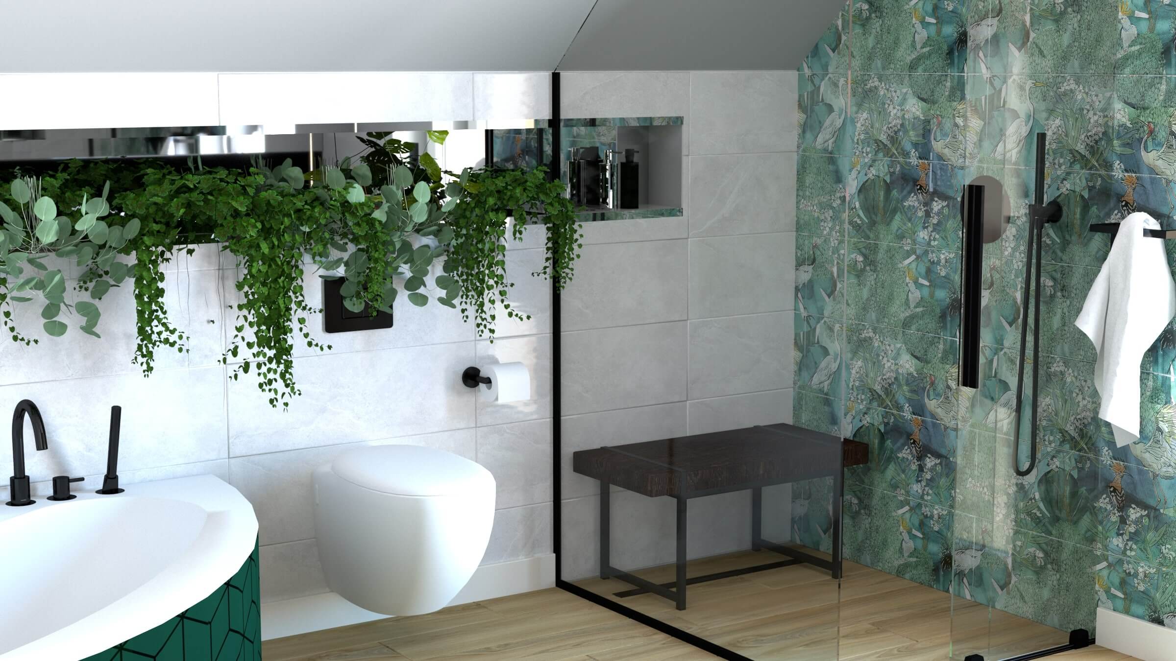 Łazienka 10 m2. W łazience miała się znaleźć wanna narożna i kabina prysznicowa. Elementy drewniane, kwiaty i dekor botaniczny nawiązują do natury. Pojemna szafka pod umywalką z wbudowanym koszem na pranie, siedzisko pod prysznicem i półki we wnęce pełnią funkcję praktyczną. Wanna narożna została obudowana płytkami w kolorze szmaragdowego lasu. Wizerunek goryla nawiązuje do dekoru z motywem dżungli i podkreśla charakter wnętrza.