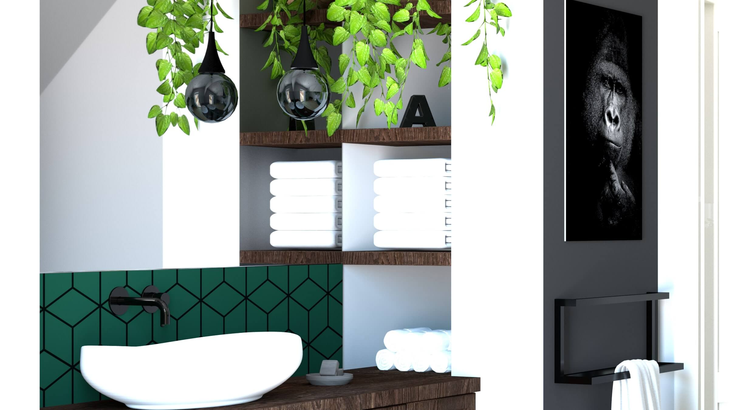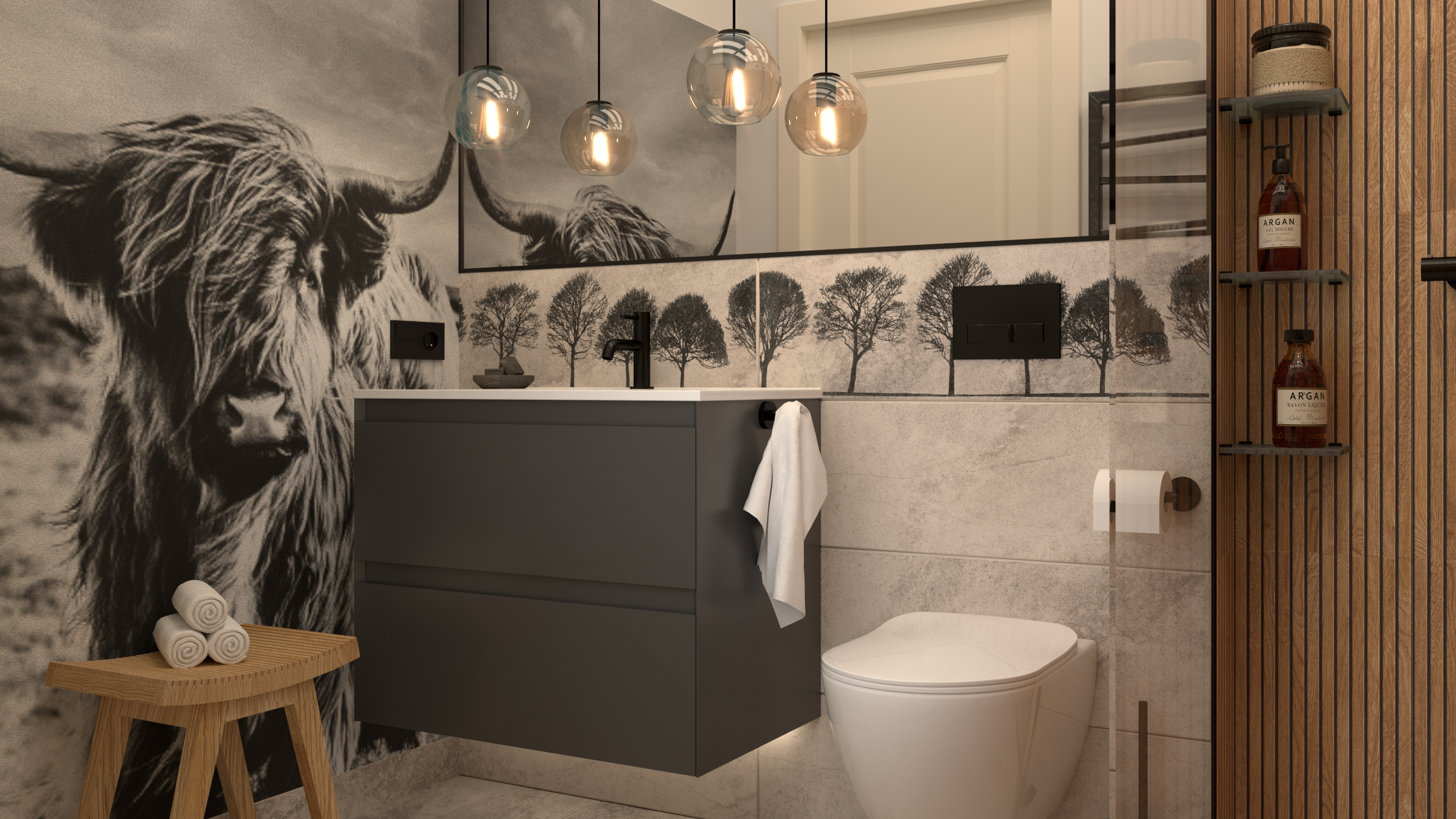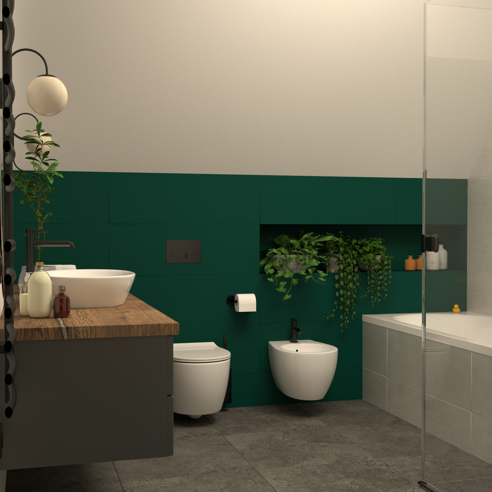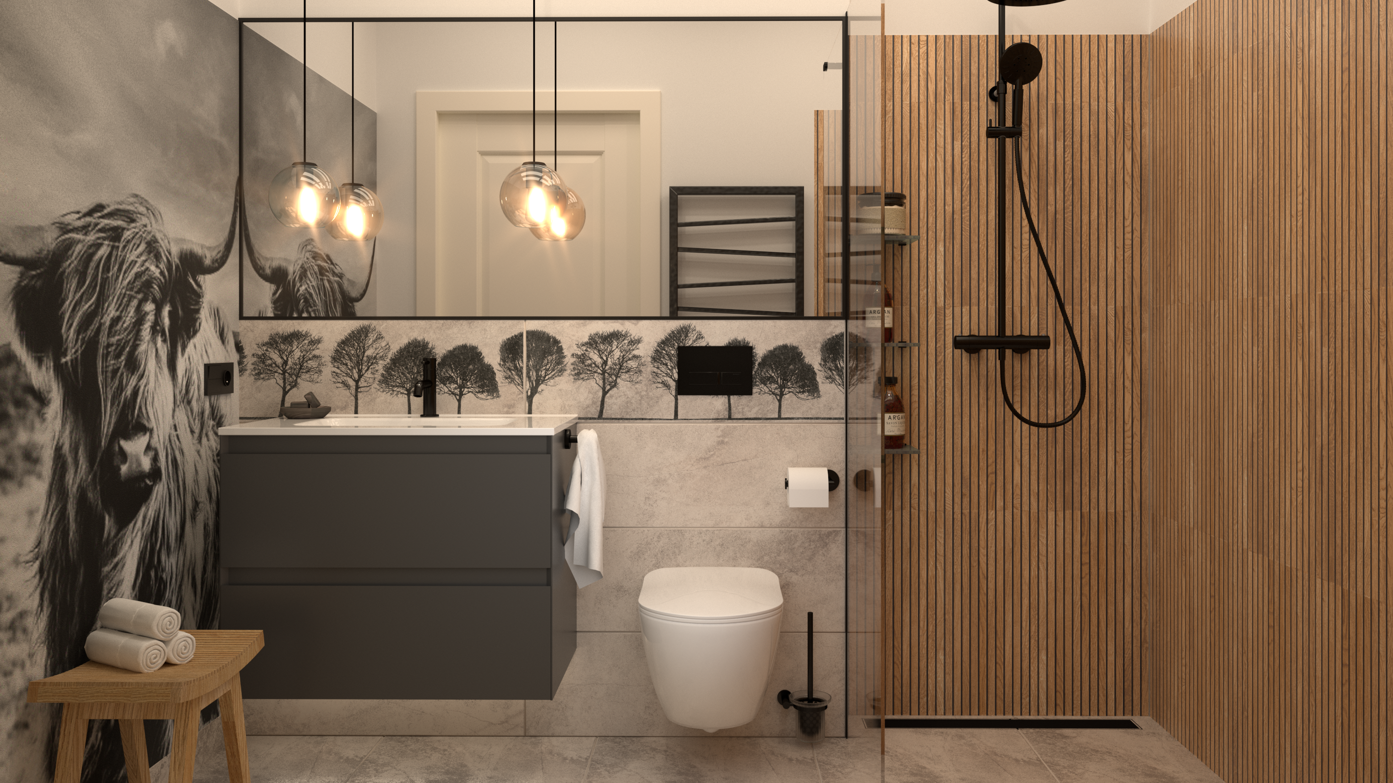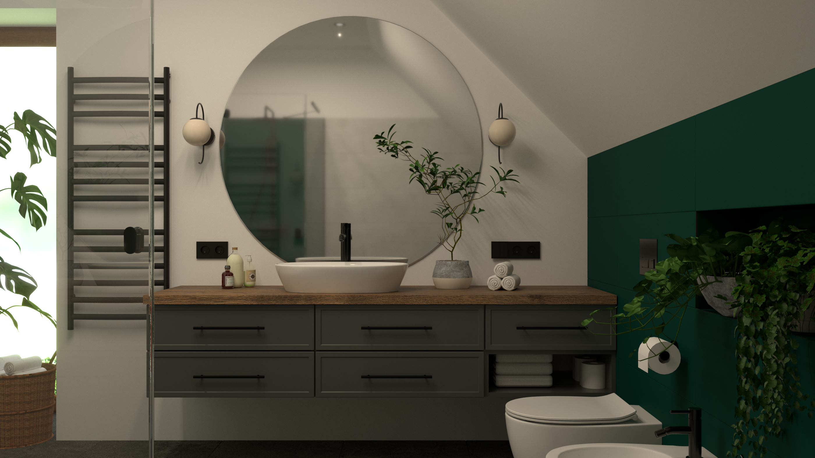 Łazienka 10 m2. W łazience miała się znaleźć wanna narożna i kabina prysznicowa. Elementy drewniane, kwiaty i dekor botaniczny nawiązują do natury. Pojemna szafka pod umywalką z wbudowanym koszem na pranie, siedzisko pod prysznicem i półki we wnęce pełnią funkcję praktyczną. Wanna narożna została obudowana płytkami w kolorze szmaragdowego lasu. Wizerunek goryla nawiązuje do dekoru z motywem dżungli i podkreśla charakter wnętrza.