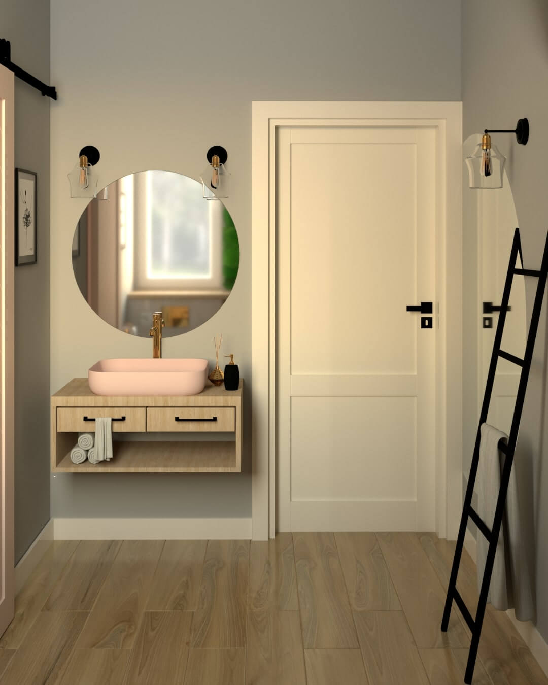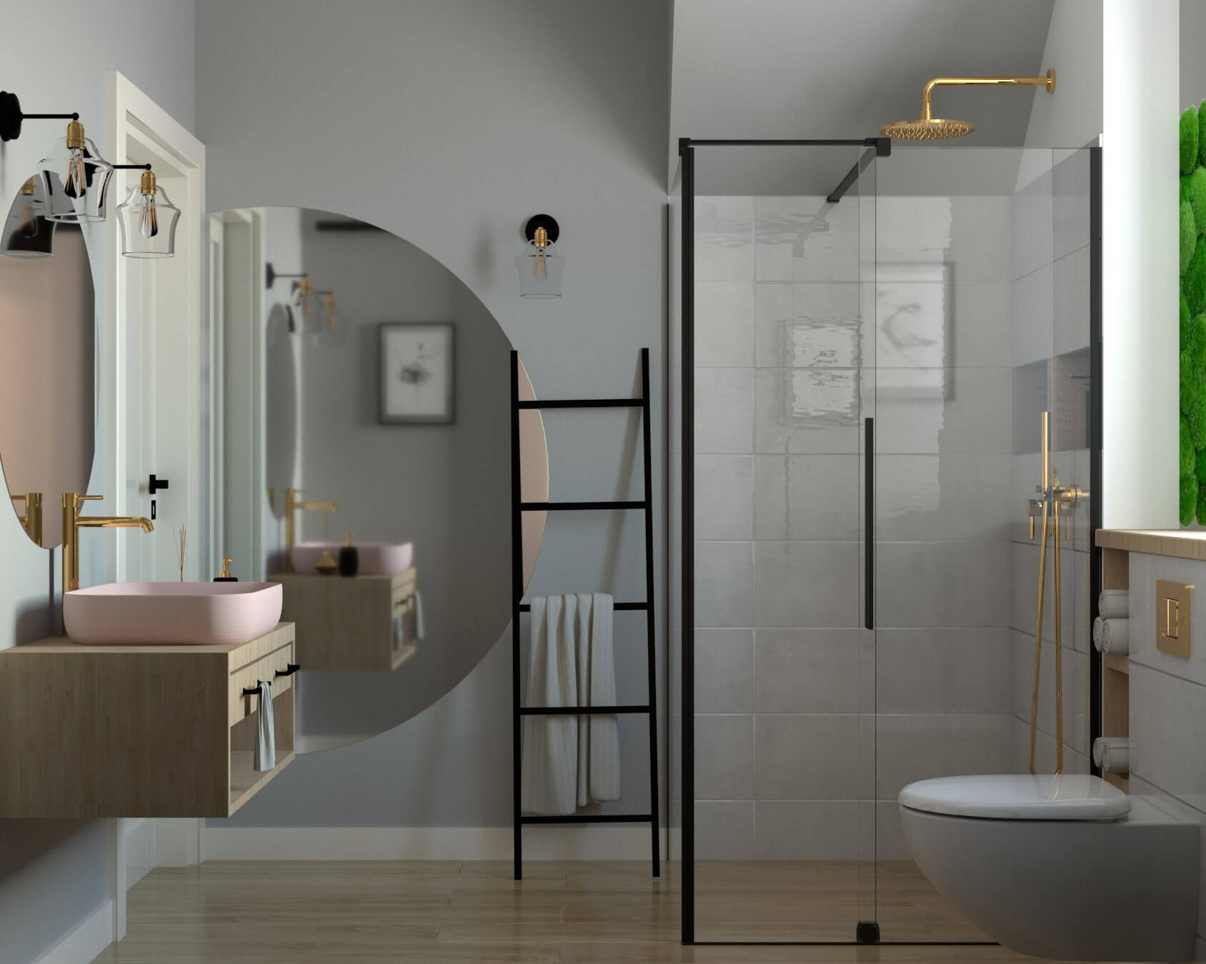 Łazienka 5 m2. Punktem wyjścia była różowa umywalka, złota armatura i elementy z drewna, które miały nadawać łazience elegancki charakter. Drzwi w stylu loftowym, prowadzące do pomieszczenia gospodarczego (pralnio-suszarni), pełnią funkcję ozdobną. Duże lustro wycięte z koła powiększa optycznie pomieszczenie. Źródłem ciepłego światła są kinkiety z kloszami z przezroczystego szkła, z czarno- złotymi ramionami nawiązującymi do armatury i przesuwanych drzwi.