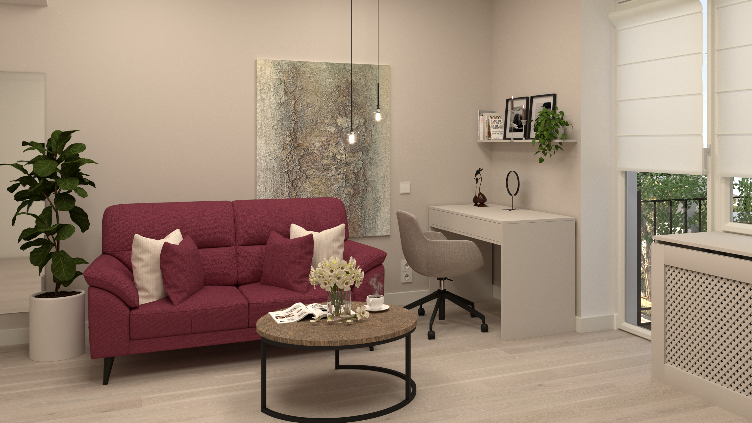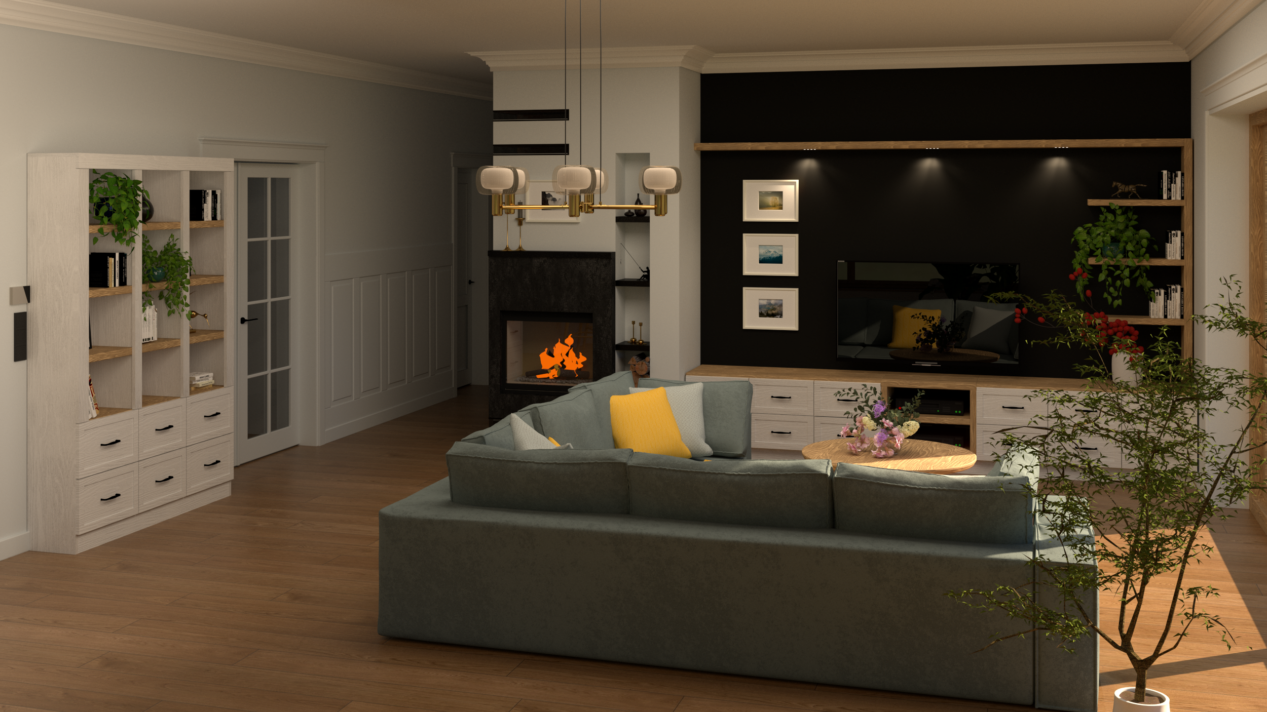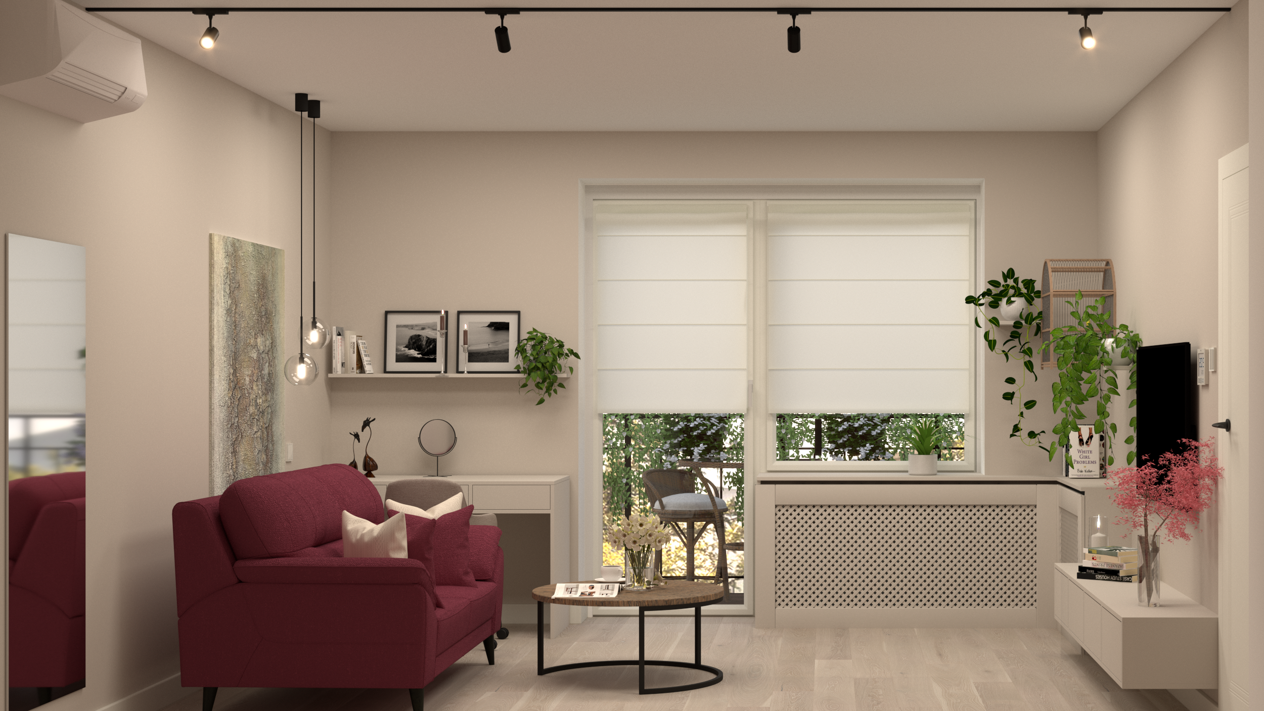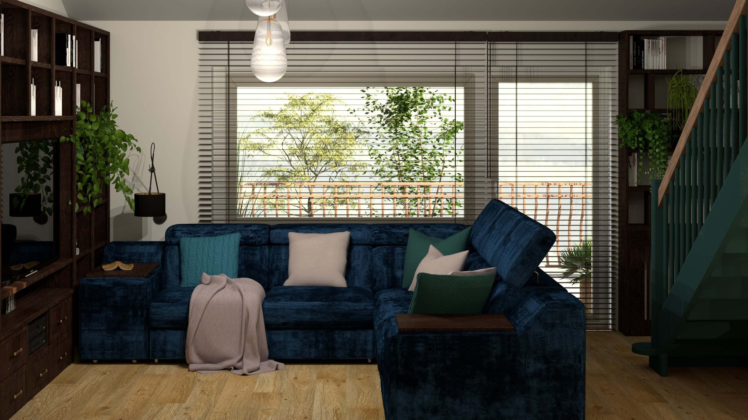 Salon został zaprojektowany z myślą o wypoczynku : siedzisko we wnęce okiennej i duża sofa narożnikowa obok prostej, a przez to urokliwej biblioteczki. Stonowana kolorystyka sprzyja użyciu naturalnych materiałów: drewniane podłogi i meble, wełniane koce, poduchy, i dywan. Metalowe lampy-kinkiety ze szklanymi kloszami tworzą przyjemny nastrój. Zrezygnowano z górnego oświetlenia, a pomieszczenie dodatkowo rozjaśnia optycznie duże lustro w czarnej ramie. Zieleń roślin nadaje przytulności.