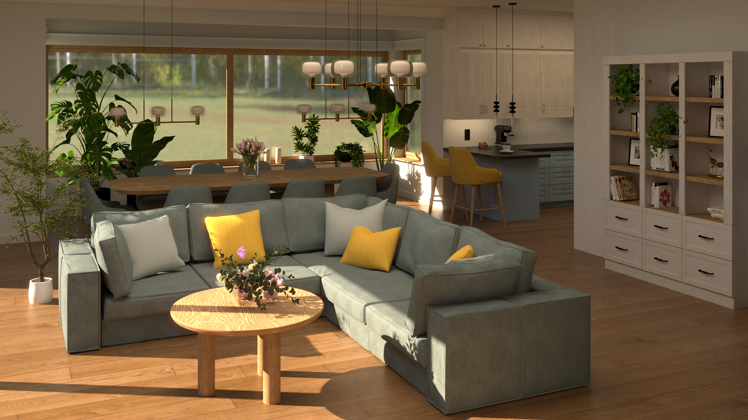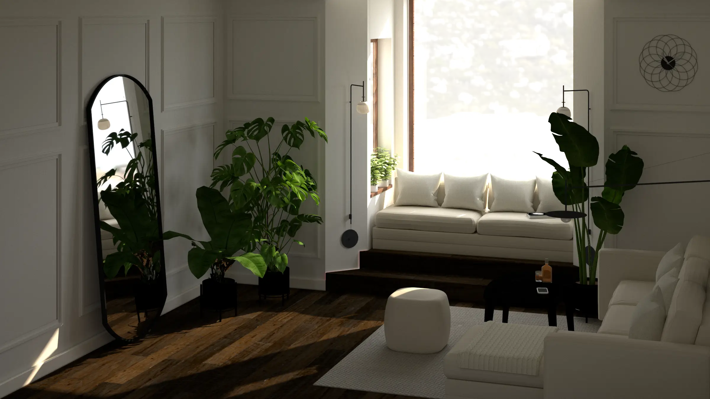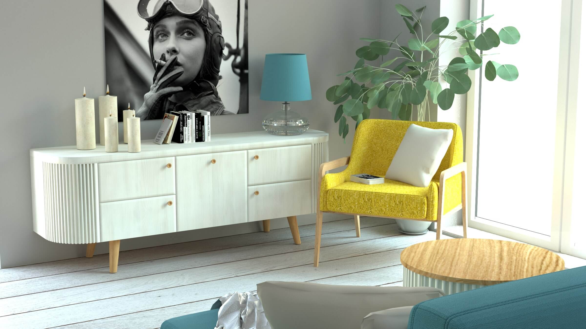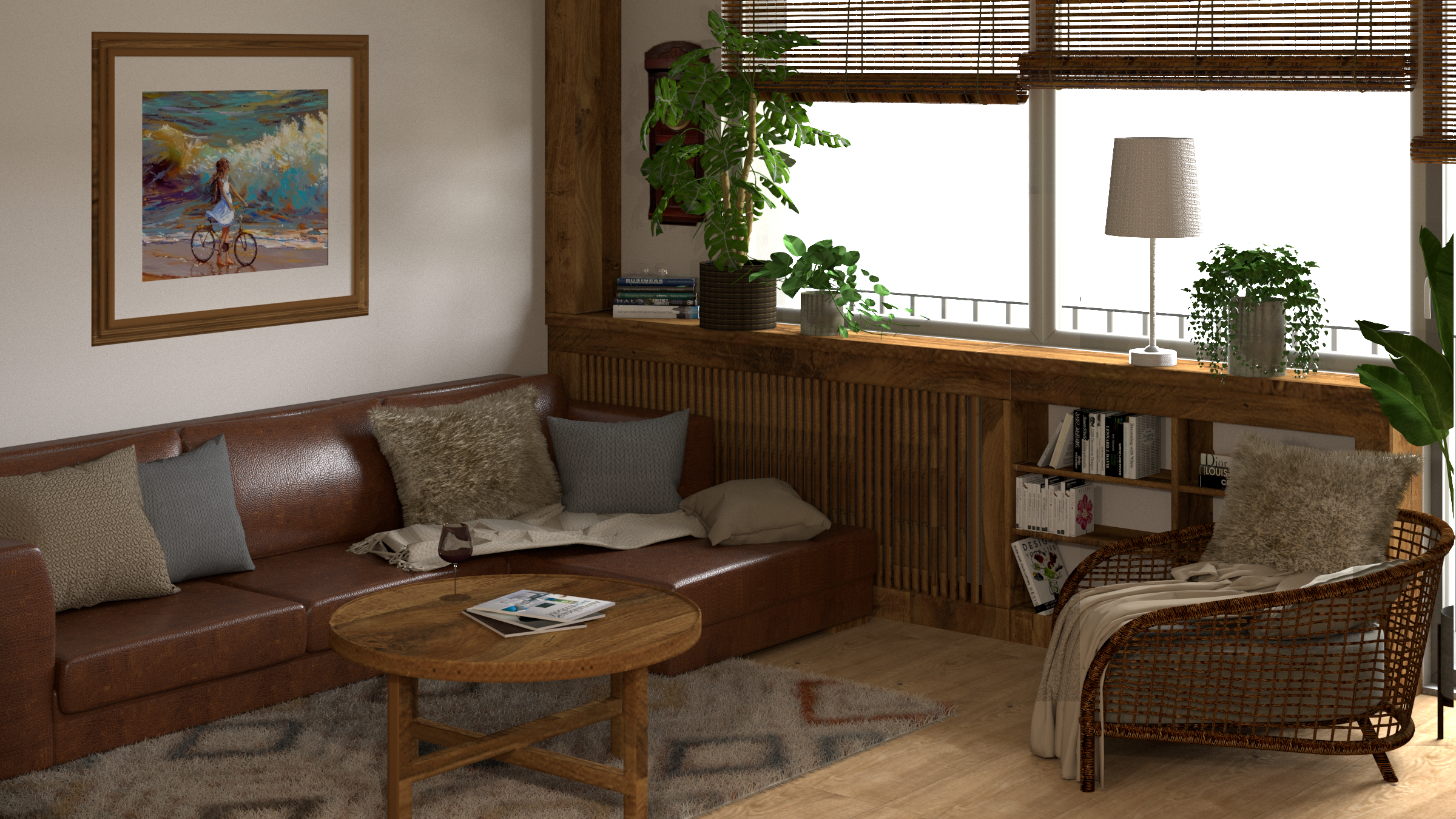 Salon został zaprojektowany z myślą o wypoczynku : siedzisko we wnęce okiennej i duża sofa narożnikowa obok prostej, a przez to urokliwej biblioteczki. Stonowana kolorystyka sprzyja użyciu naturalnych materiałów: drewniane podłogi i meble, wełniane koce, poduchy, i dywan. Metalowe lampy-kinkiety ze szklanymi kloszami tworzą przyjemny nastrój. Zrezygnowano z górnego oświetlenia, a pomieszczenie dodatkowo rozjaśnia optycznie duże lustro w czarnej ramie. Zieleń roślin nadaje przytulności.