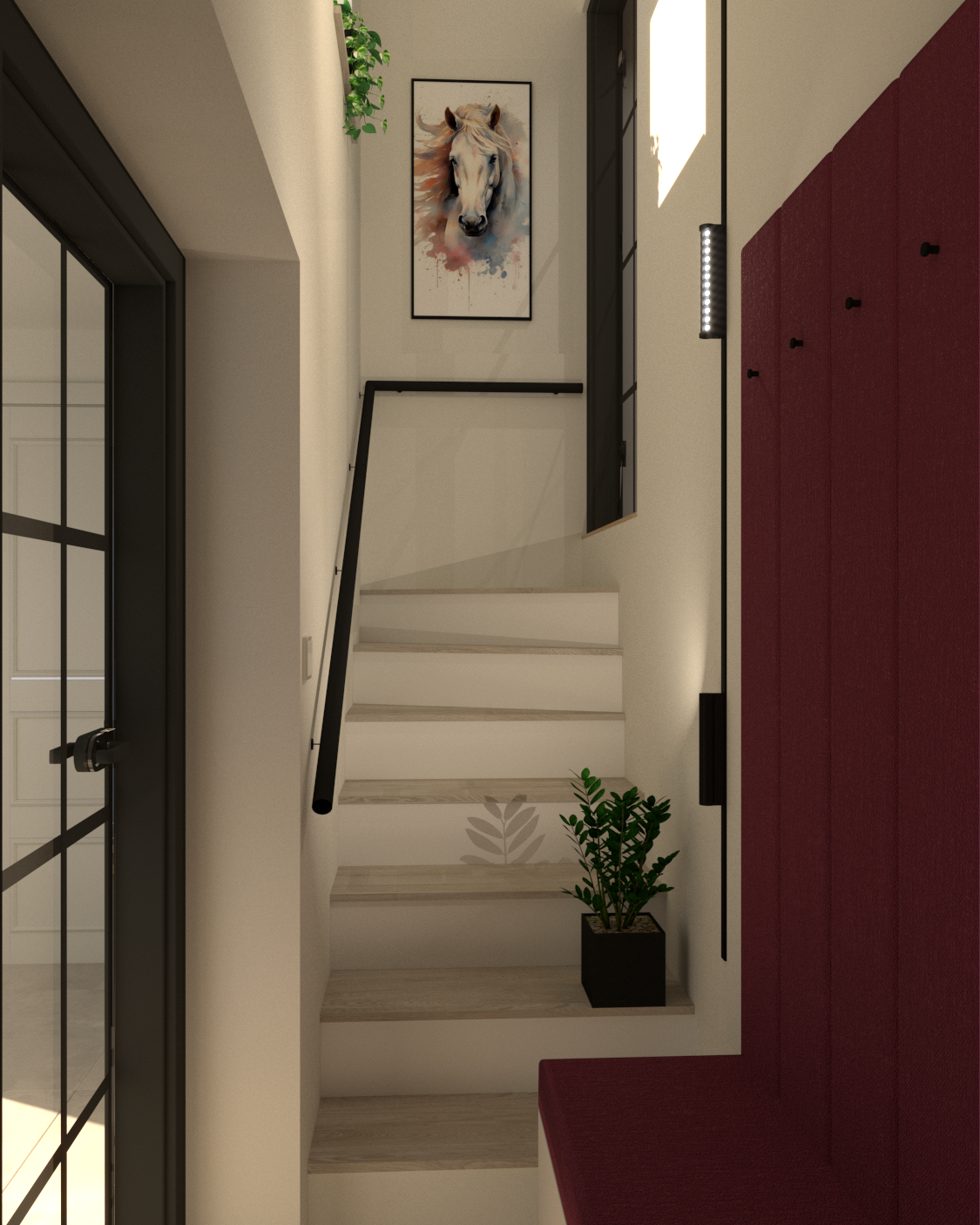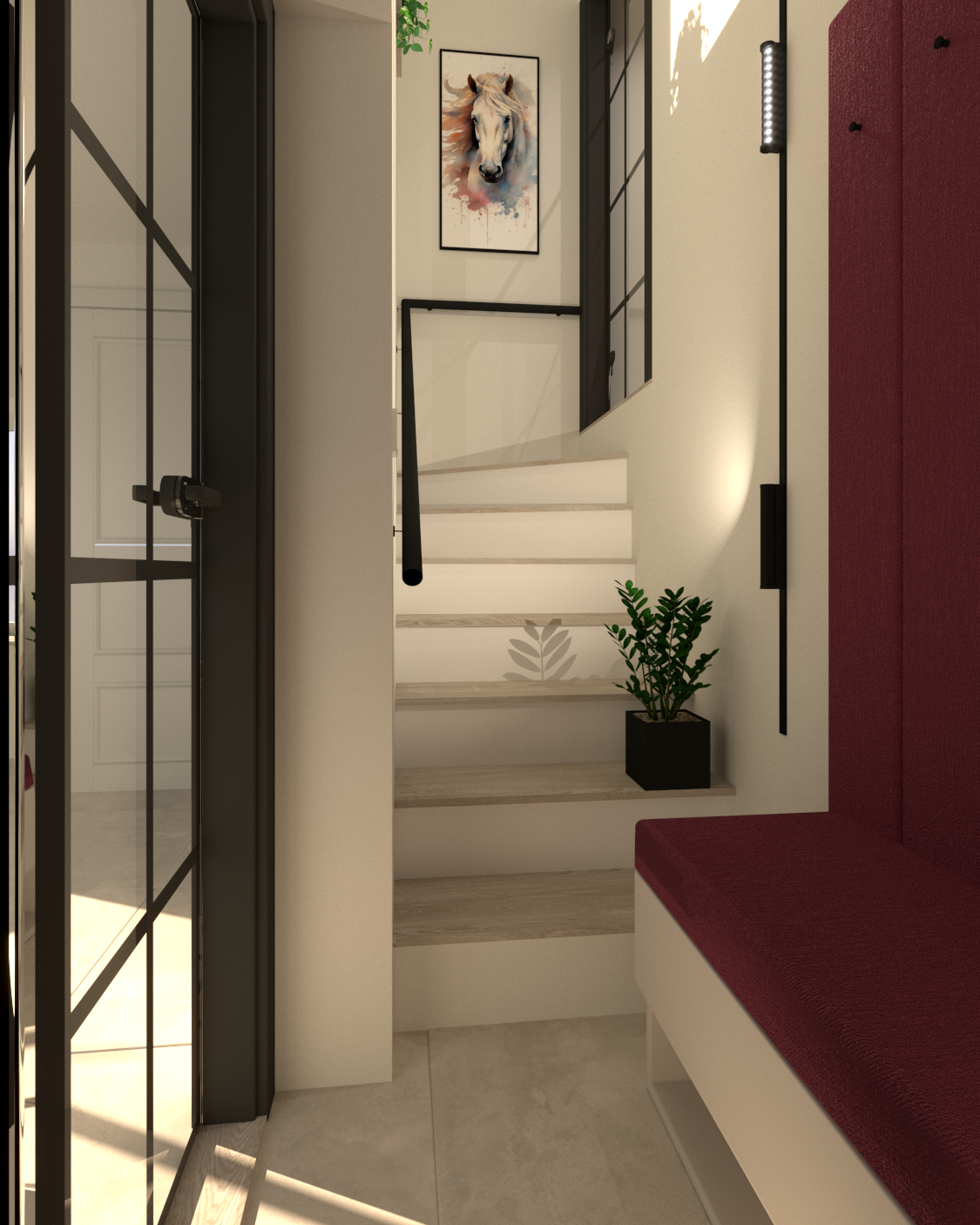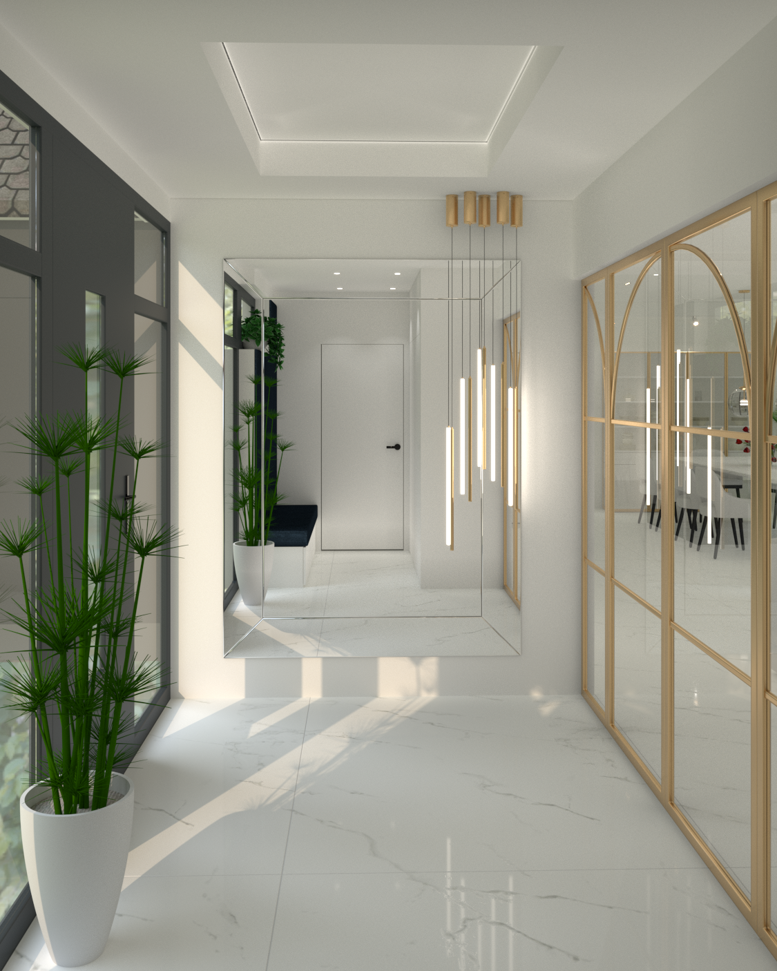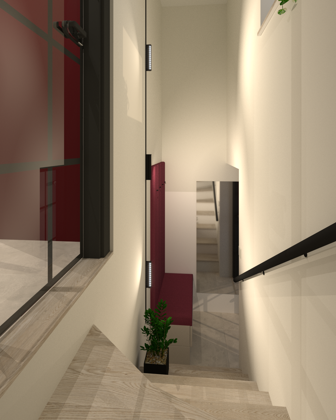 W hallu zostały wydłużone dwa pierwsze stopnie, które nadały lekkości całej konstrukcji, podkreślonej balustradą harfową. Całość dopełniają szklane lampy na długich sznurach oraz tapeta z czarnym motywem. Wnękę zabudowano drewnianą szafą z miękkim siedziskiem. Przeszklone drzwi zewnętrzne i szklana ściana nawiązują do istniejącej części domu. Do pozostałych pomieszczeń na parterze prowadzą drzwi ukryte. Korytarze i łącznik doświetlają lampy i kinkiety o nowoczesnej formie.