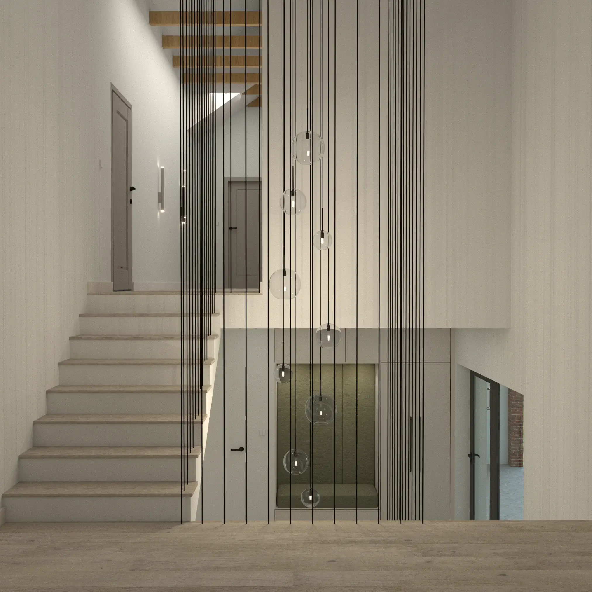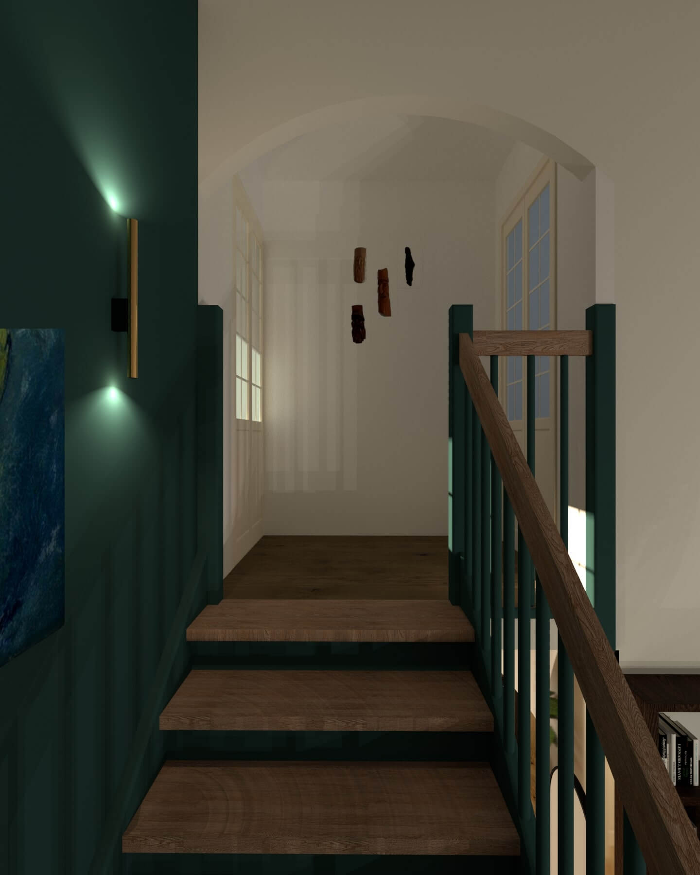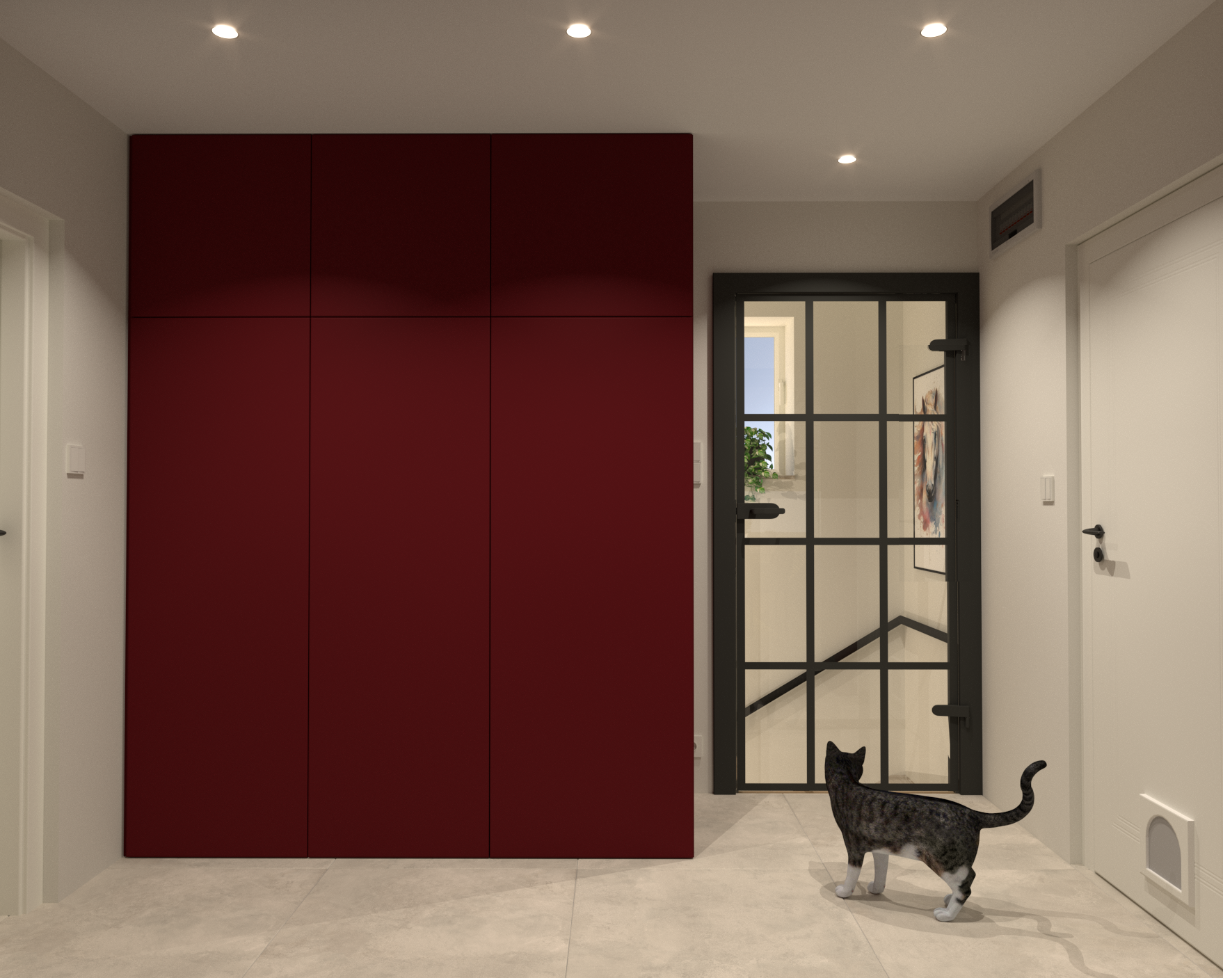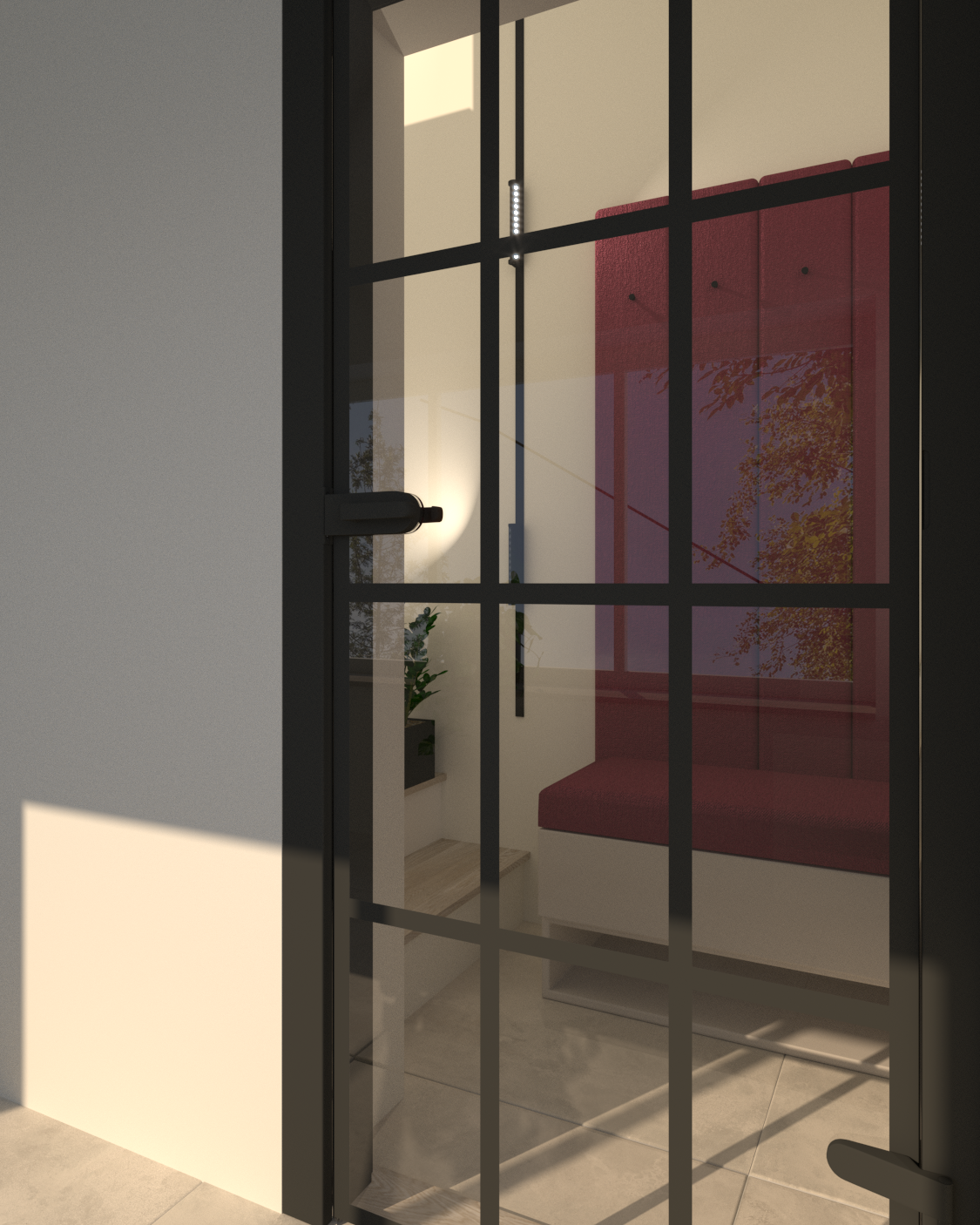 W hallu zostały wydłużone dwa pierwsze stopnie, które nadały lekkości całej konstrukcji, podkreślonej balustradą harfową. Całość dopełniają szklane lampy na długich sznurach oraz tapeta z czarnym motywem. Wnękę zabudowano drewnianą szafą z miękkim siedziskiem. Przeszklone drzwi zewnętrzne i szklana ściana nawiązują do istniejącej części domu. Do pozostałych pomieszczeń na parterze prowadzą drzwi ukryte. Korytarze i łącznik doświetlają lampy i kinkiety o nowoczesnej formie.