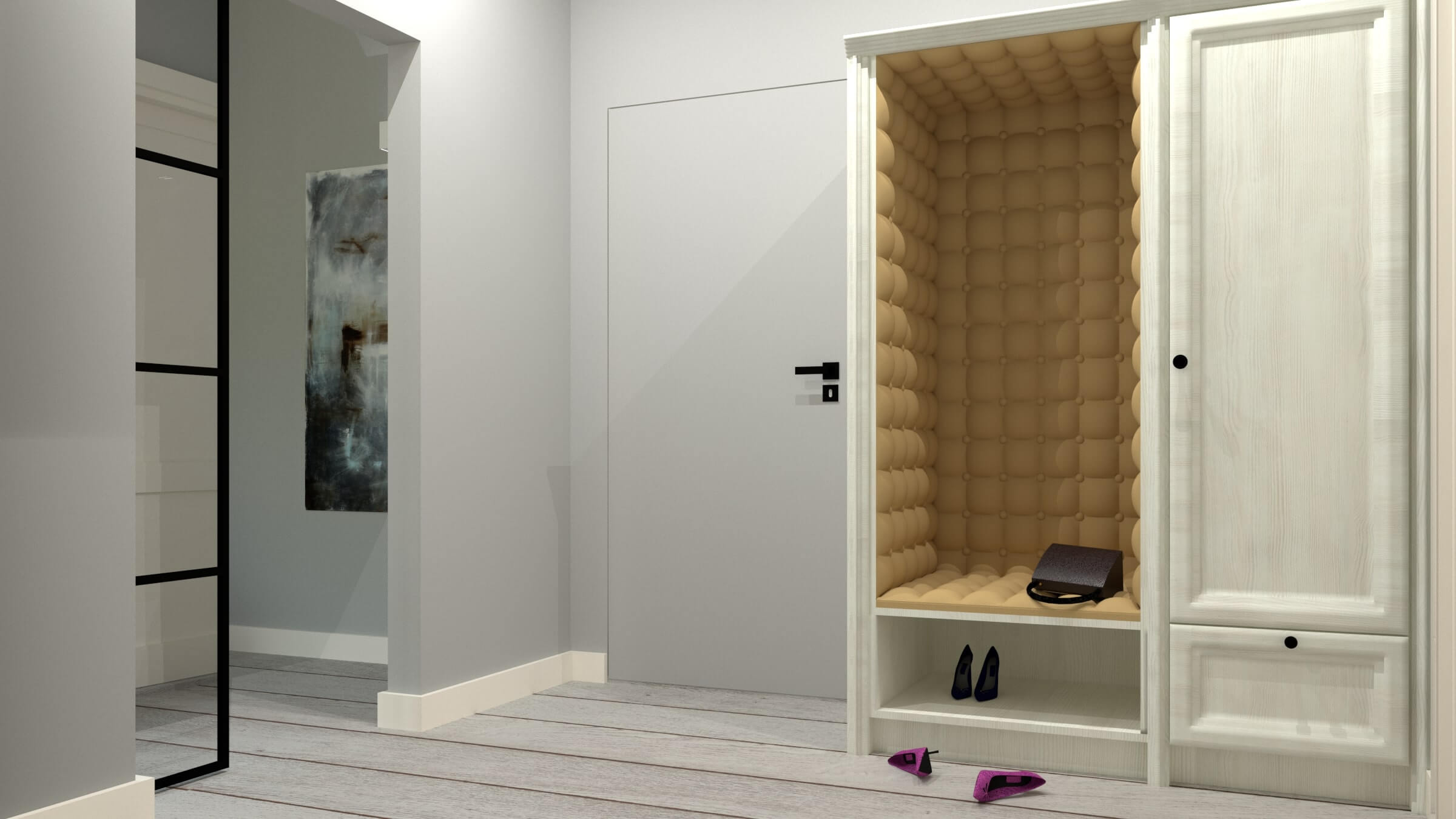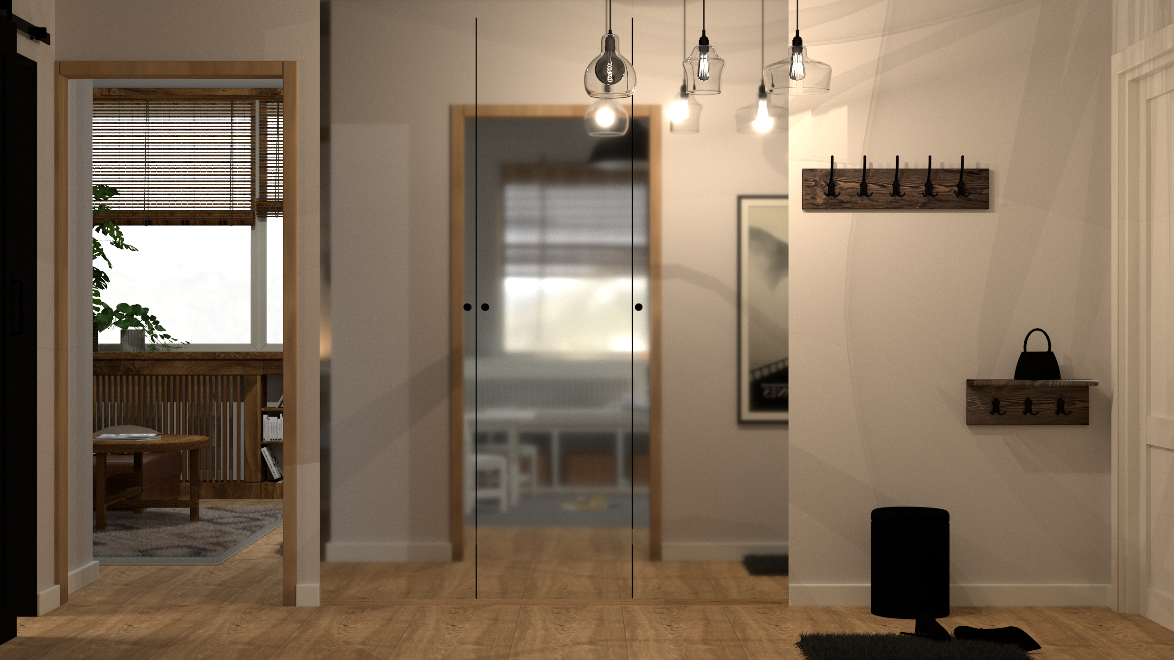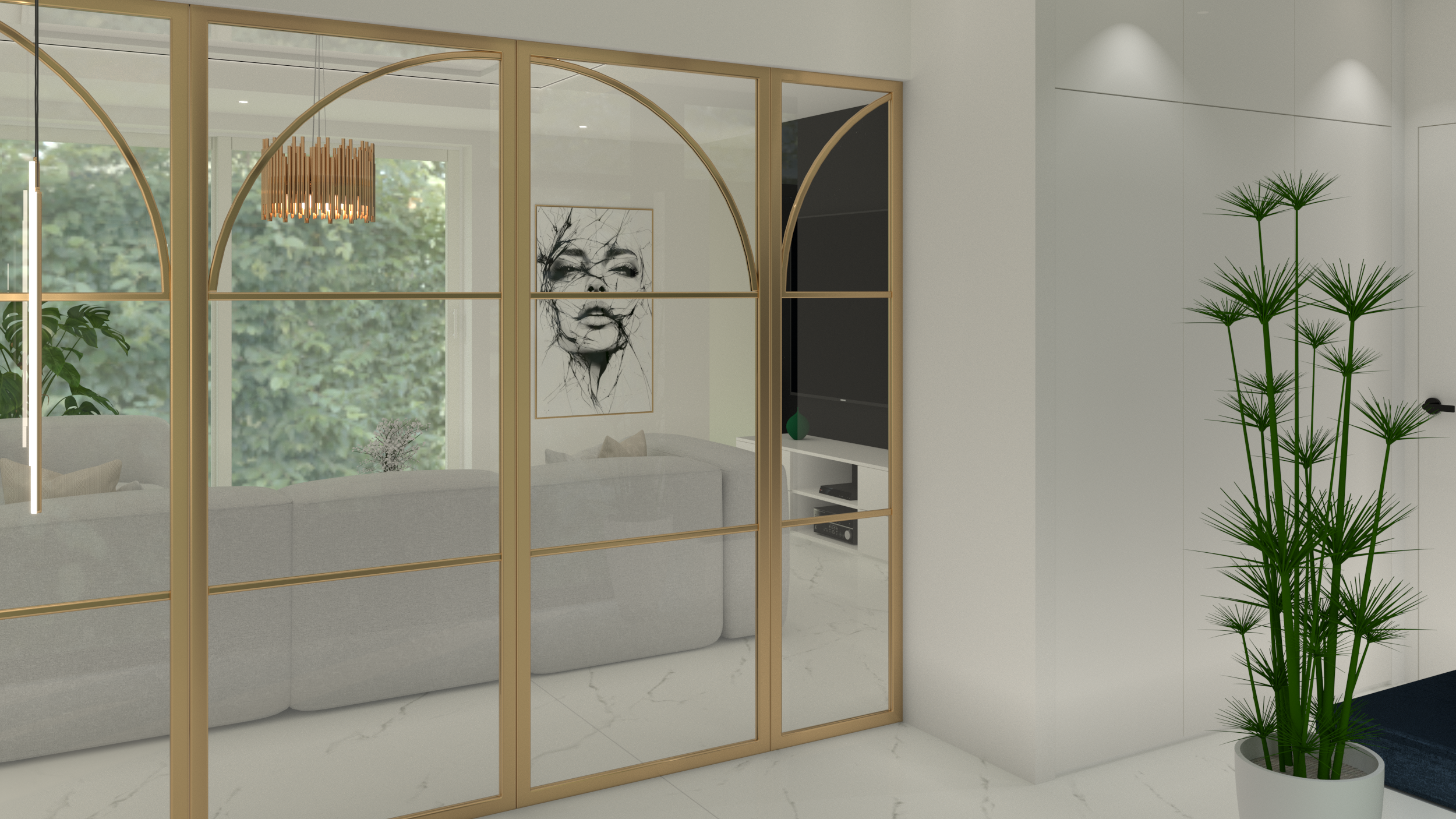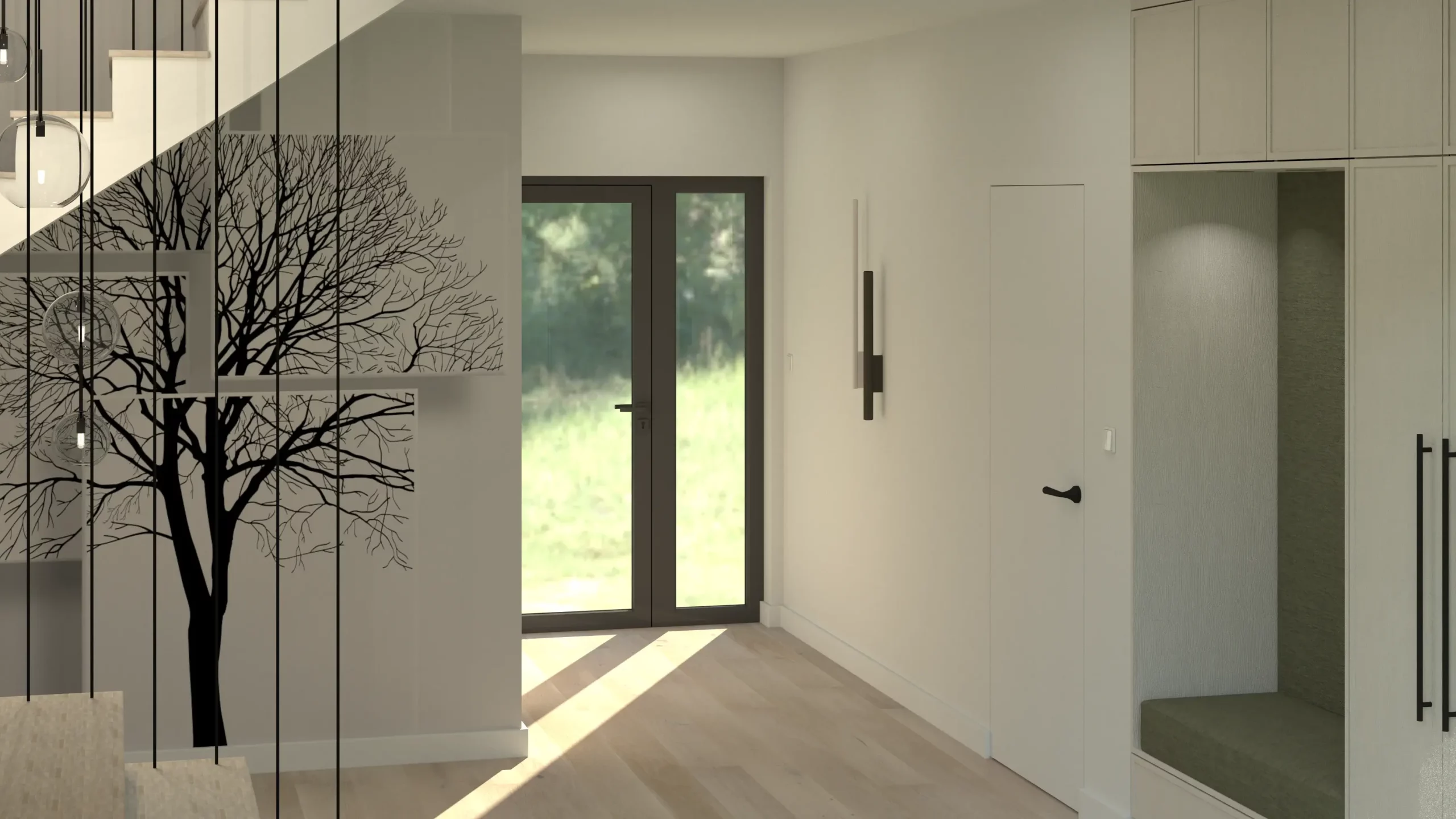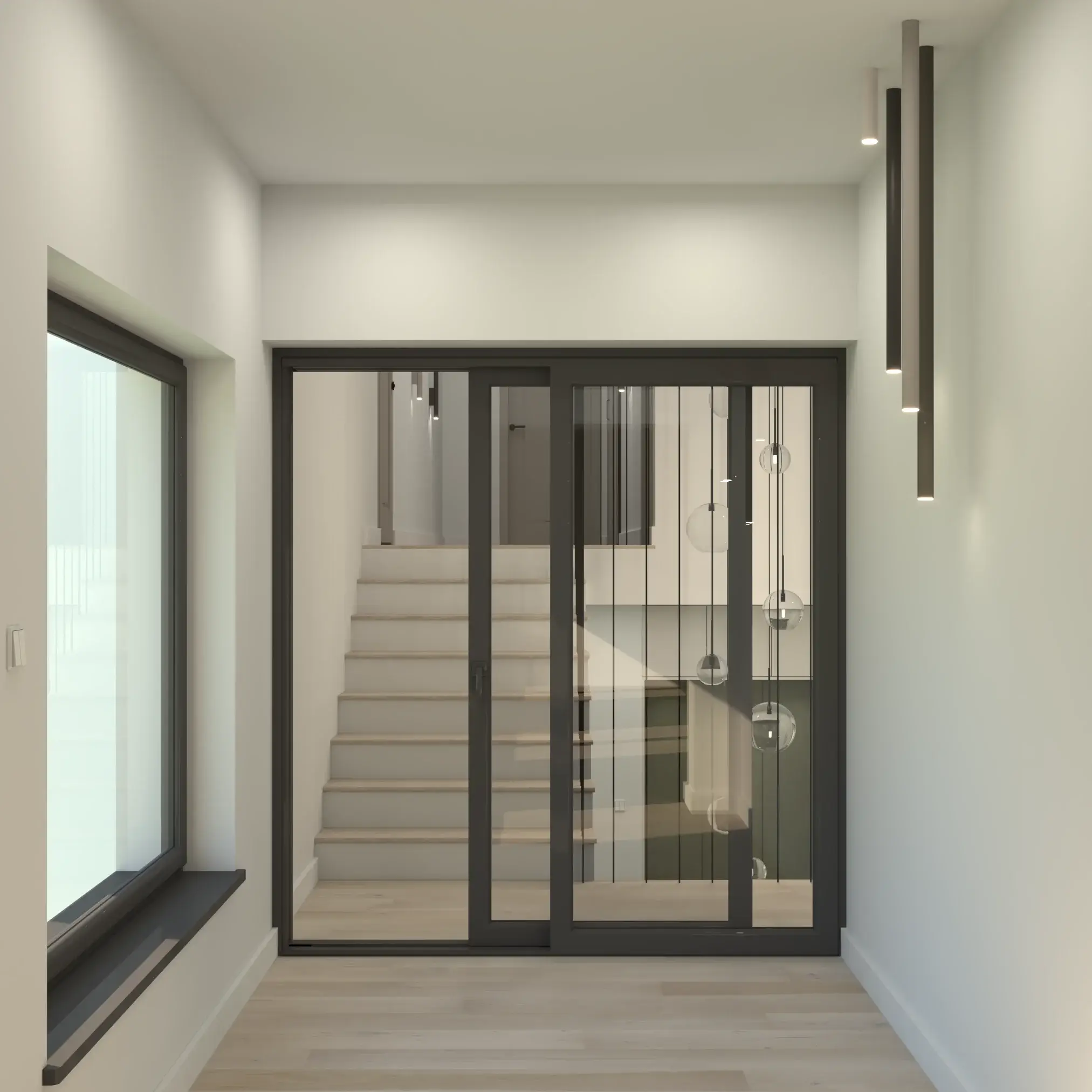 W hallu zostały wydłużone dwa pierwsze stopnie, które nadały lekkości całej konstrukcji, podkreślonej balustradą harfową. Całość dopełniają szklane lampy na długich sznurach oraz tapeta z czarnym motywem. Wnękę zabudowano drewnianą szafą z miękkim siedziskiem. Przeszklone drzwi zewnętrzne i szklana ściana nawiązują do istniejącej części domu. Do pozostałych pomieszczeń na parterze prowadzą drzwi ukryte. Korytarze i łącznik doświetlają lampy i kinkiety o nowoczesnej formie.