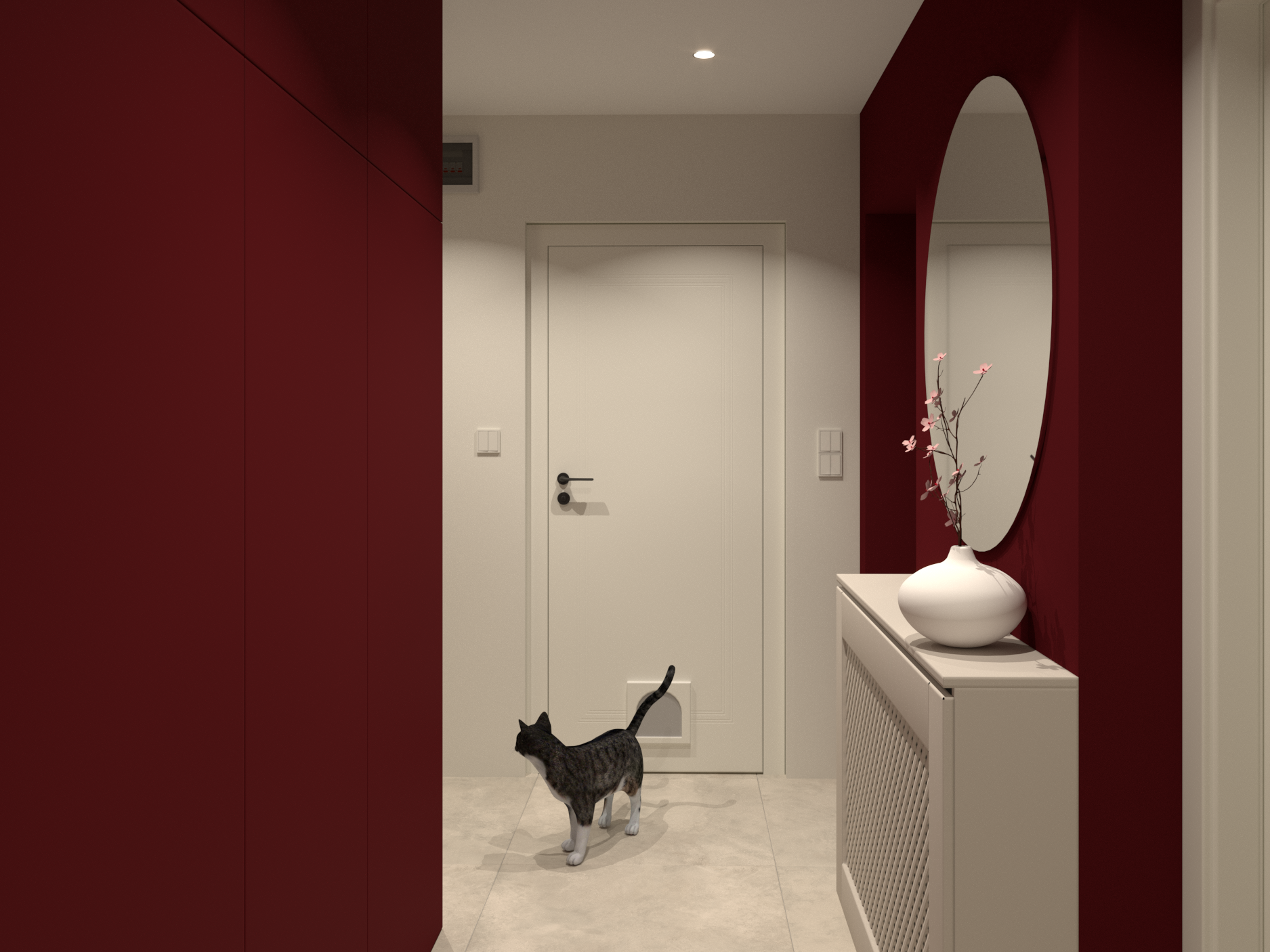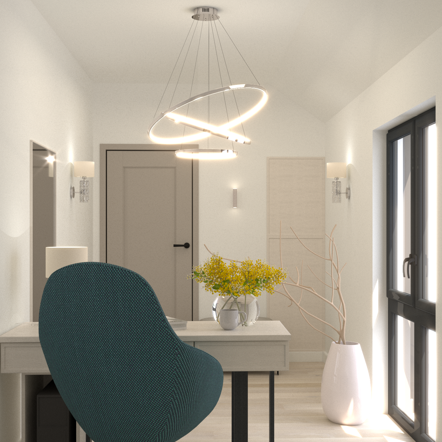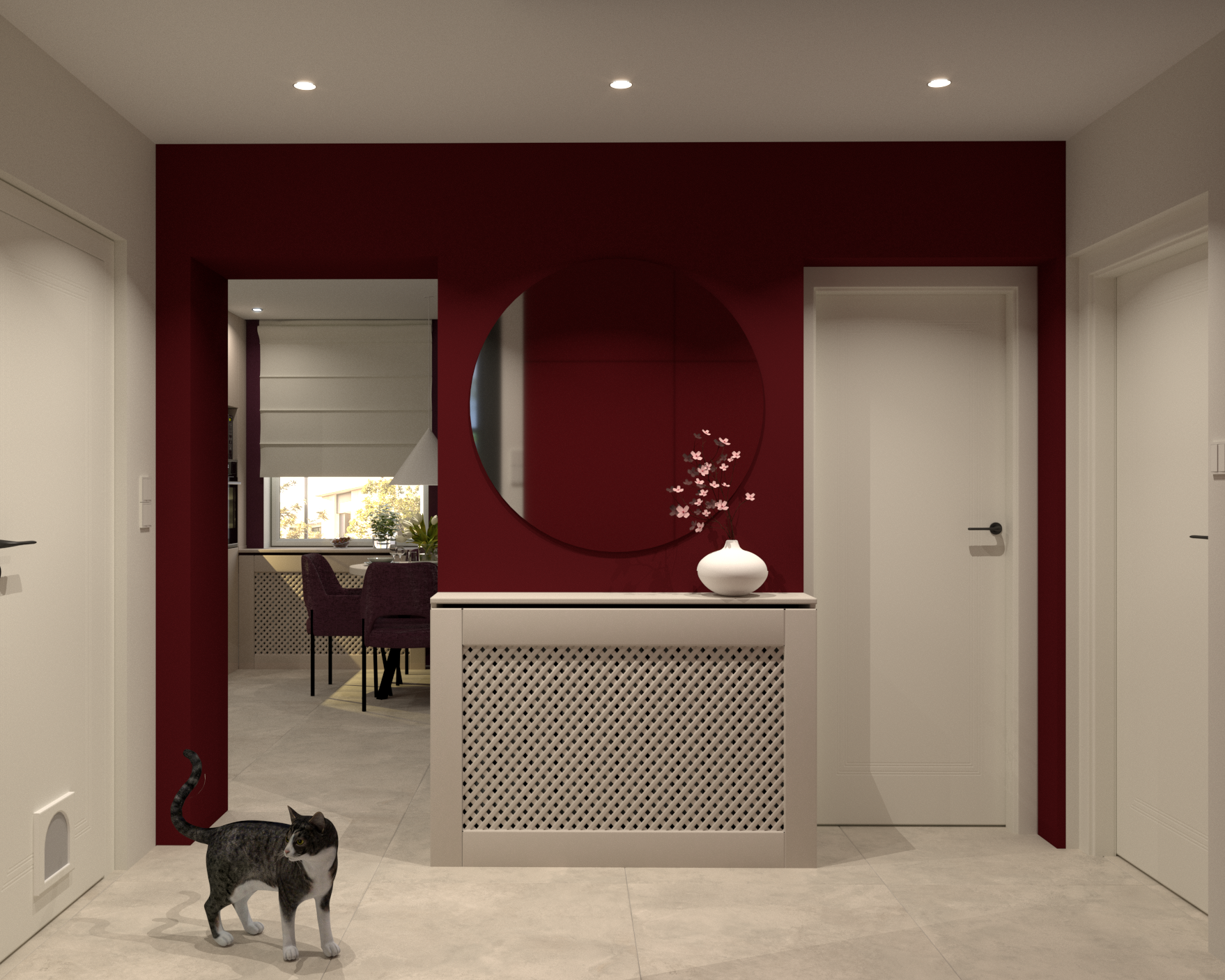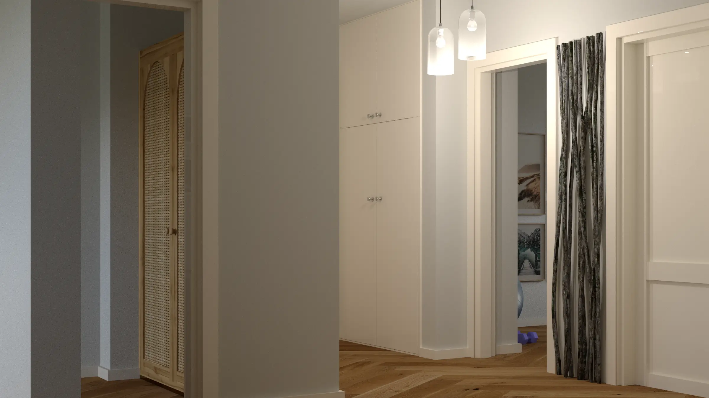 W hallu zostały wydłużone dwa pierwsze stopnie, które nadały lekkości całej konstrukcji, podkreślonej balustradą harfową. Całość dopełniają szklane lampy na długich sznurach oraz tapeta z czarnym motywem. Wnękę zabudowano drewnianą szafą z miękkim siedziskiem. Przeszklone drzwi zewnętrzne i szklana ściana nawiązują do istniejącej części domu. Do pozostałych pomieszczeń na parterze prowadzą drzwi ukryte. Korytarze i łącznik doświetlają lampy i kinkiety o nowoczesnej formie.