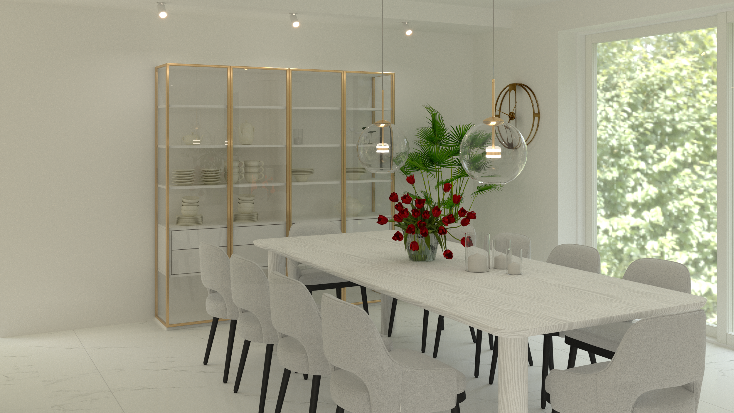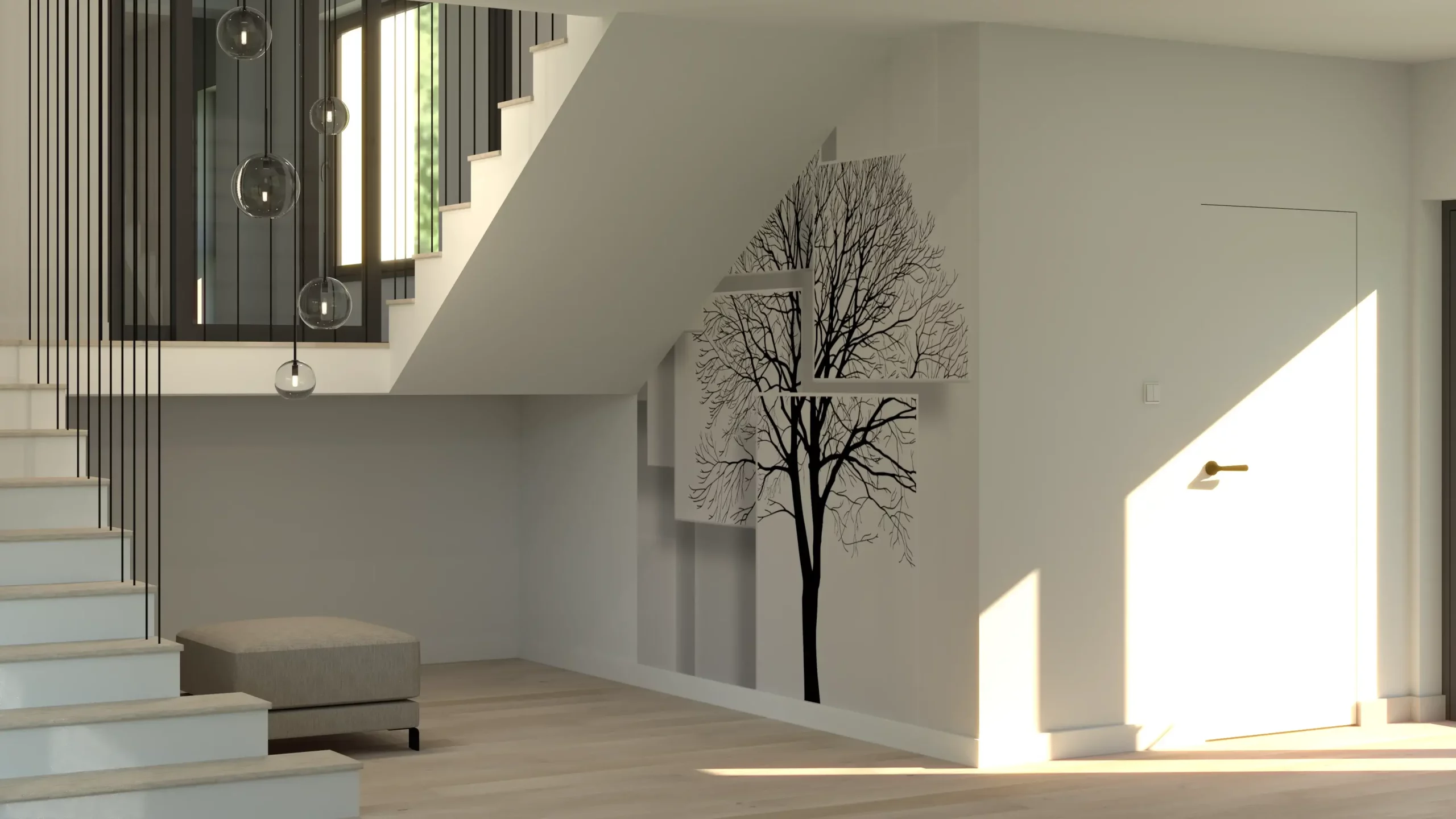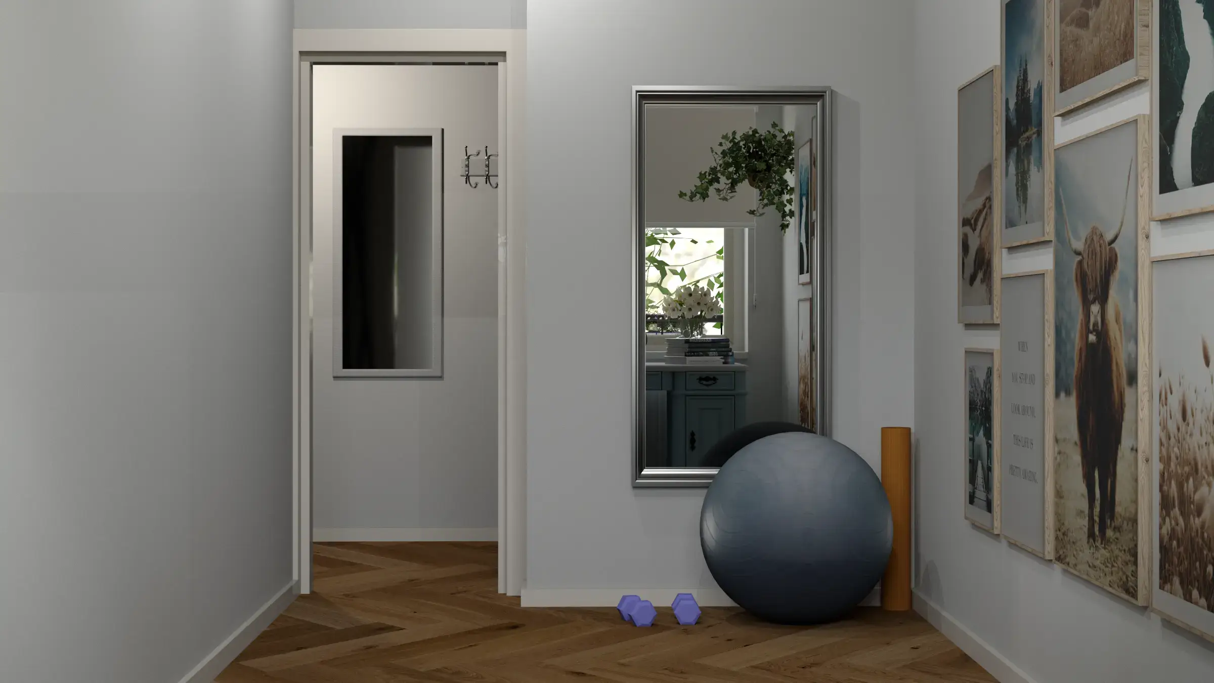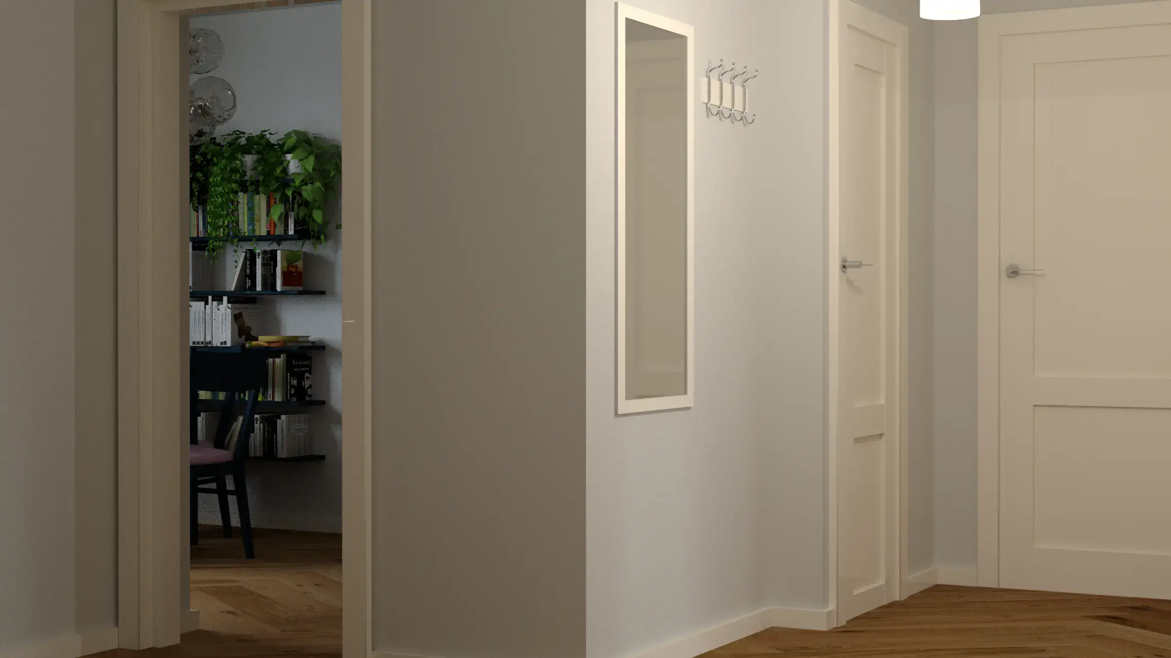 W hallu zostały wydłużone dwa pierwsze stopnie, które nadały lekkości całej konstrukcji, podkreślonej balustradą harfową. Całość dopełniają szklane lampy na długich sznurach oraz tapeta z czarnym motywem. Wnękę zabudowano drewnianą szafą z miękkim siedziskiem. Przeszklone drzwi zewnętrzne i szklana ściana nawiązują do istniejącej części domu. Do pozostałych pomieszczeń na parterze prowadzą drzwi ukryte. Korytarze i łącznik doświetlają lampy i kinkiety o nowoczesnej formie.