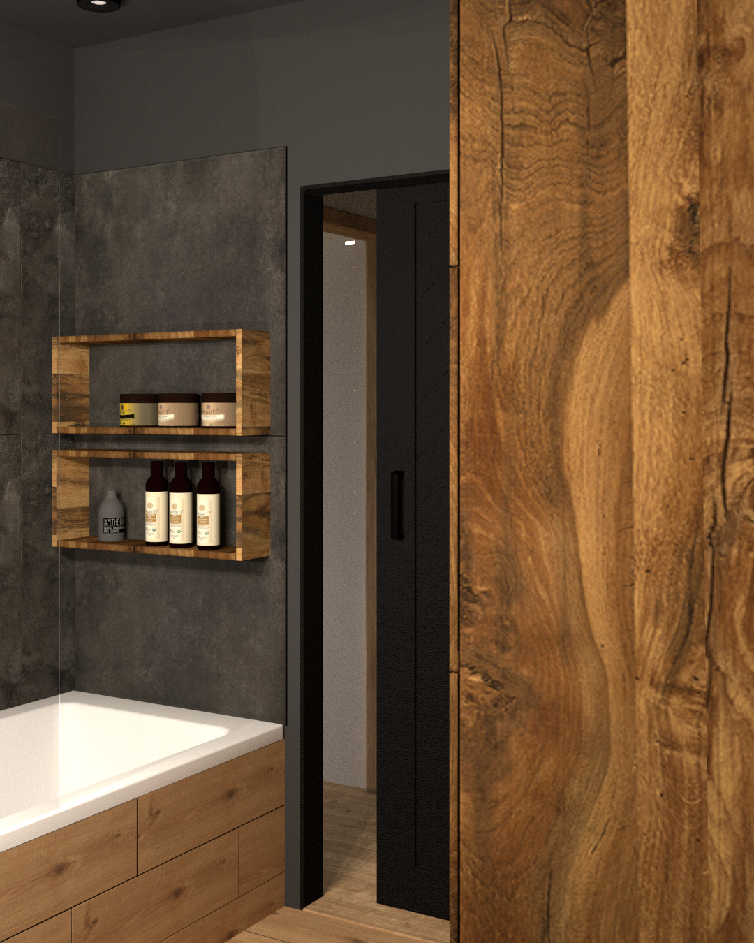 Wnętrze wyłożono deskami ryflowanymi z modrzewia syberyjskiego, zaimpregnowanymi olejem w kolorze wenge, nawiązującym do pozostałej części mieszkania. Wanna wolnostojąca i baterie łazienkowe o nietuzinkowym kształcie. Klasyczna umywalka nablatowa na konsoli wykonanej z drewna orzechowca, odzyskanego ze starej ławy, wg mojego projektu.