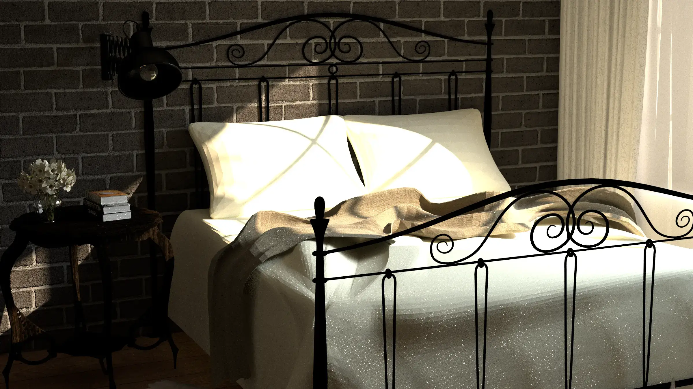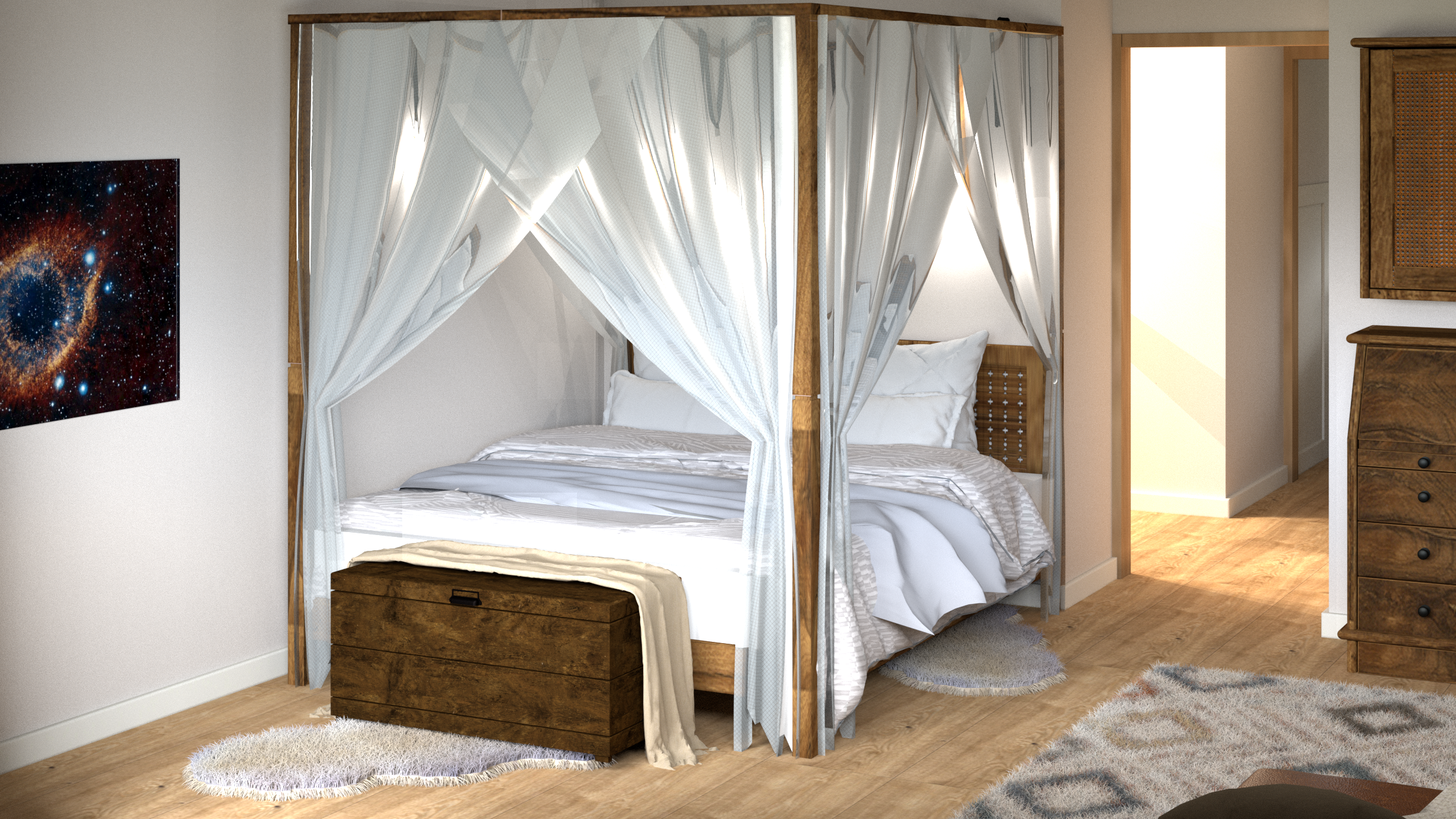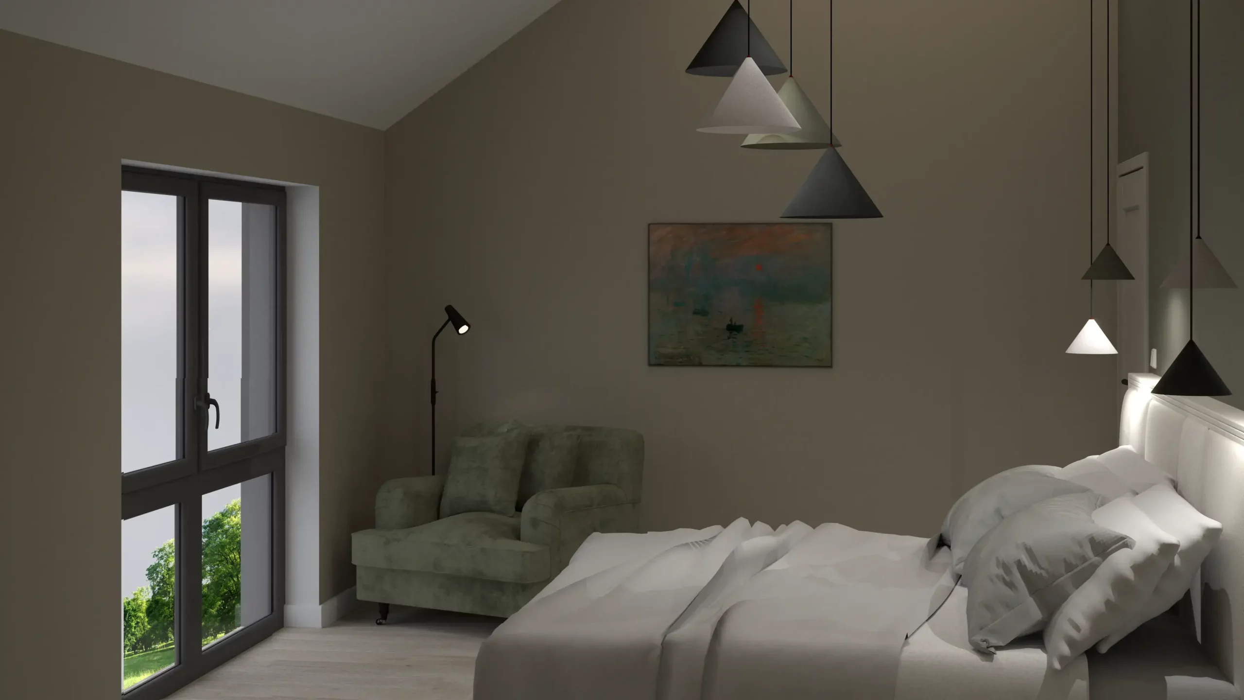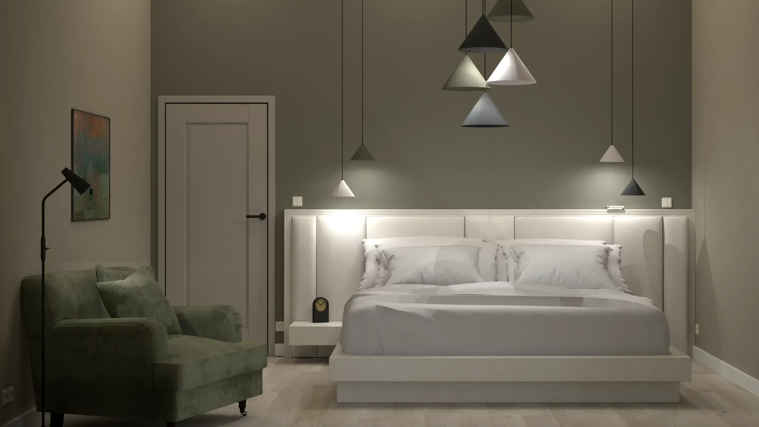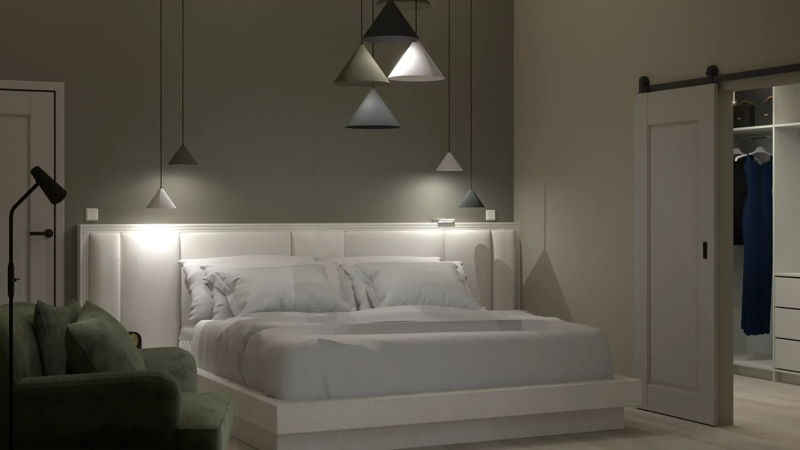 W sypialni, na tle ciemniejszej ściany, duże łóżko z bielonego drewna, z wezgłowiem tapicerowanym białą skórą. Proste lampy, nawiązujące kolorystką do pozostałych elementów pomieszczenia.