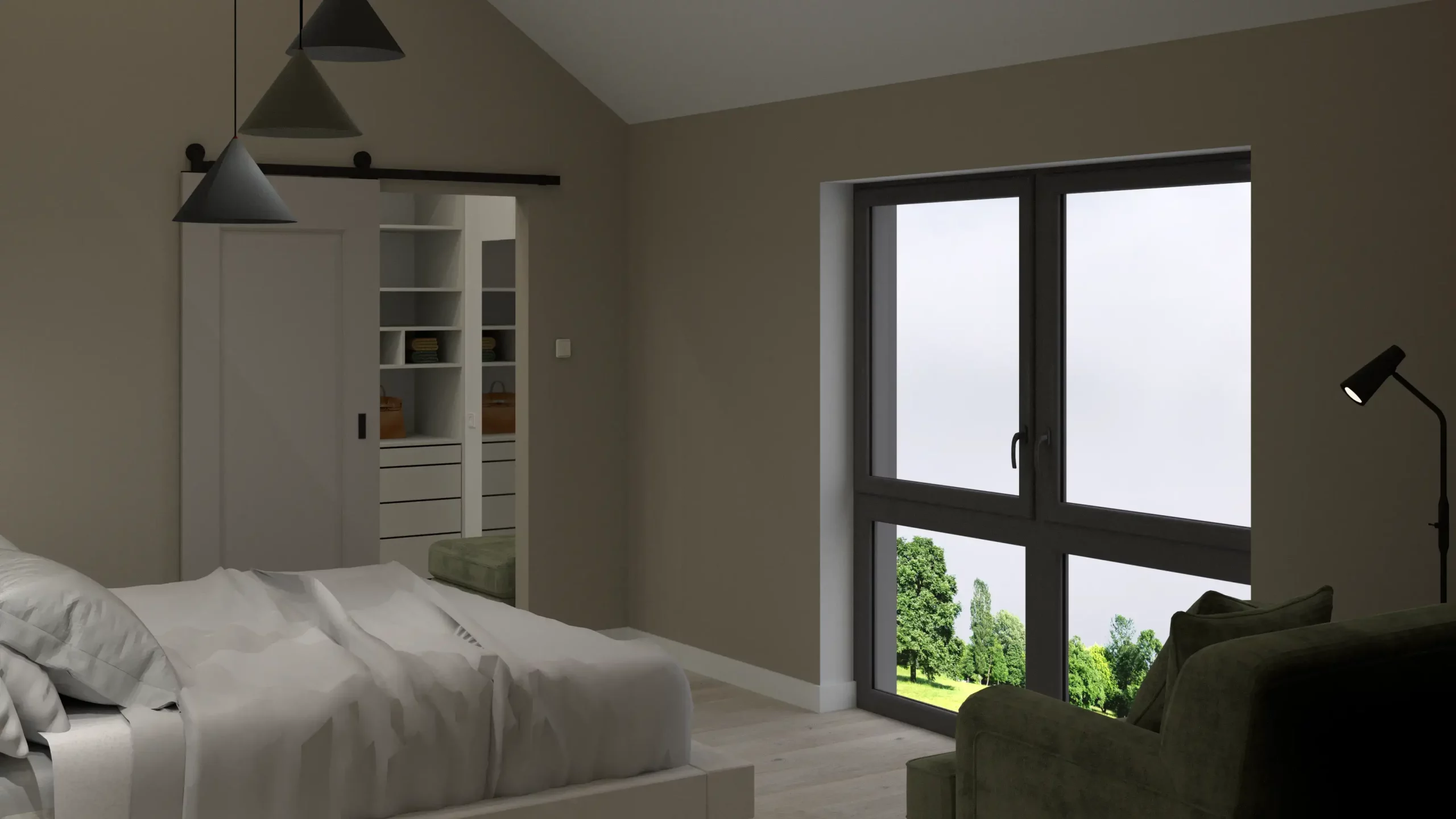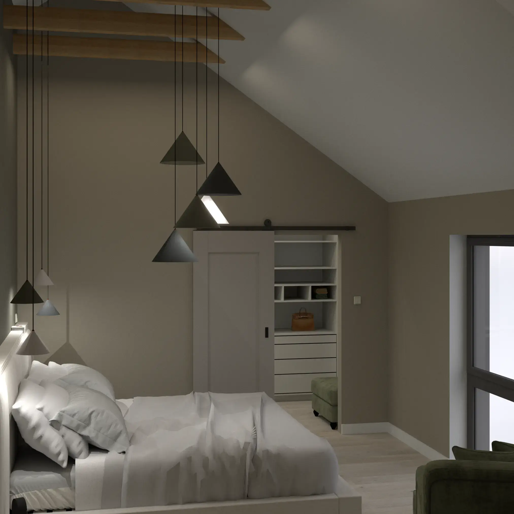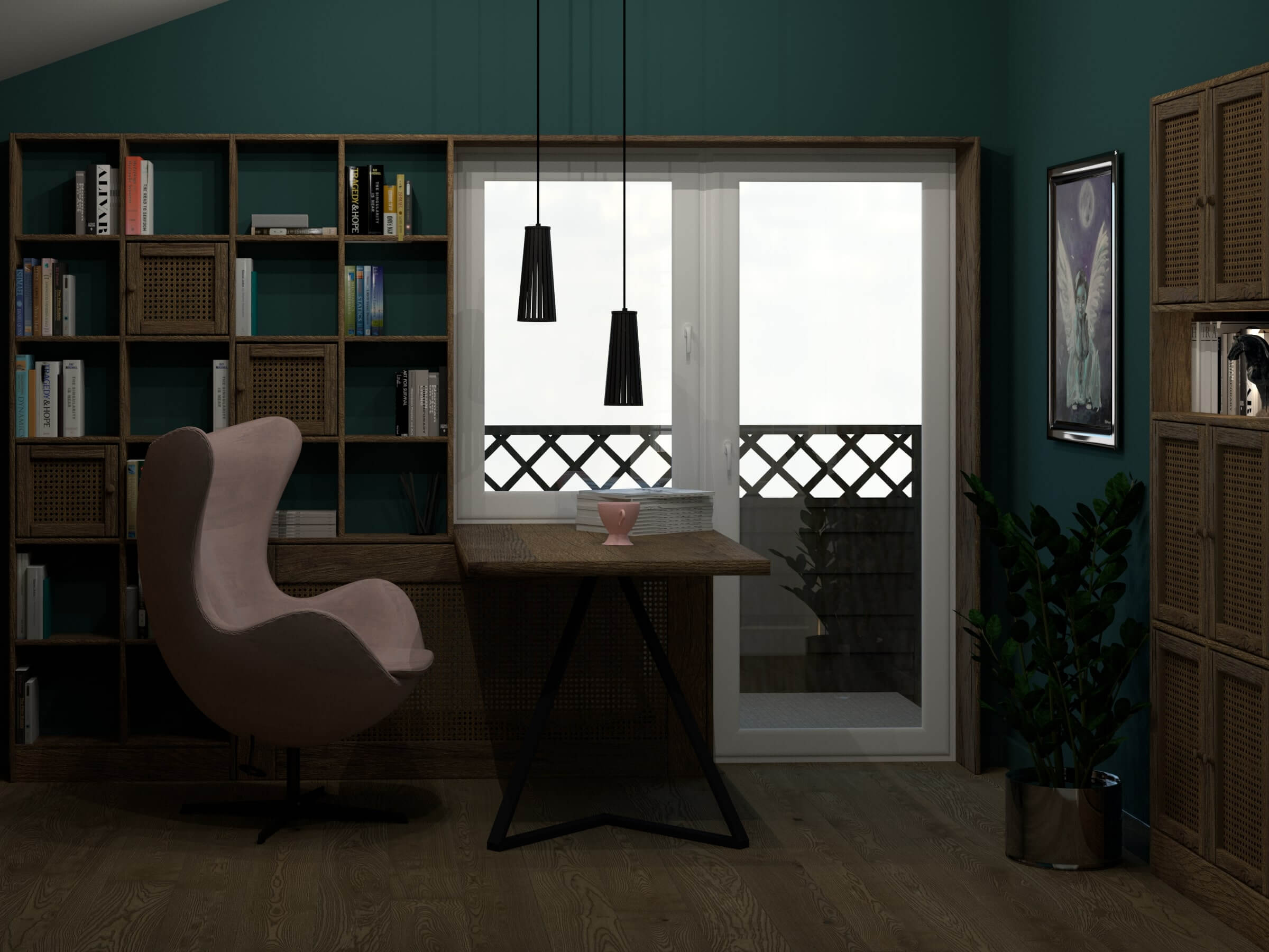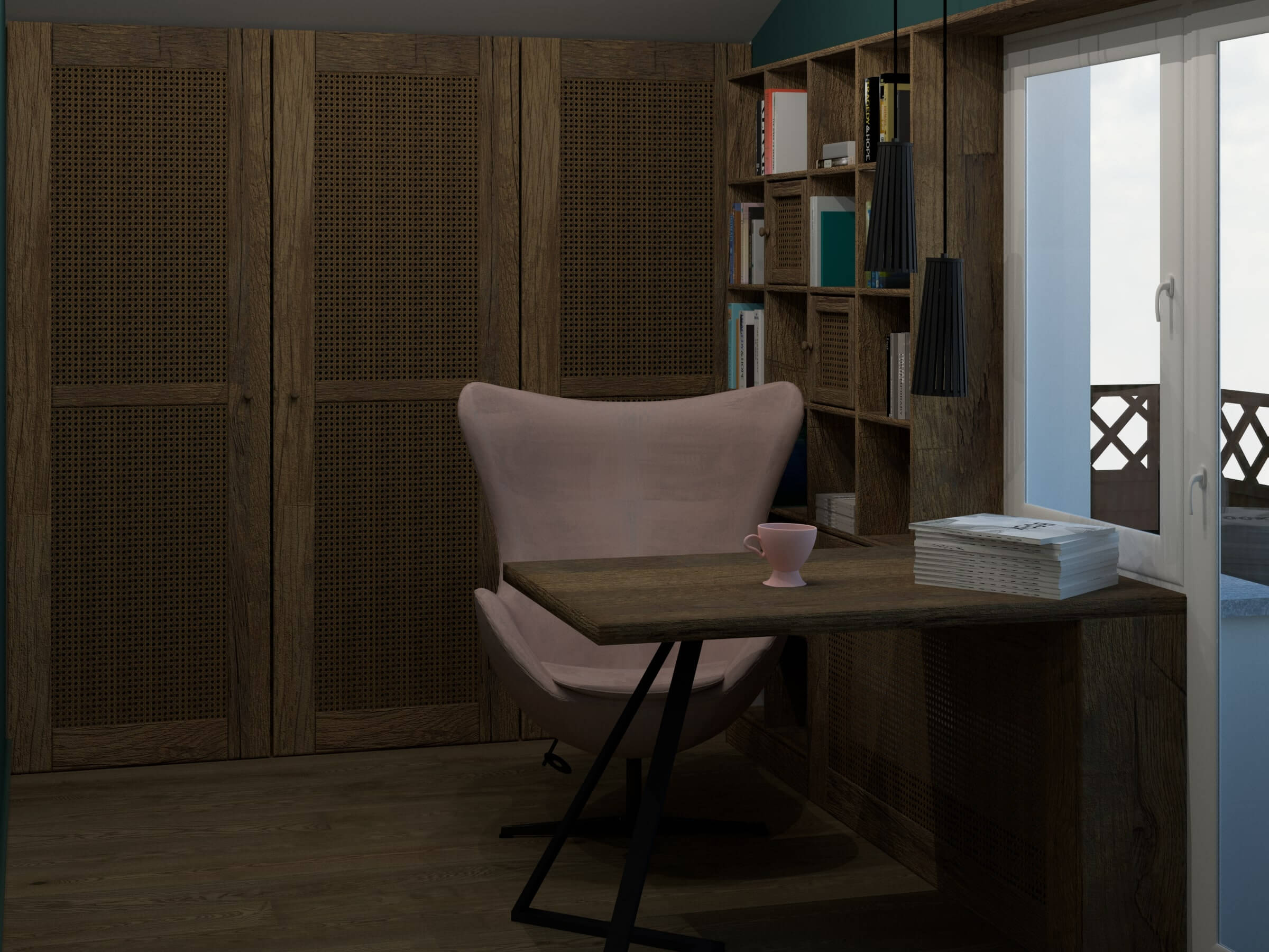 Na poddaszu utworzono dodatkowy pokój pracy z wygodnym fotelem i biurkiem na oryginalnej, metalowej nodze. Stworzone zostały dodatkowe półki na książki i szafka w zabudowie. Drzwi w szafie zajmującej całą ścianę zyskały na lekkości dzięki wstawkom z naturalnego rattanu.