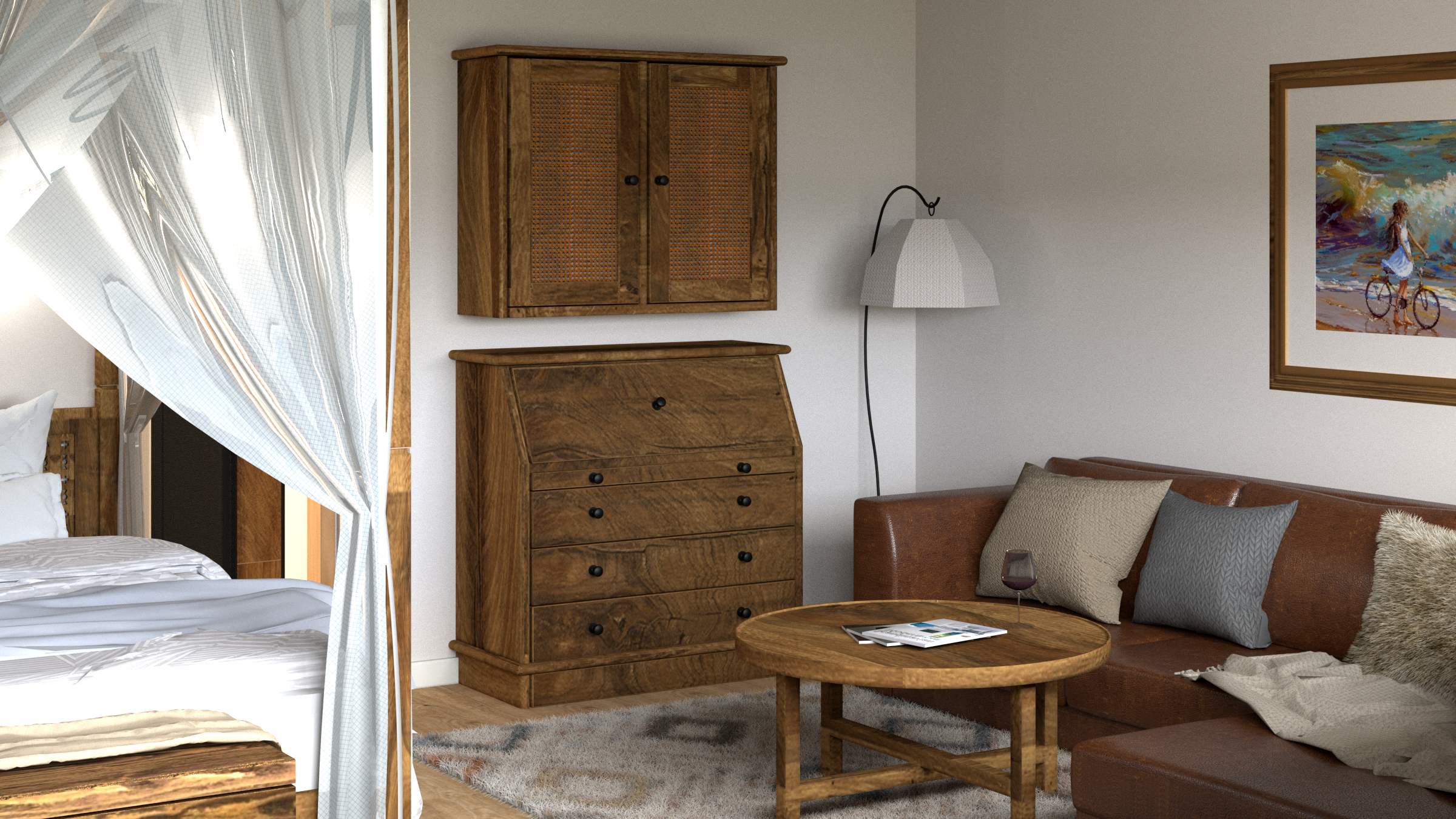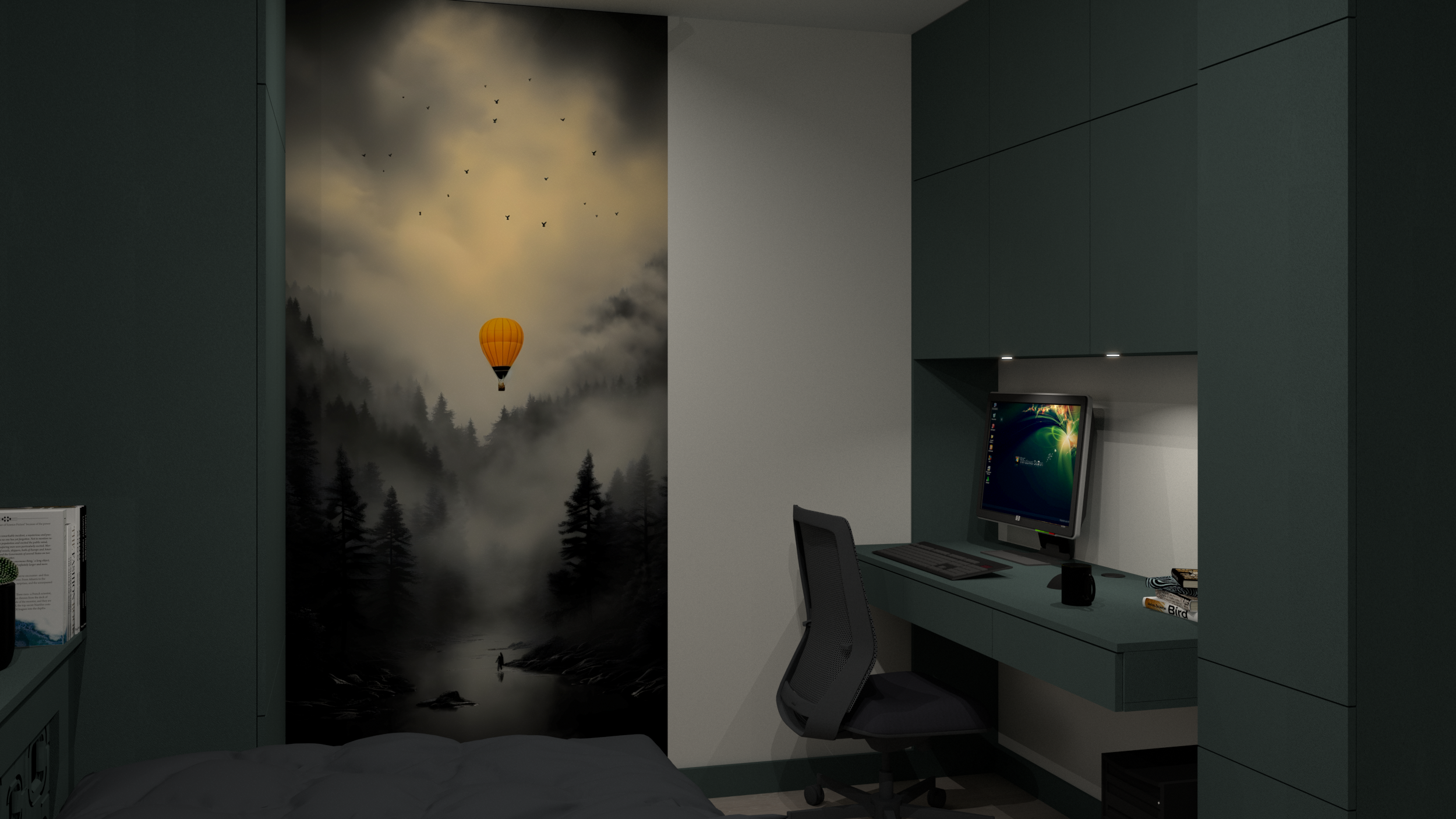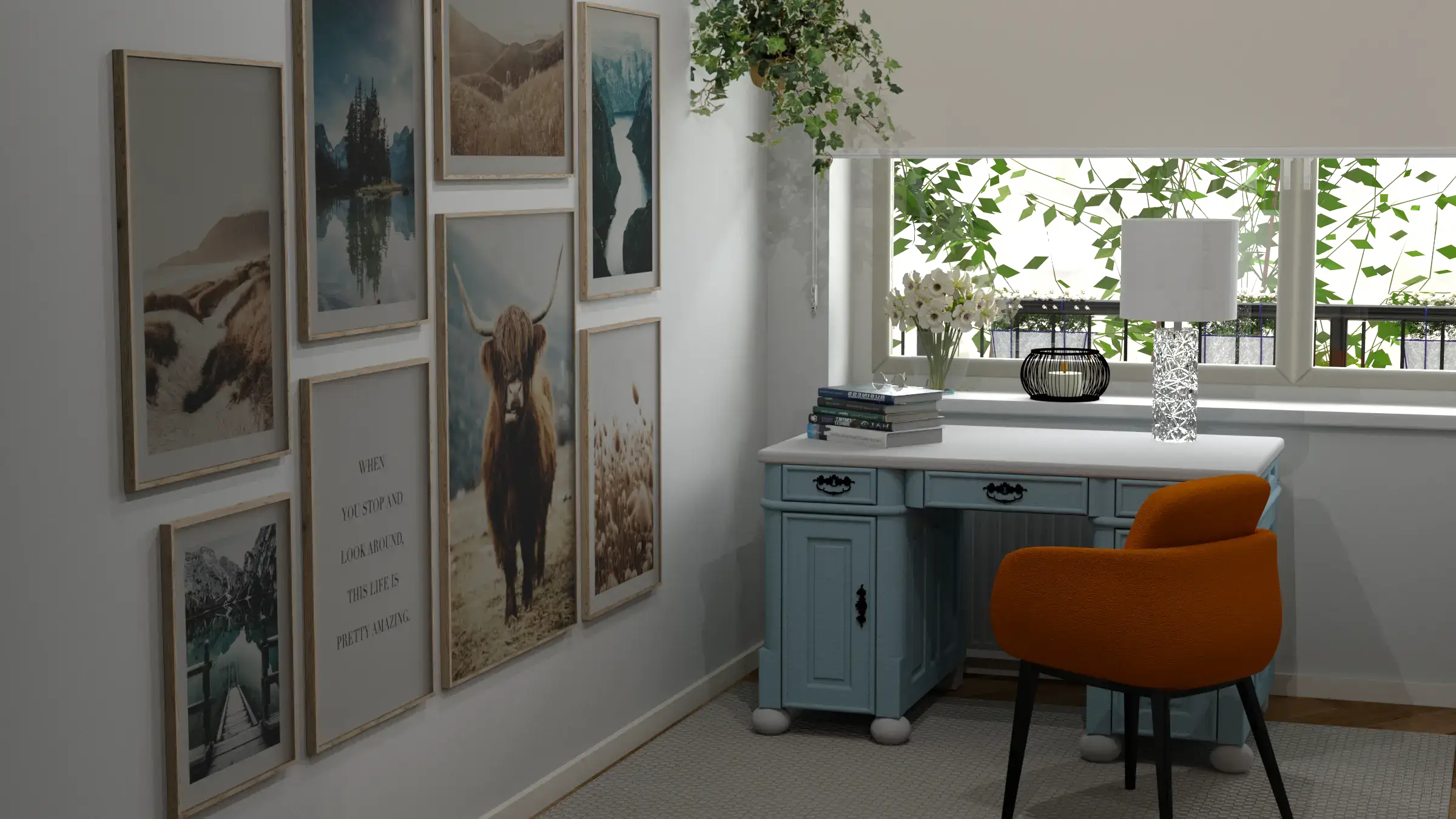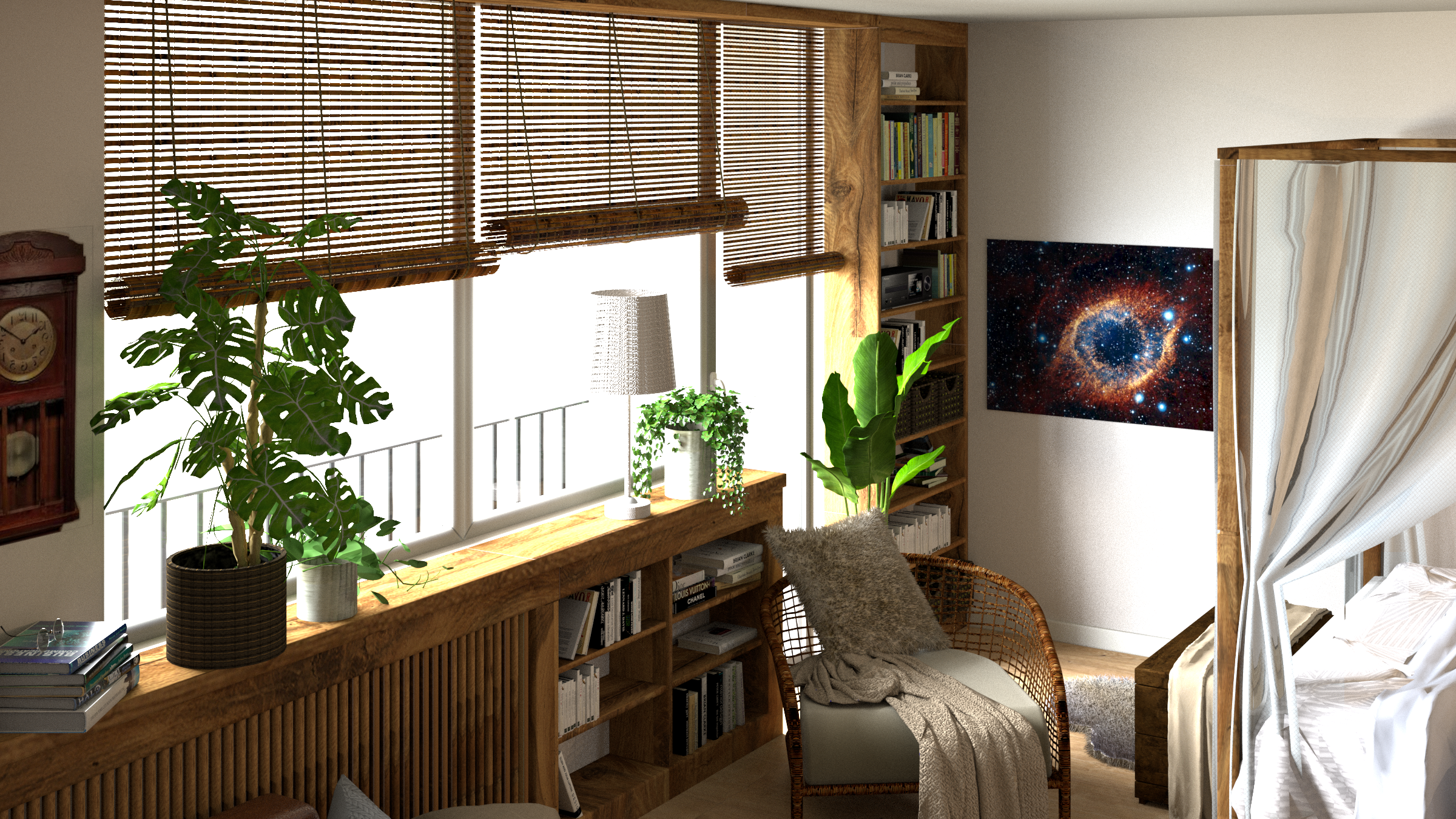 Na poddaszu utworzono dodatkowy pokój pracy z wygodnym fotelem i biurkiem na oryginalnej, metalowej nodze. Stworzone zostały dodatkowe półki na książki i szafka w zabudowie. Drzwi w szafie zajmującej całą ścianę zyskały na lekkości dzięki wstawkom z naturalnego rattanu.