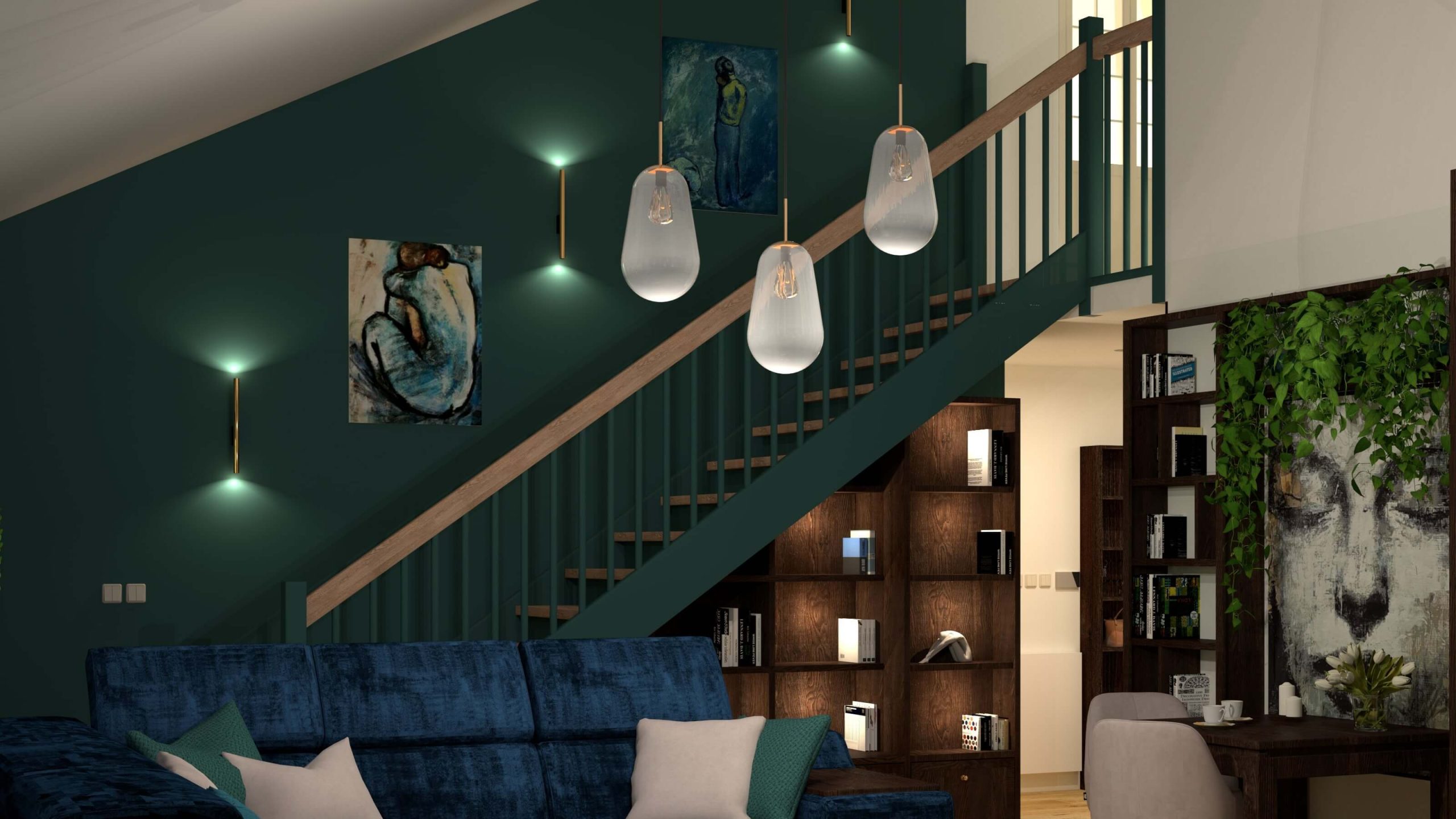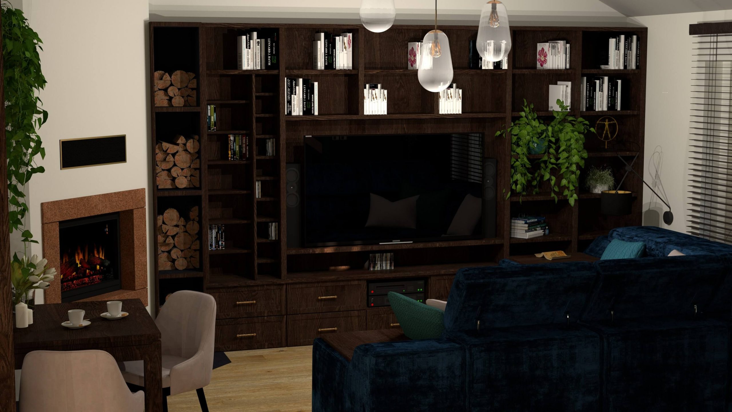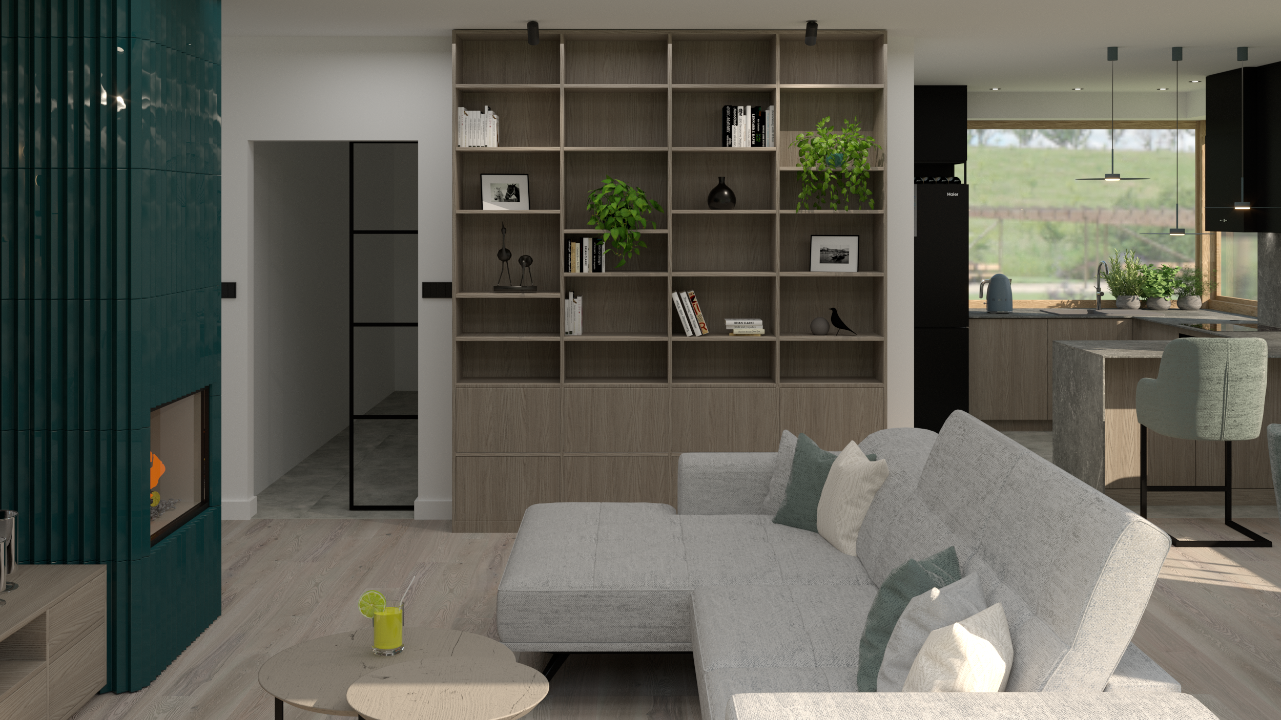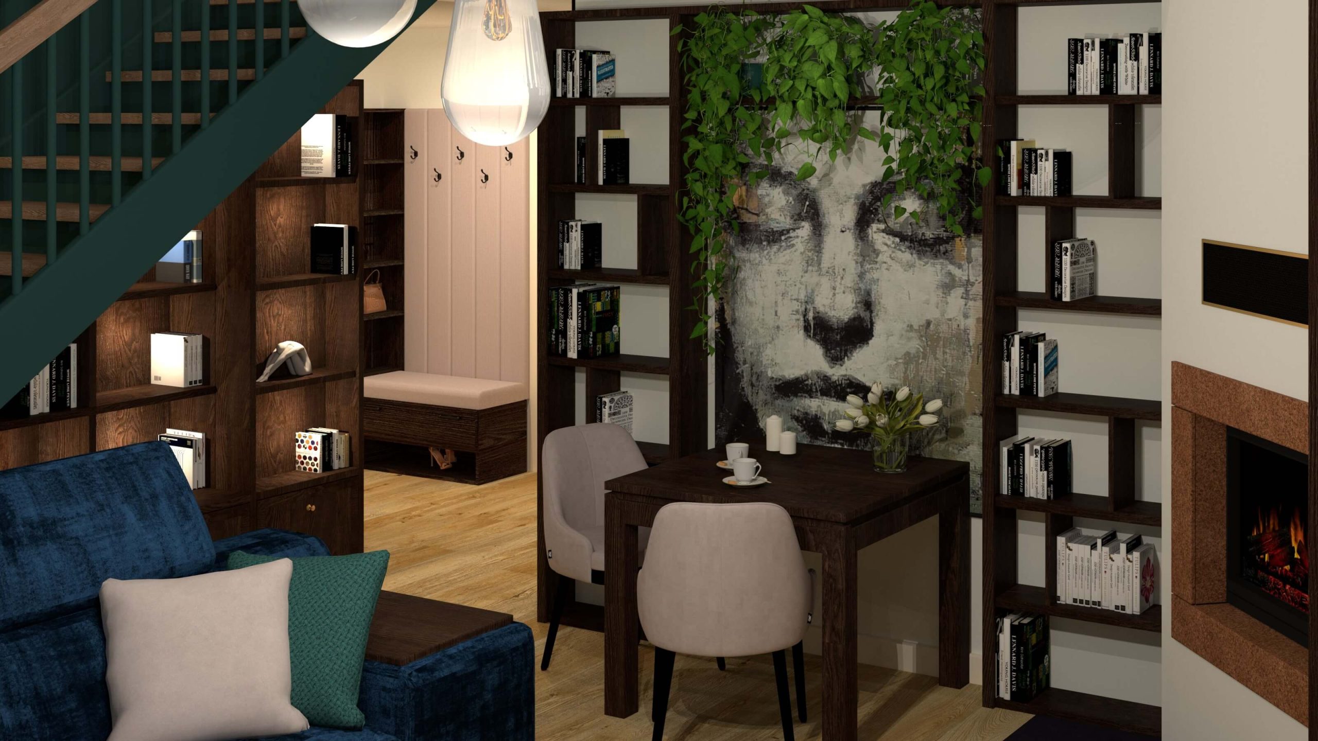 Projekt domu o powierzchni użytkowej 90 m2 dla małżeństwa, których pasją są książki, filmy i muzyka. Projektowane pomieszczenia zyskały na charakterze i nowoczesności. Stały się przytulne i eleganckie, a przede wszystkim funkcjonalne poprzez podział na strefy i utworzenie dodatkowych miejsc do przechowywania. Małe okna w połączeniu z otaczającą je zielenią nie dawały szans na światło dzienne, więc stworzono klimatyczne wnętrza „klubowe”, doświetlane sztucznym światłem. Zaprojektowano szereg regałów i półek, aby pomieścić domowe księgozbiory, płyty i filmy.