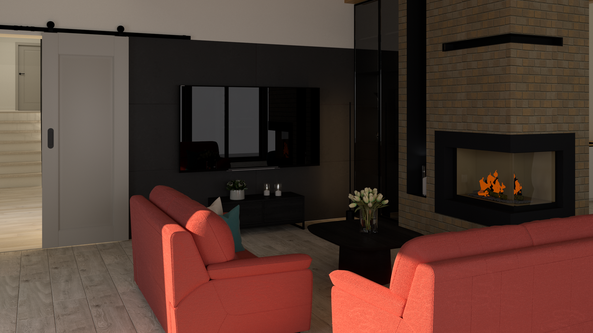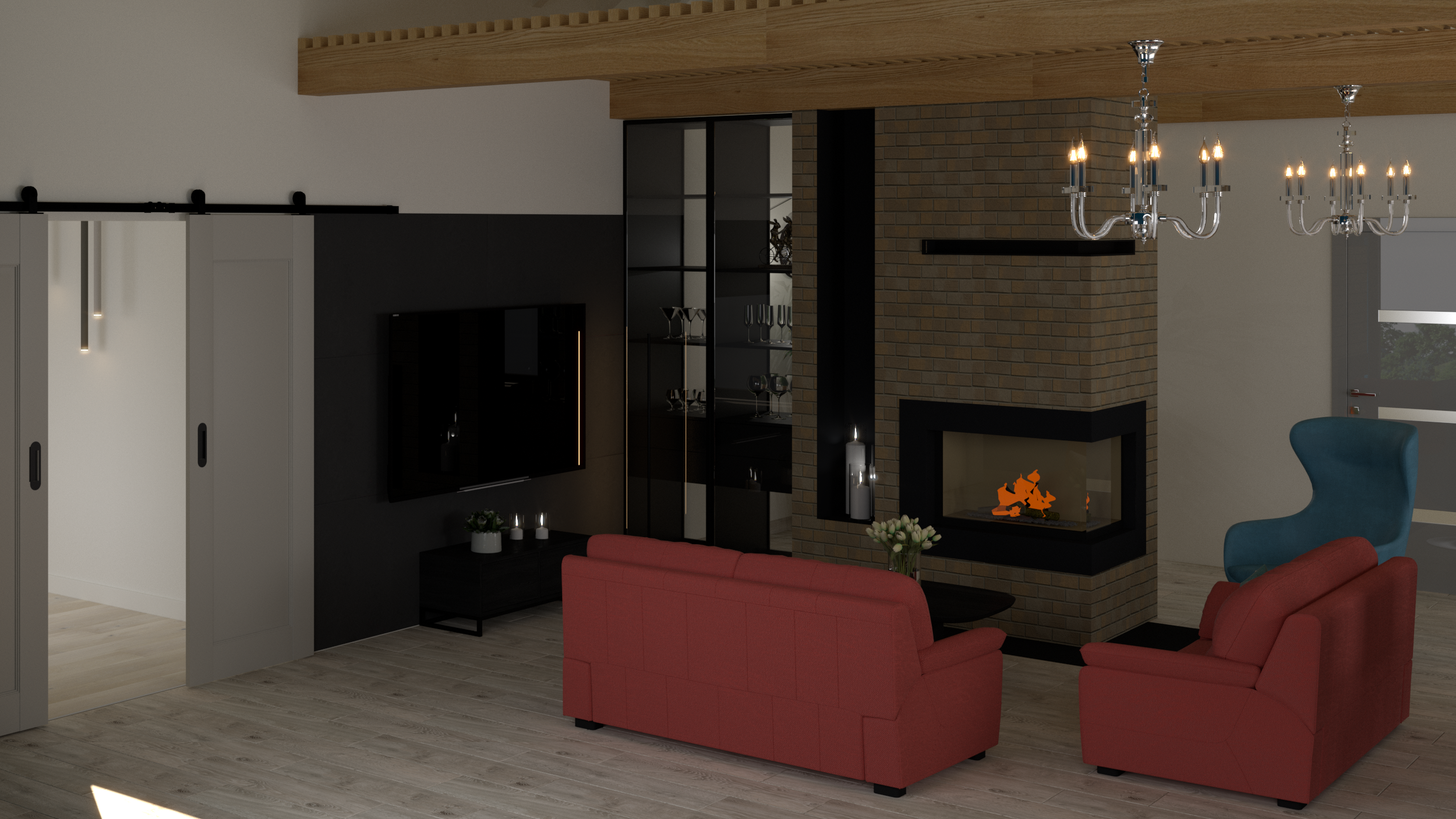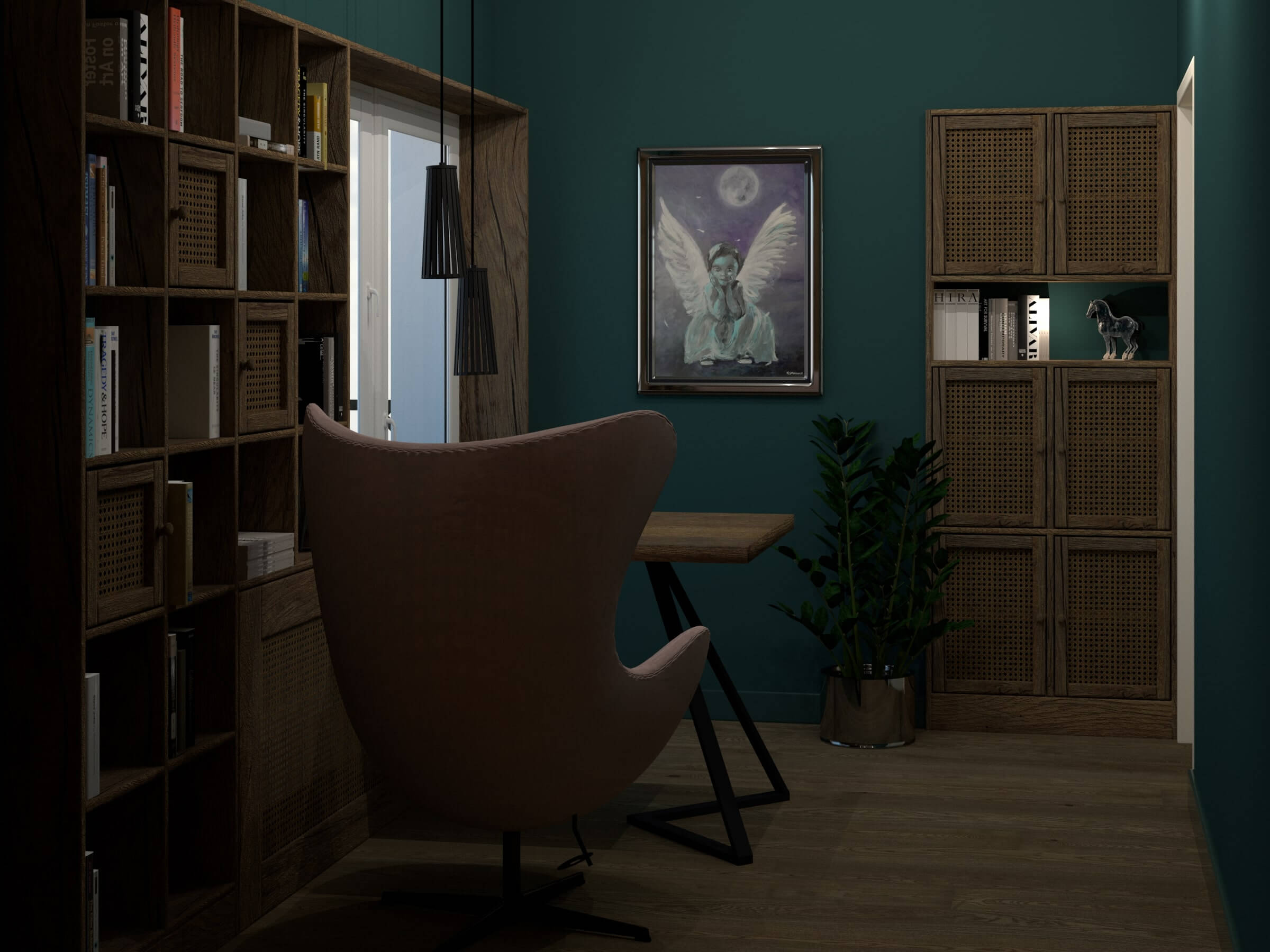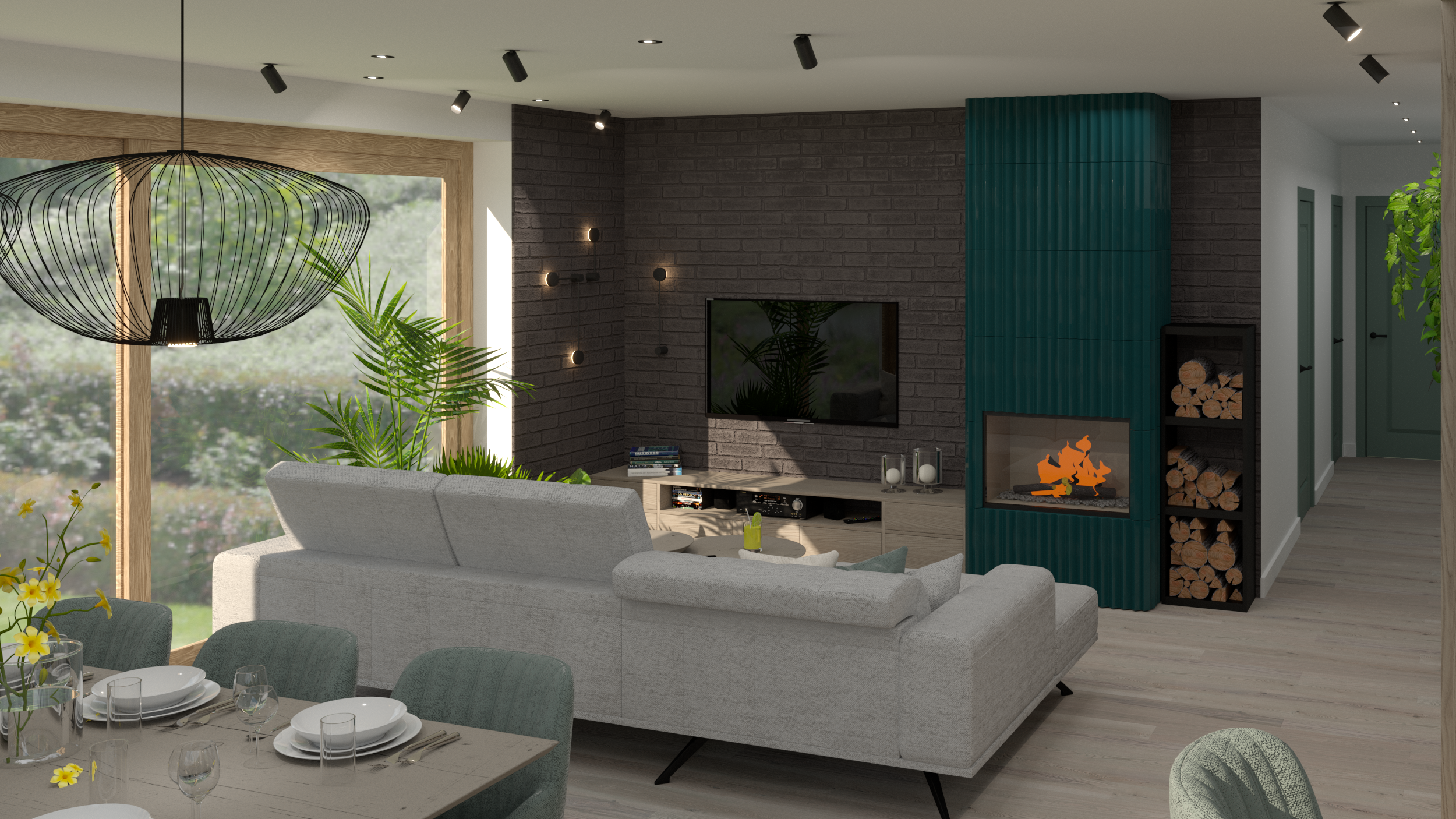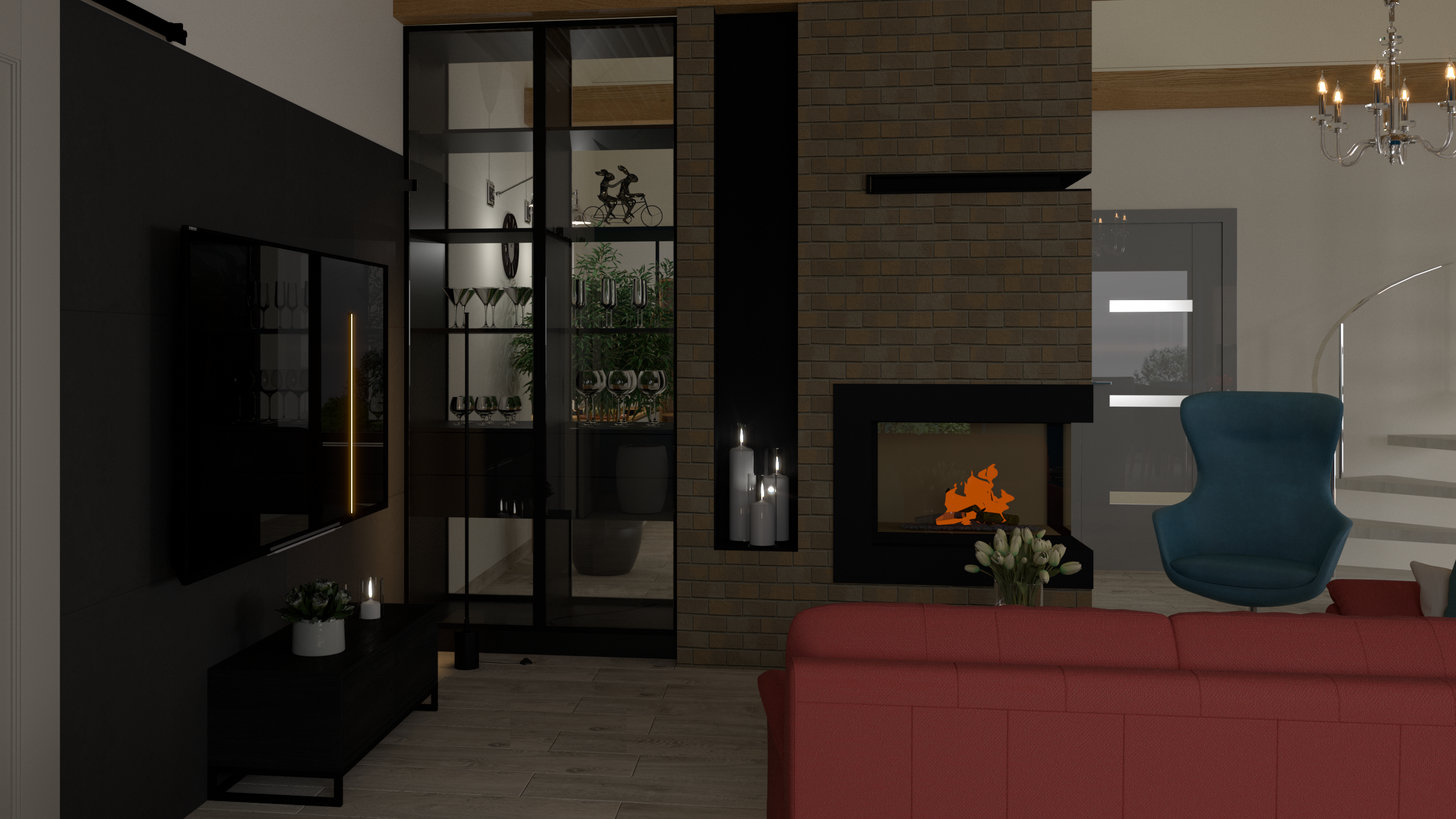 Projekt domu o powierzchni użytkowej 90 m2 dla małżeństwa, których pasją są książki, filmy i muzyka. Projektowane pomieszczenia zyskały na charakterze i nowoczesności. Stały się przytulne i eleganckie, a przede wszystkim funkcjonalne poprzez podział na strefy i utworzenie dodatkowych miejsc do przechowywania. Małe okna w połączeniu z otaczającą je zielenią nie dawały szans na światło dzienne, więc stworzono klimatyczne wnętrza „klubowe”, doświetlane sztucznym światłem. Zaprojektowano szereg regałów i półek, aby pomieścić domowe księgozbiory, płyty i filmy.