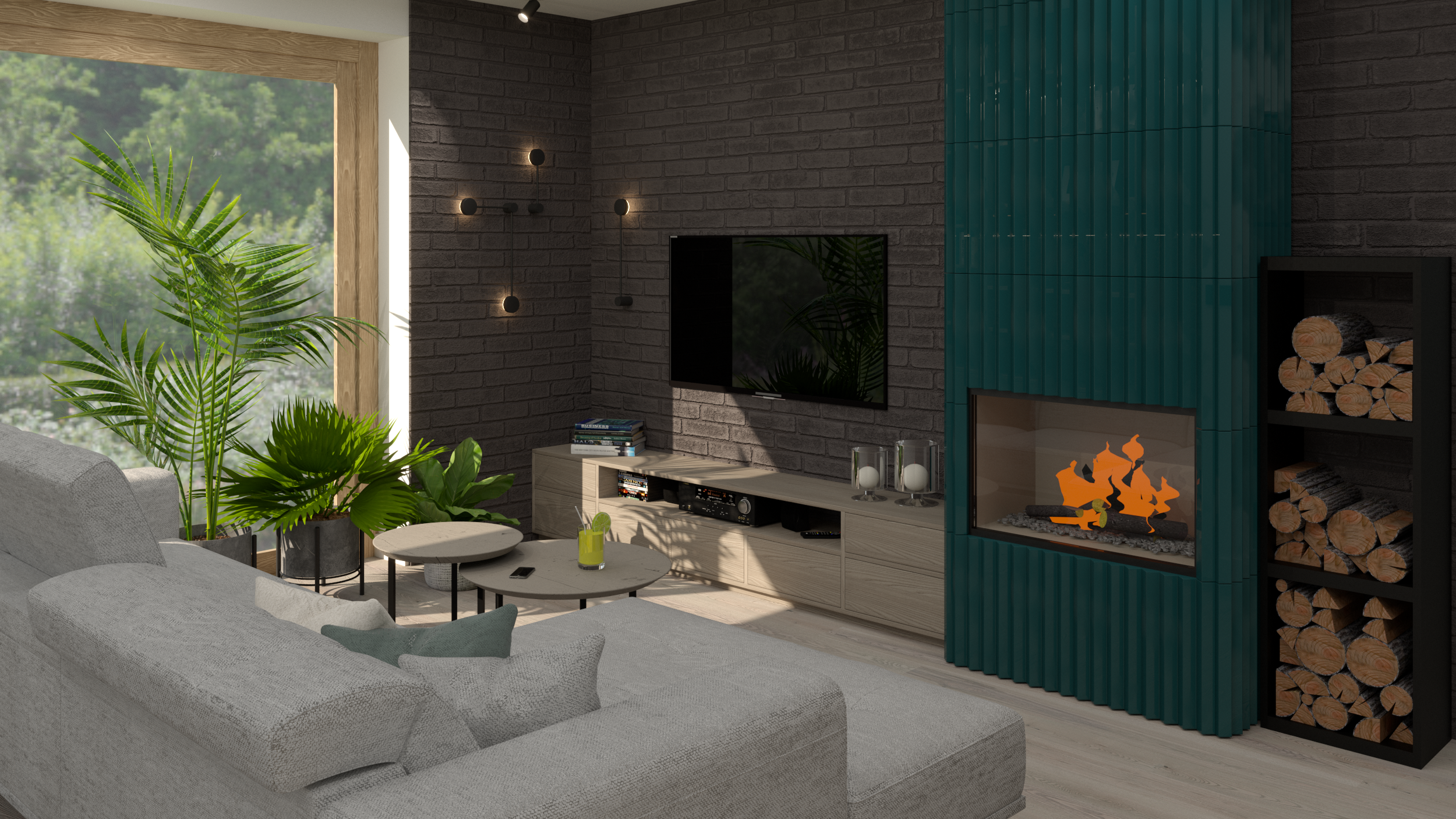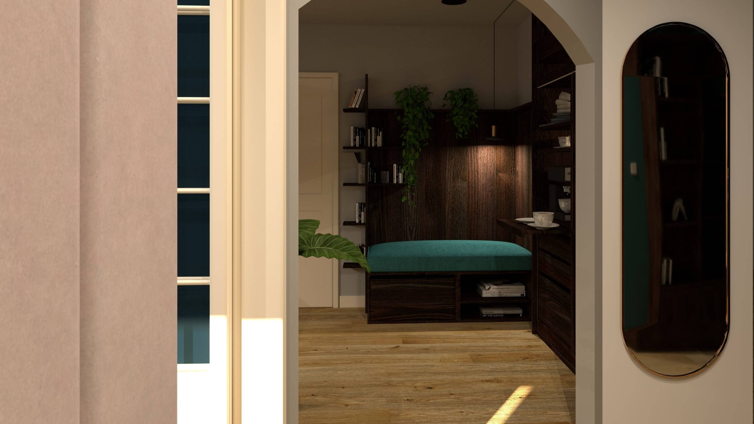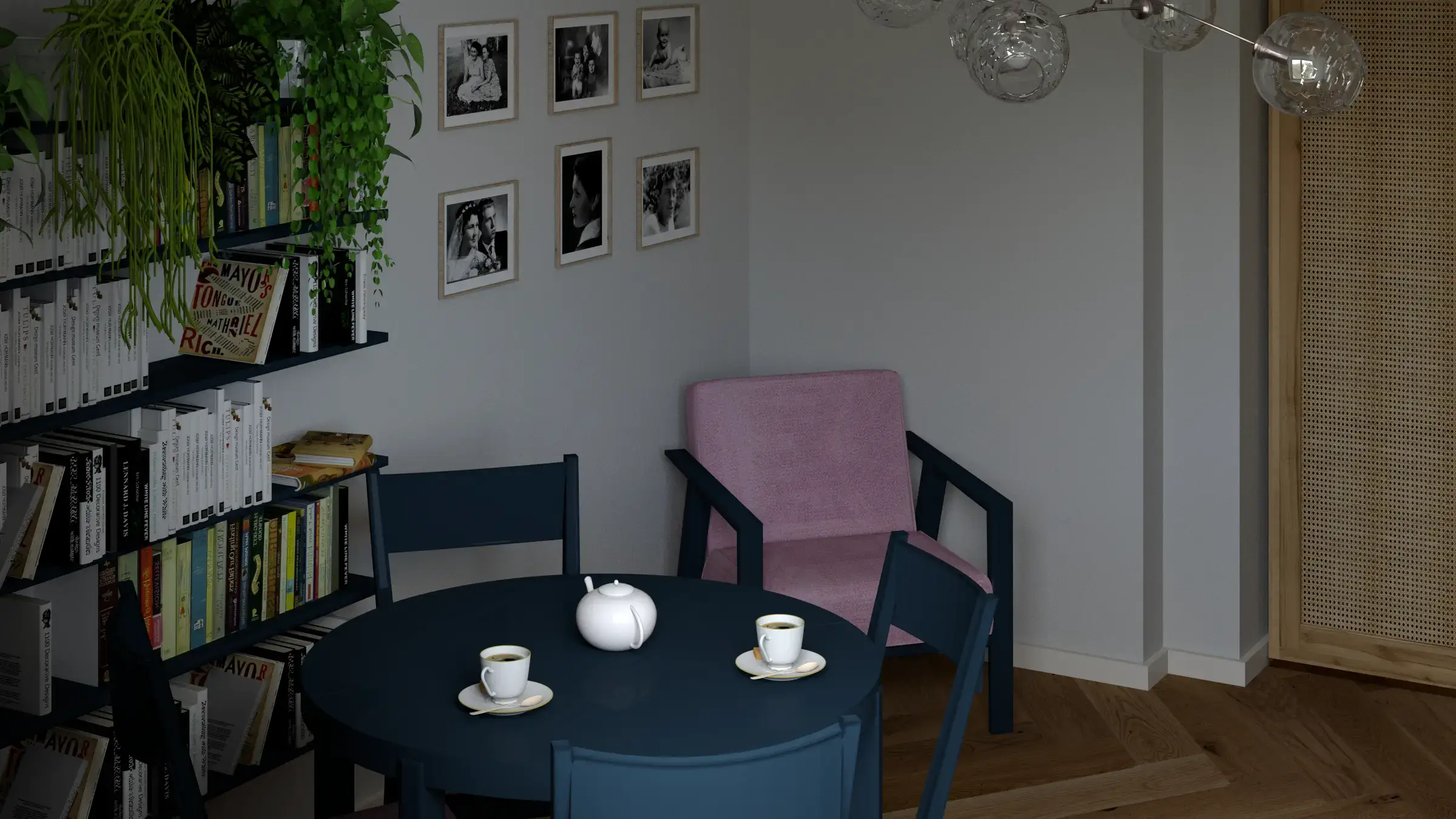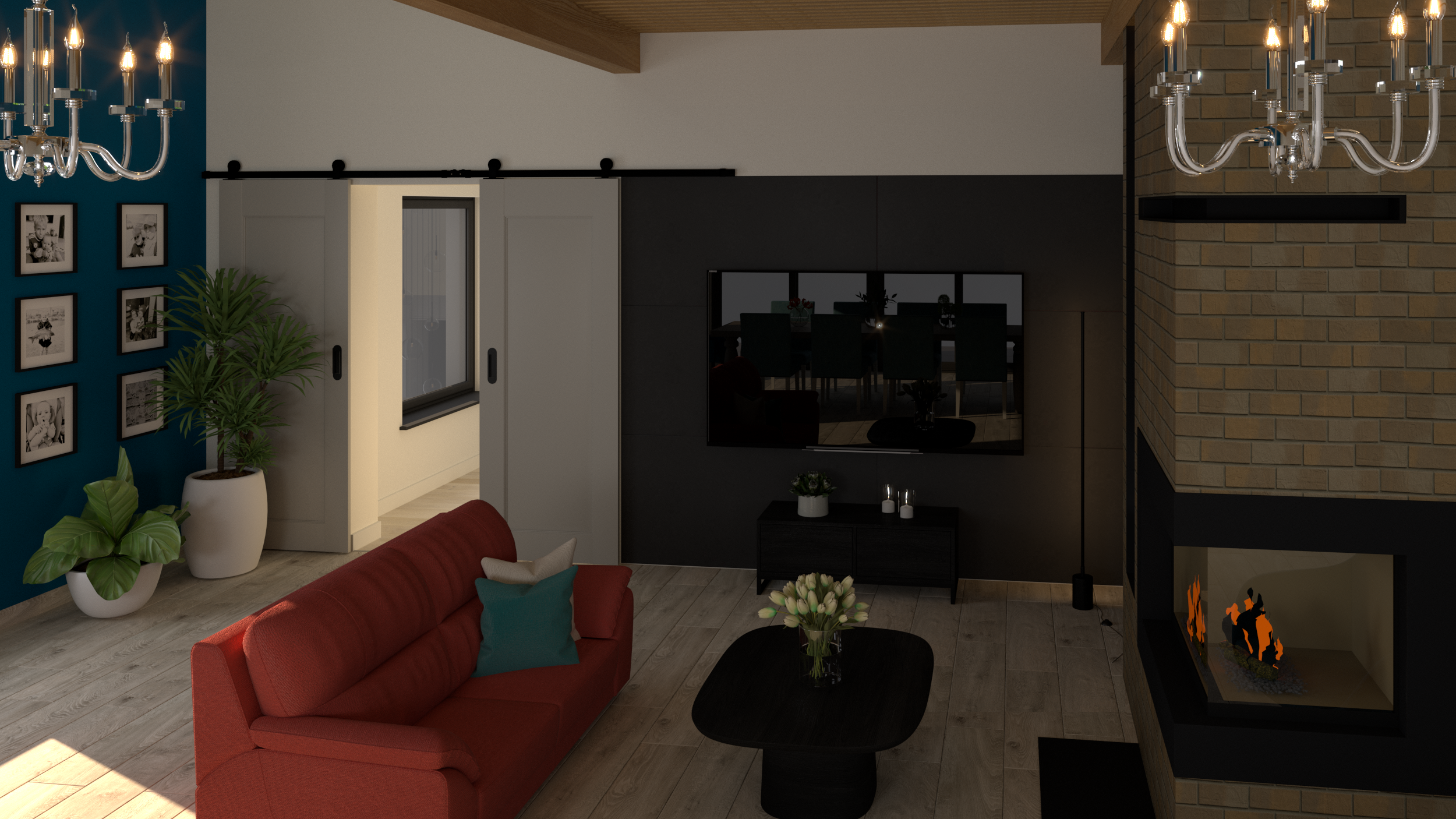 Projekt domu o powierzchni użytkowej 90 m2 dla małżeństwa, których pasją są książki, filmy i muzyka. Projektowane pomieszczenia zyskały na charakterze i nowoczesności. Stały się przytulne i eleganckie, a przede wszystkim funkcjonalne poprzez podział na strefy i utworzenie dodatkowych miejsc do przechowywania. Małe okna w połączeniu z otaczającą je zielenią nie dawały szans na światło dzienne, więc stworzono klimatyczne wnętrza „klubowe”, doświetlane sztucznym światłem. Zaprojektowano szereg regałów i półek, aby pomieścić domowe księgozbiory, płyty i filmy.