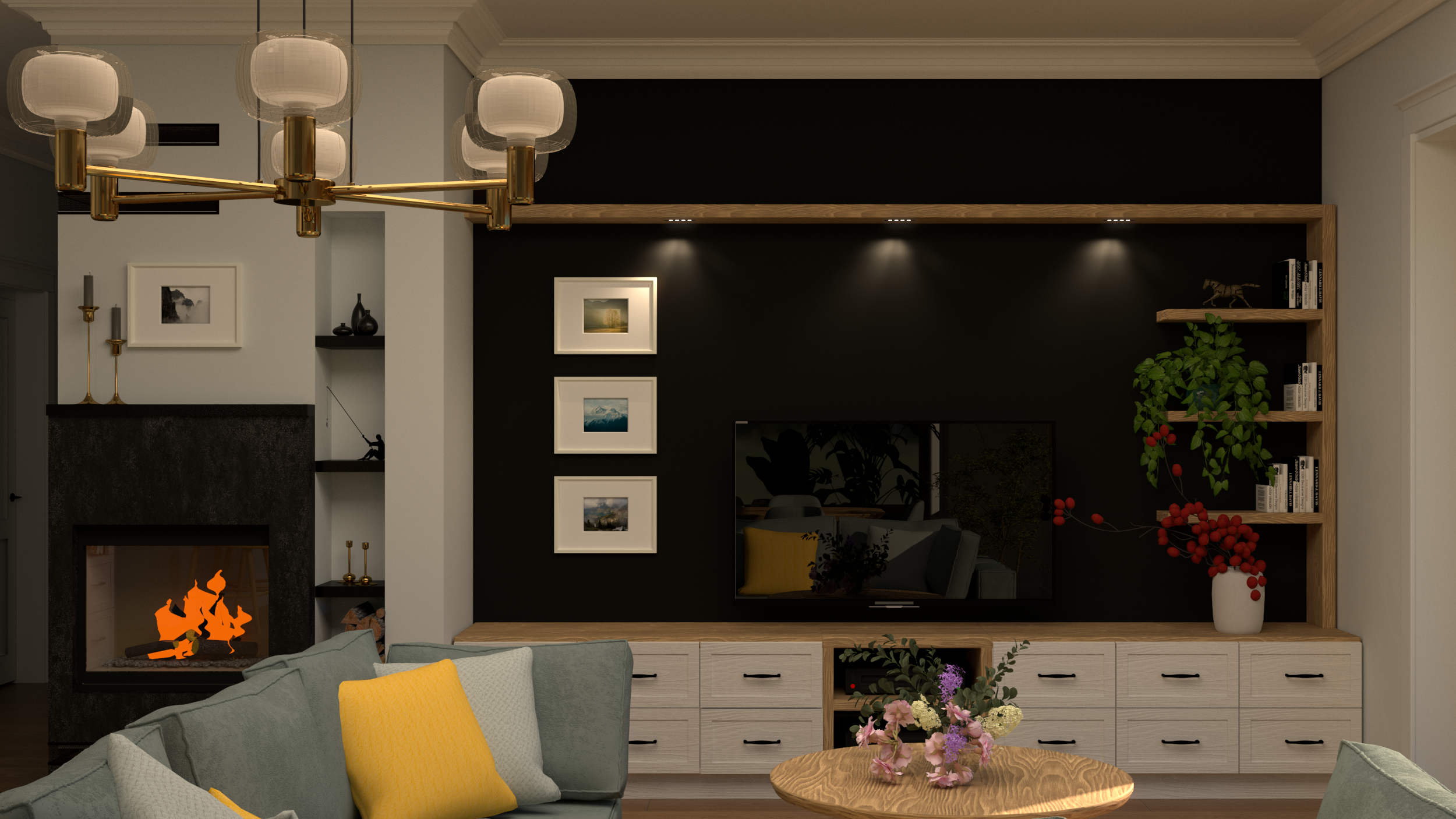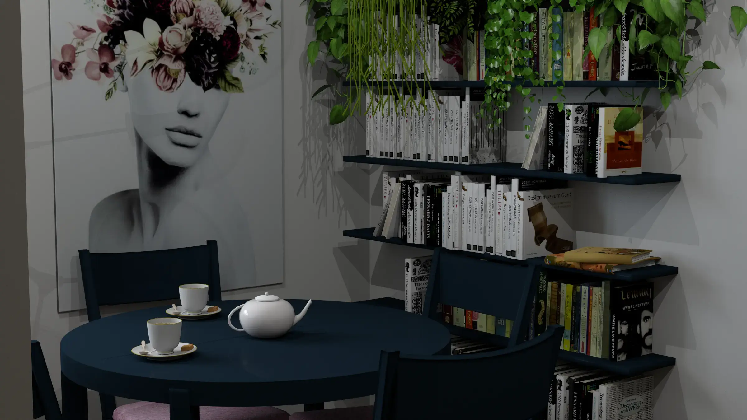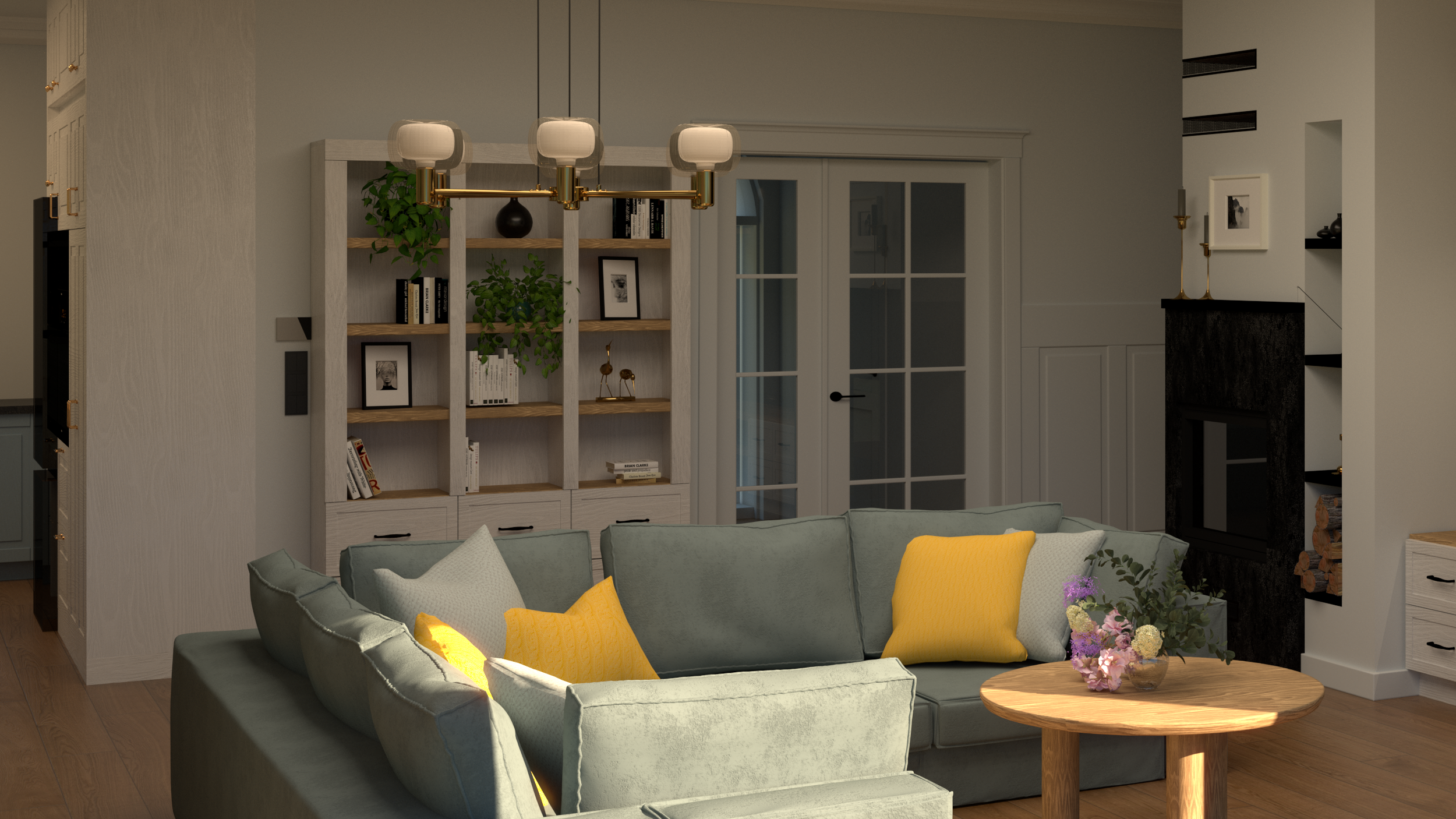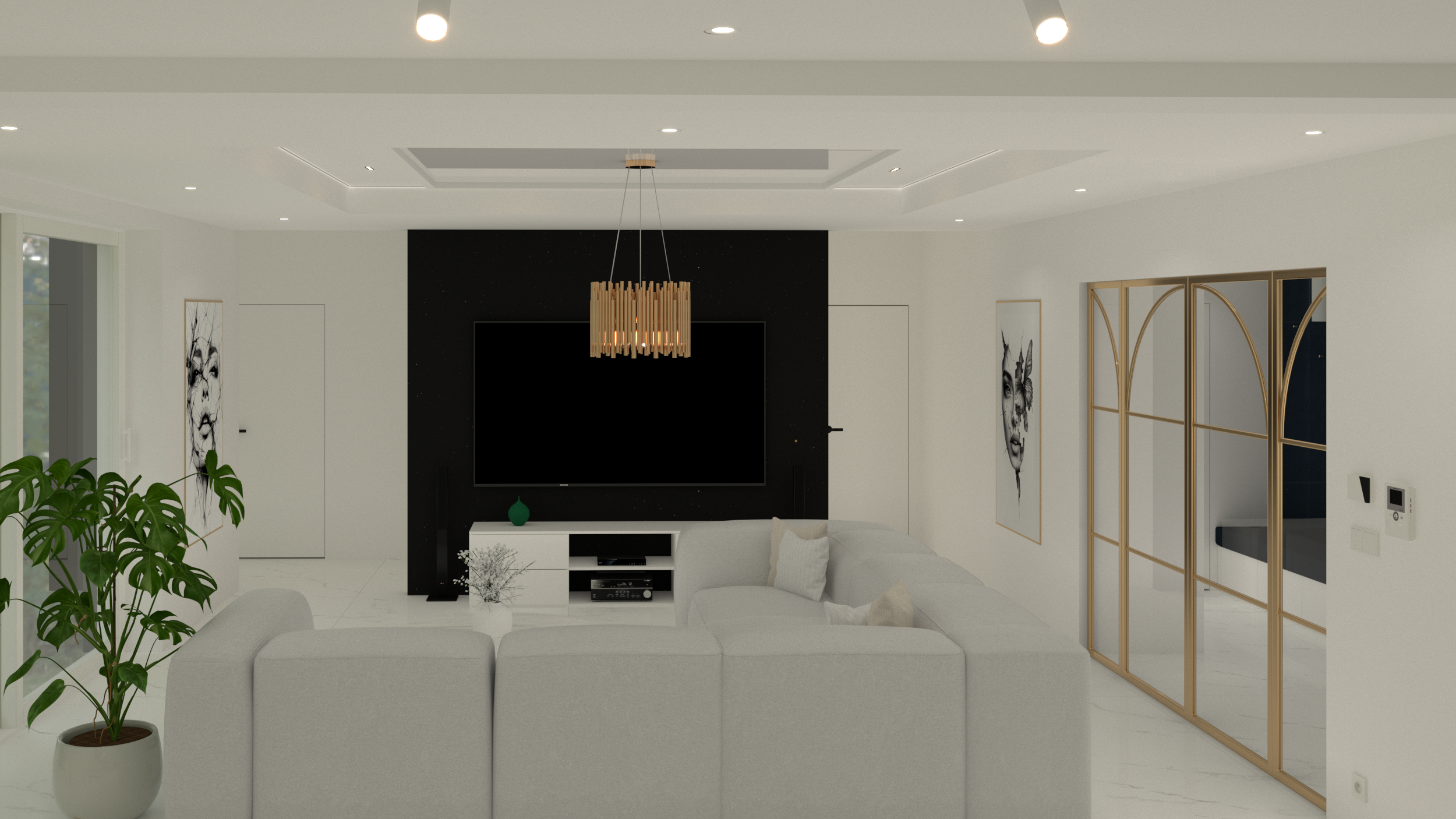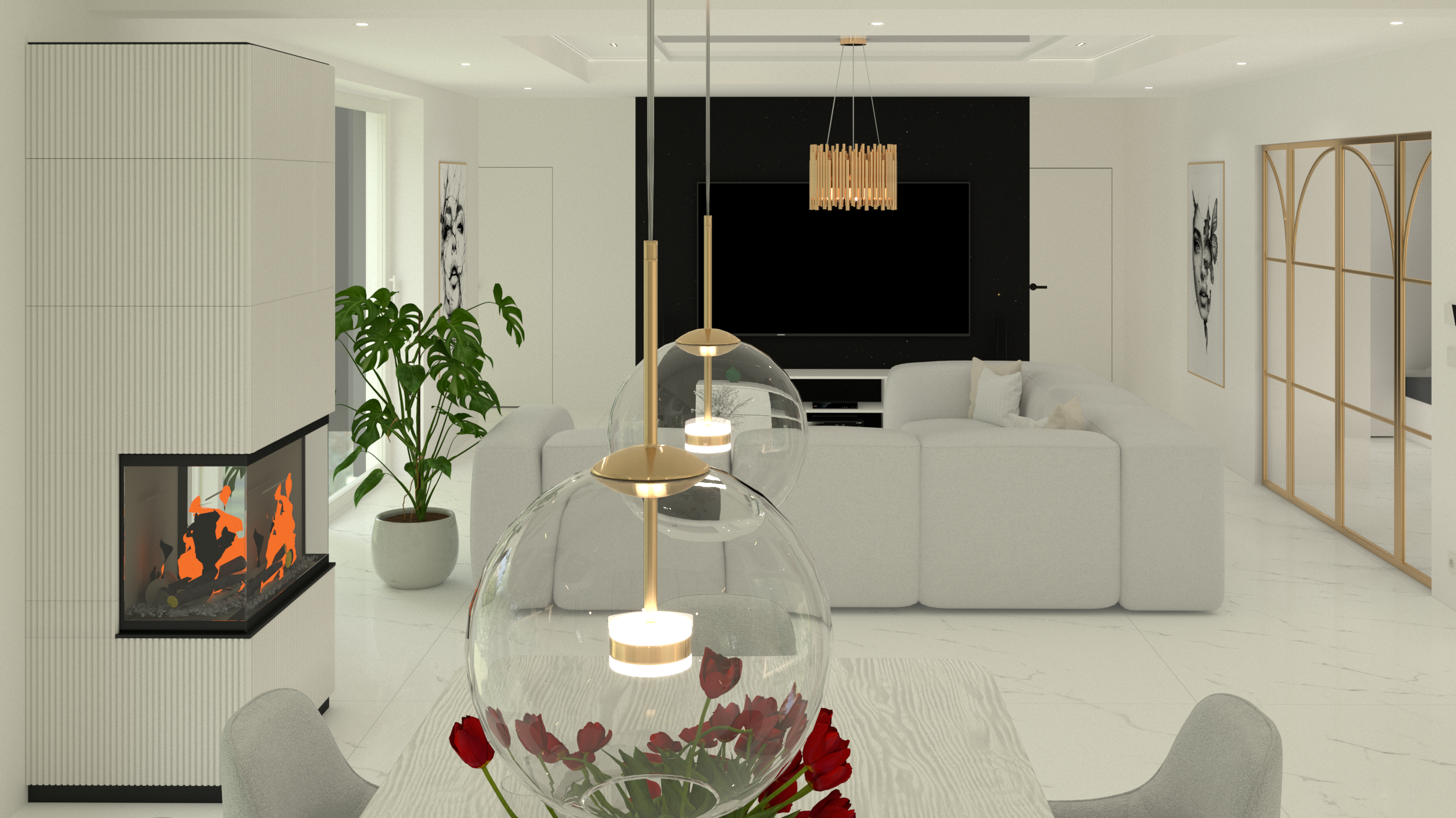 Projekt domu o powierzchni użytkowej 90 m2 dla małżeństwa, których pasją są książki, filmy i muzyka. Projektowane pomieszczenia zyskały na charakterze i nowoczesności. Stały się przytulne i eleganckie, a przede wszystkim funkcjonalne poprzez podział na strefy i utworzenie dodatkowych miejsc do przechowywania. Małe okna w połączeniu z otaczającą je zielenią nie dawały szans na światło dzienne, więc stworzono klimatyczne wnętrza „klubowe”, doświetlane sztucznym światłem. Zaprojektowano szereg regałów i półek, aby pomieścić domowe księgozbiory, płyty i filmy.