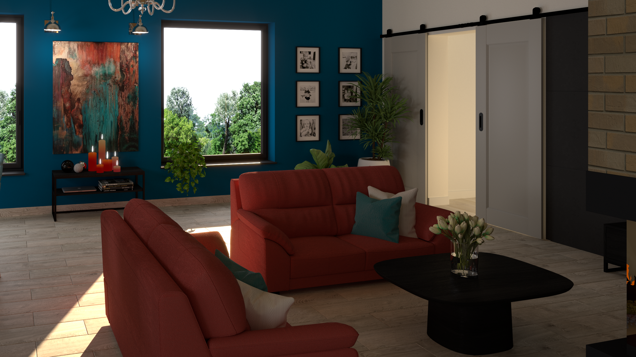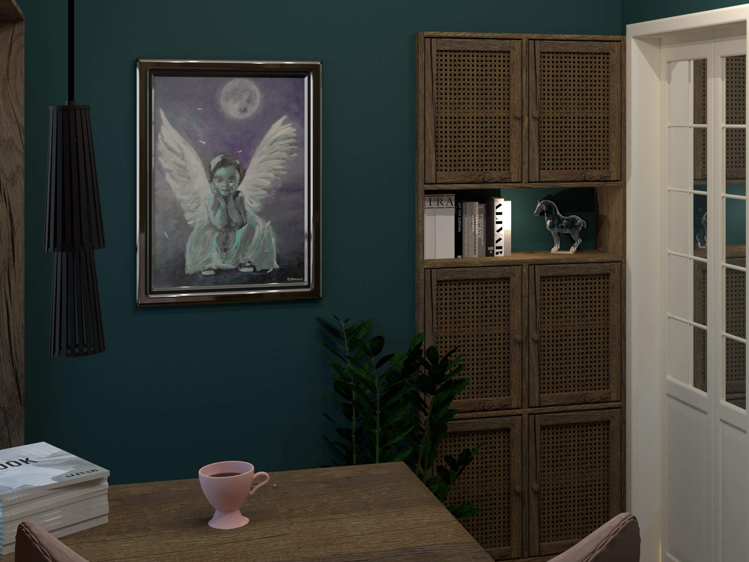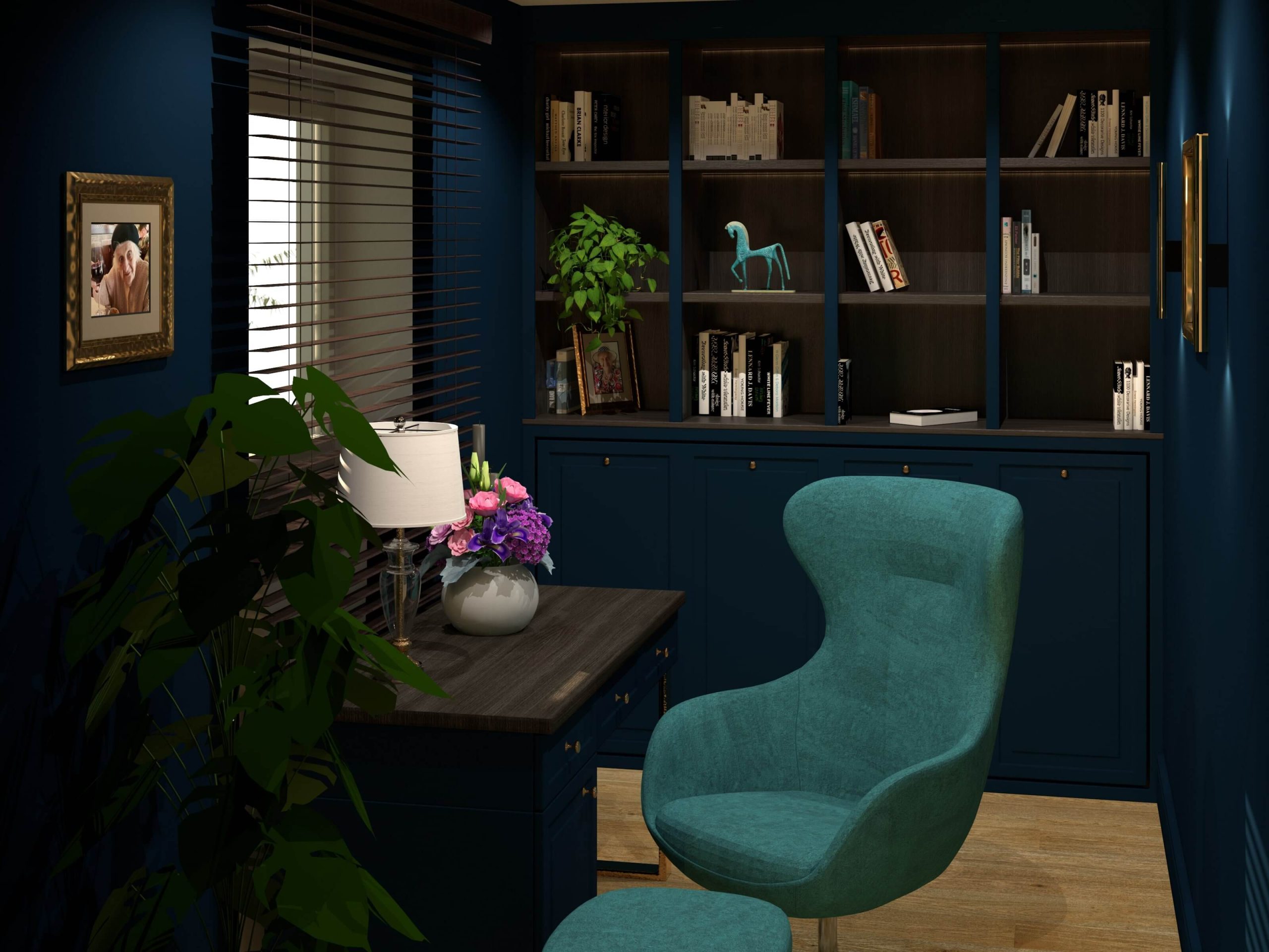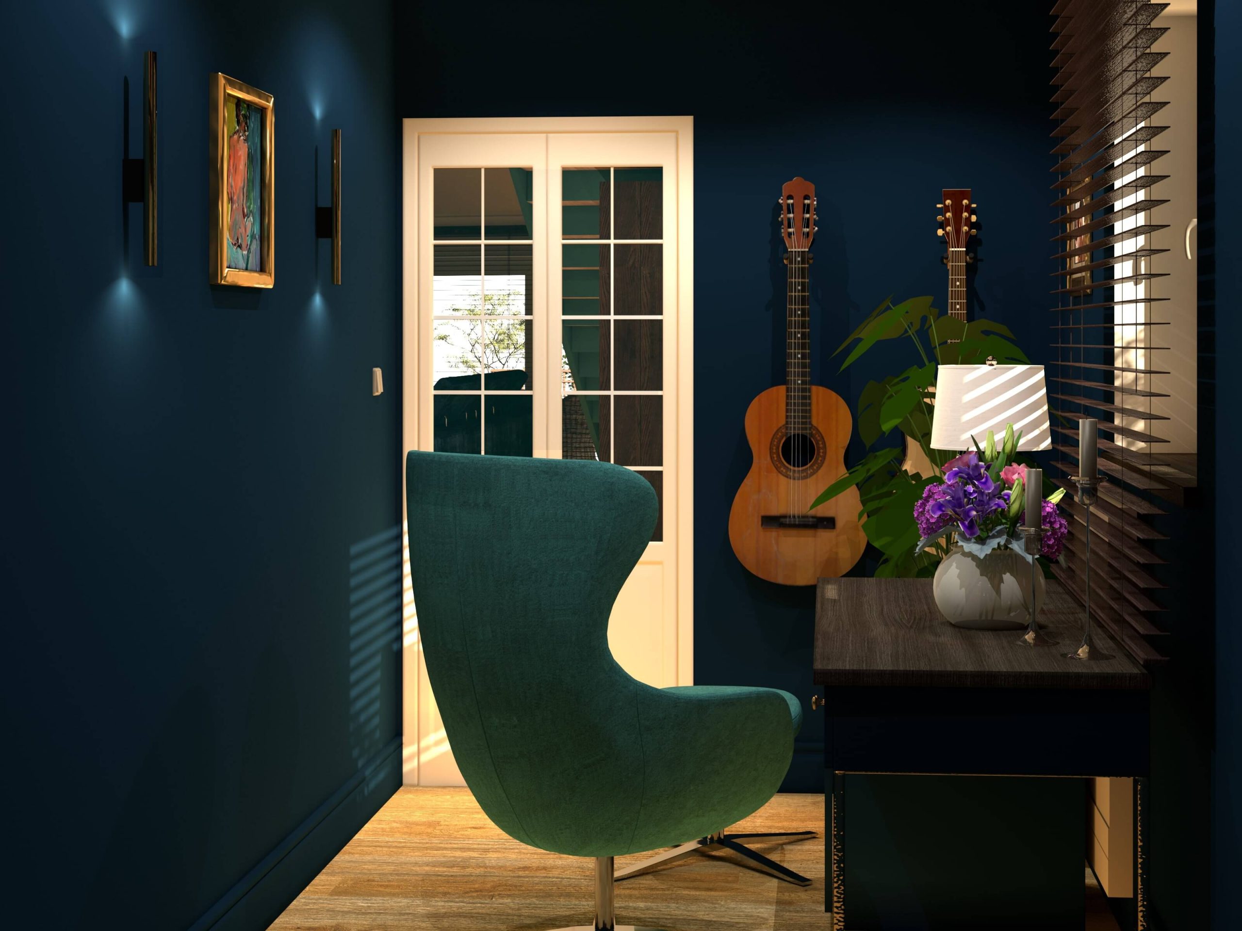 Projekt domu o powierzchni użytkowej 90 m2 dla małżeństwa, których pasją są książki, filmy i muzyka. Projektowane pomieszczenia zyskały na charakterze i nowoczesności. Stały się przytulne i eleganckie, a przede wszystkim funkcjonalne poprzez podział na strefy i utworzenie dodatkowych miejsc do przechowywania. Małe okna w połączeniu z otaczającą je zielenią nie dawały szans na światło dzienne, więc stworzono klimatyczne wnętrza „klubowe”, doświetlane sztucznym światłem. Zaprojektowano szereg regałów i półek, aby pomieścić domowe księgozbiory, płyty i filmy.