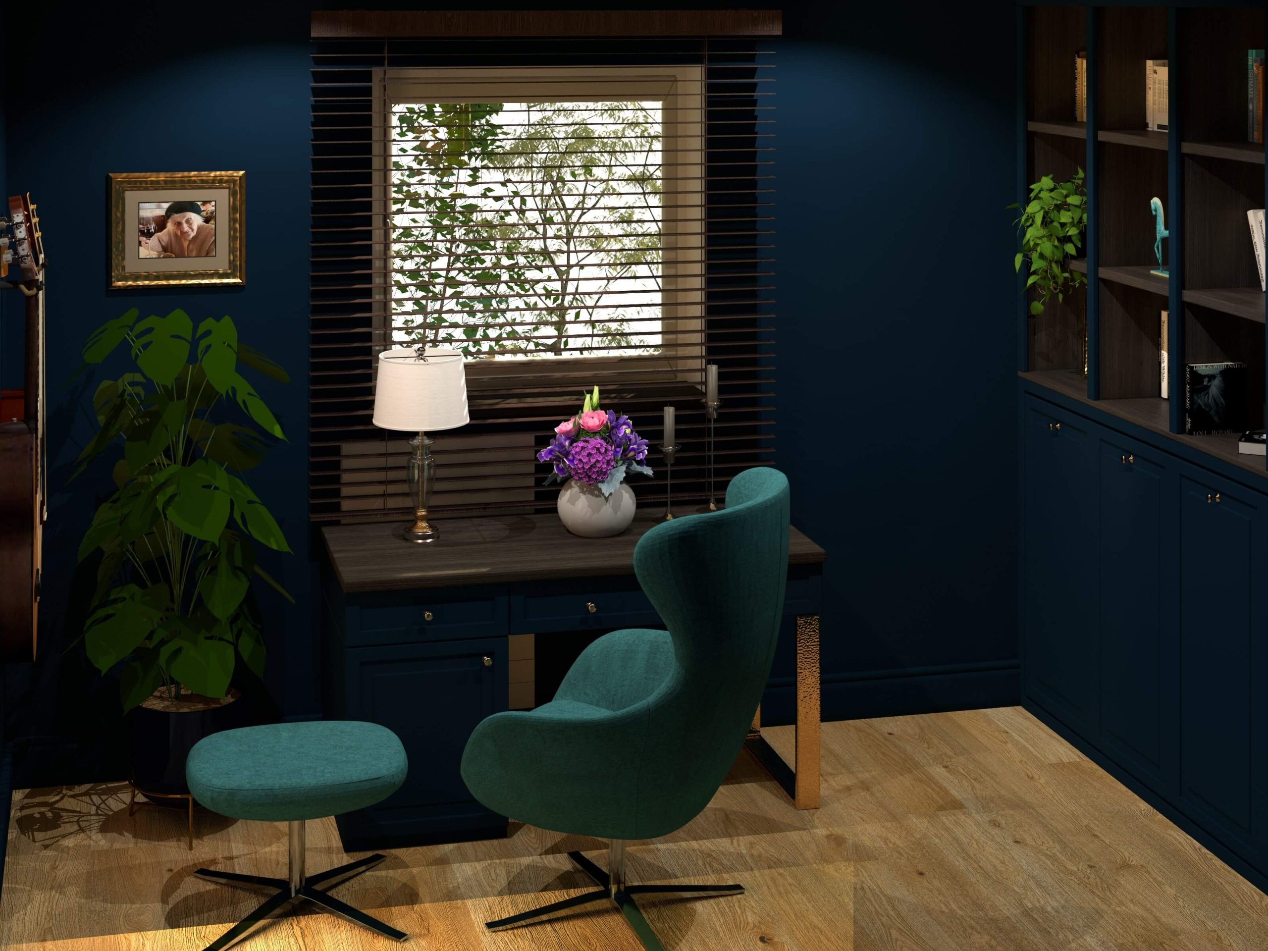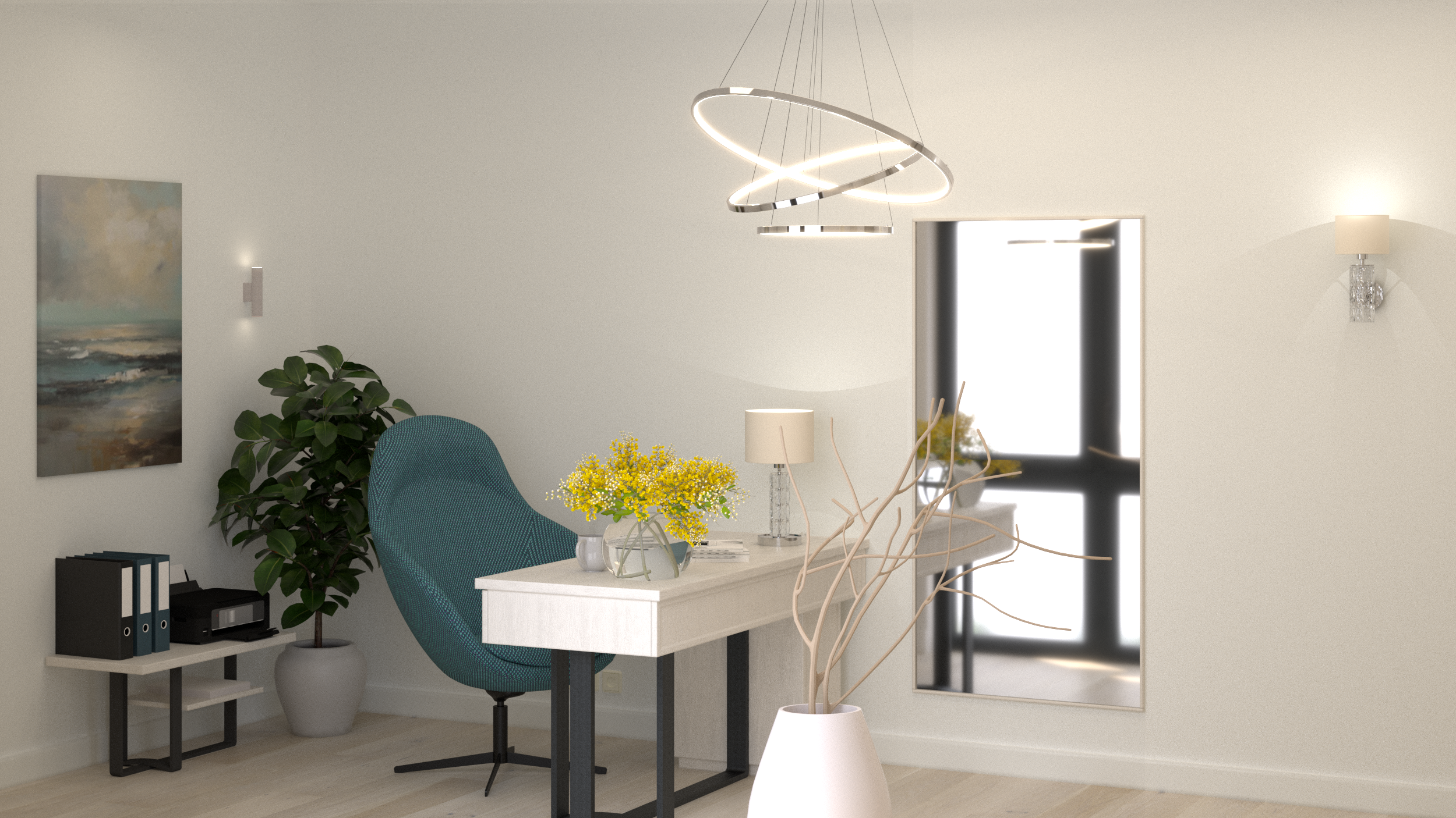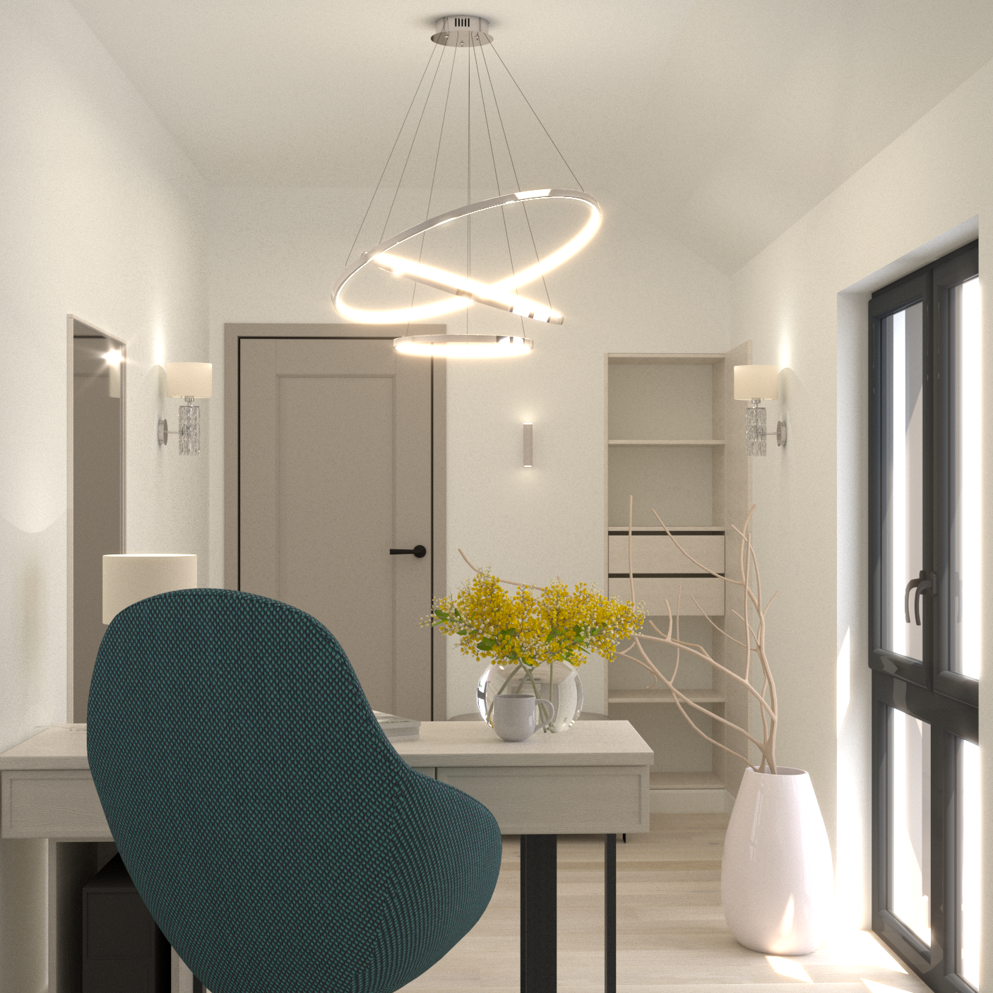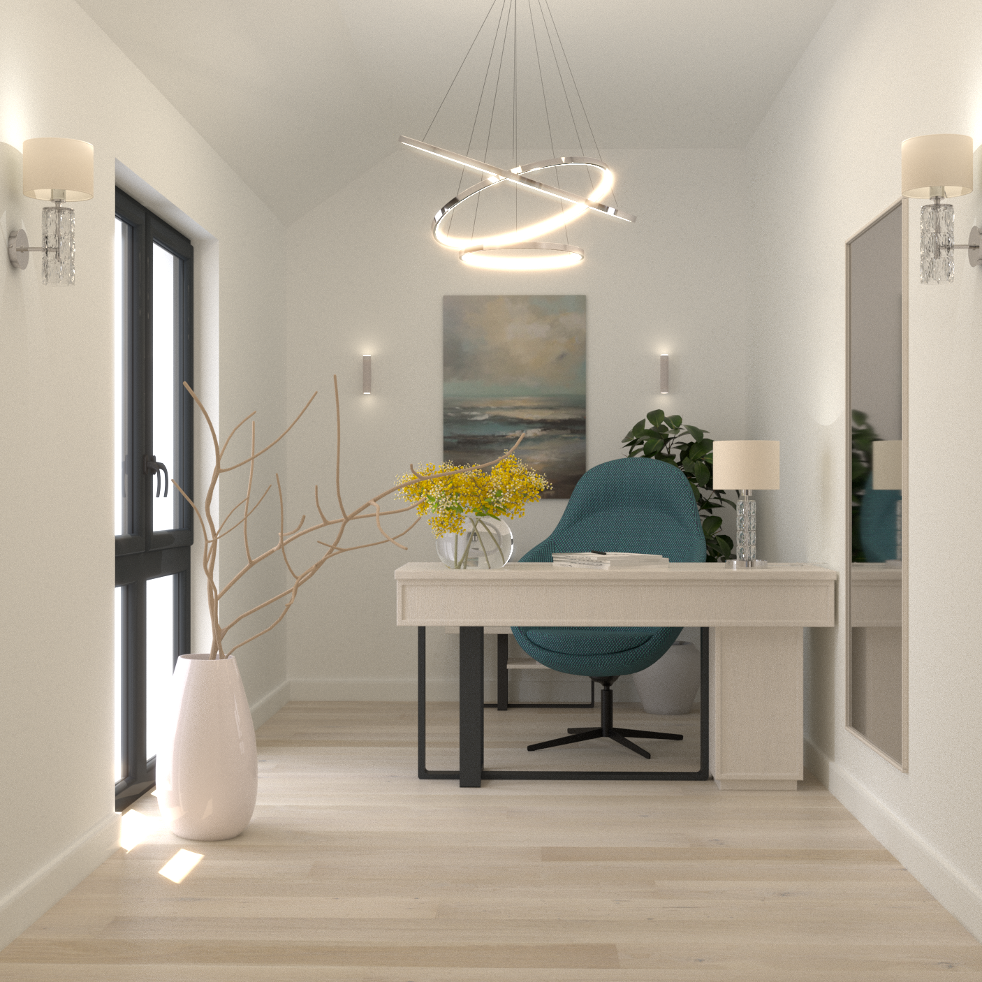Gabinet dla Pani domu, utrzymany w jasnej kolorystyce, z meblami zdobionymi elementami z ryflowanego drewna, biurko z chromowaną podstawą, wygodny fotel, ozdobne lampy.
