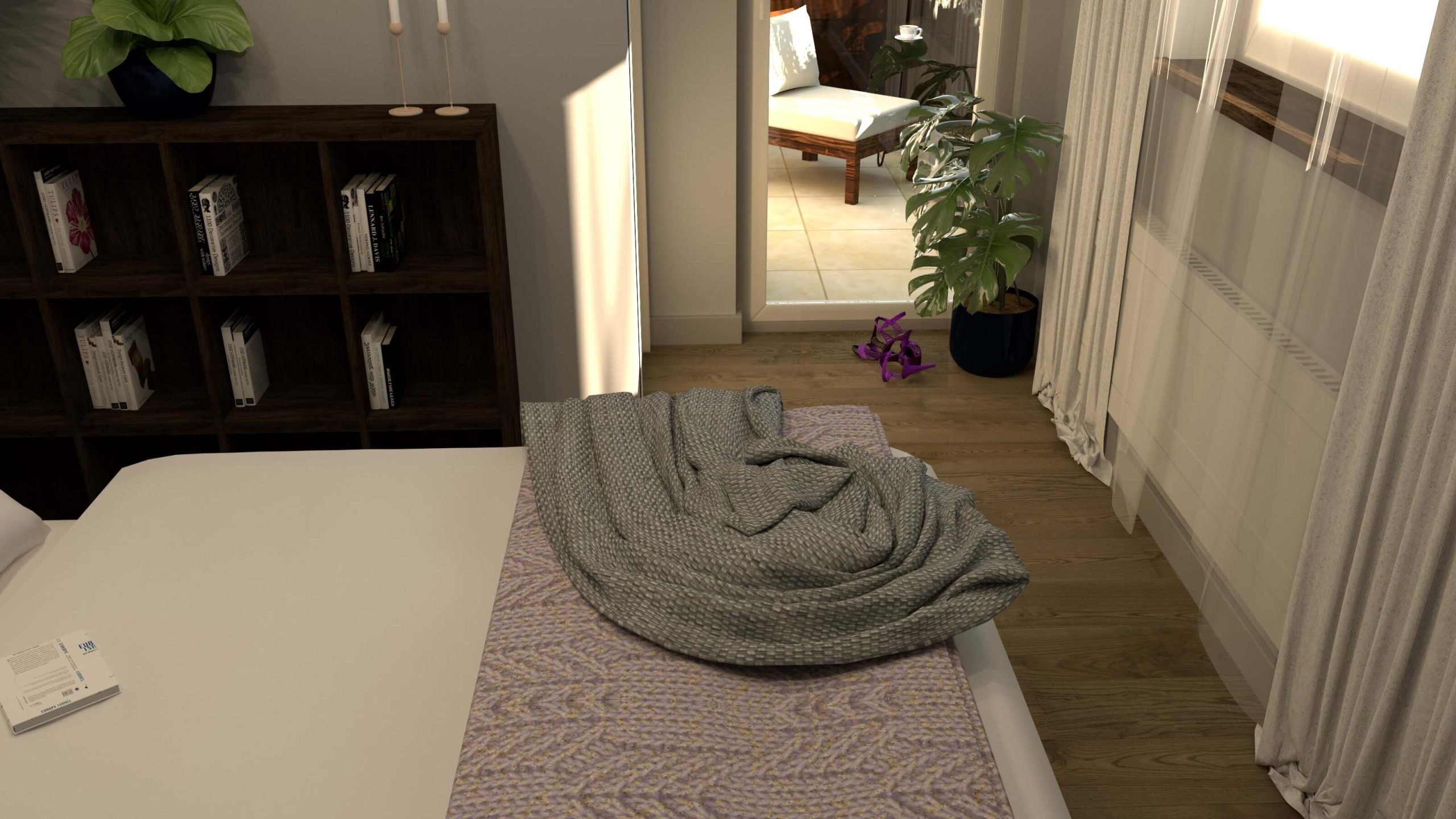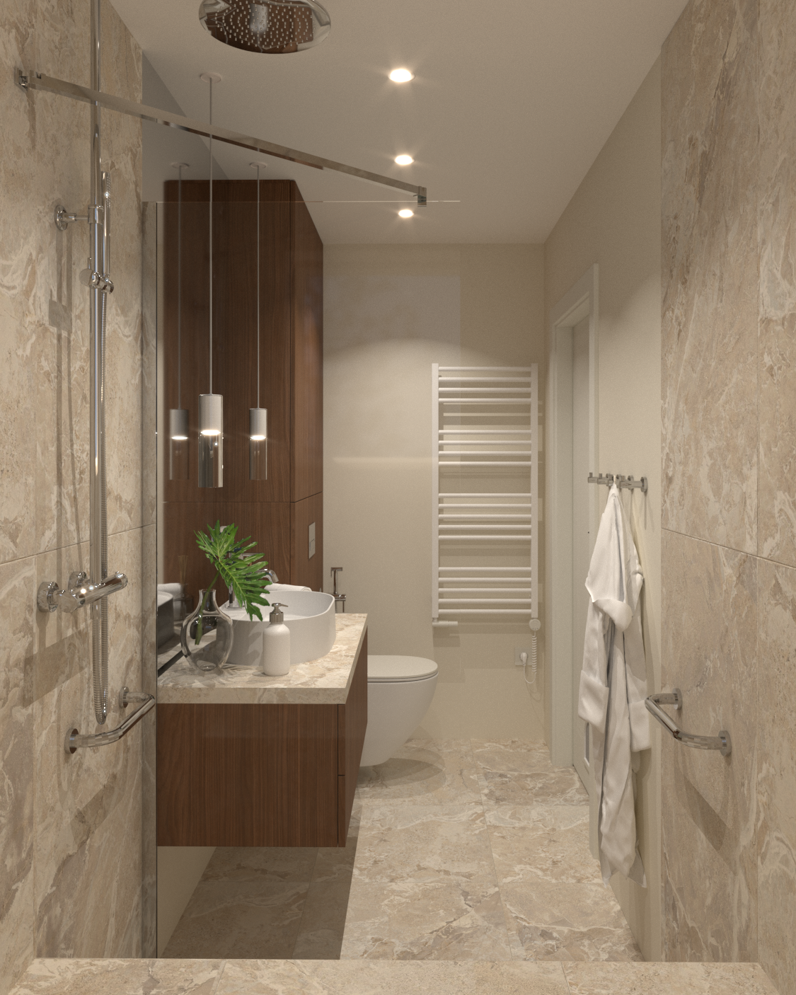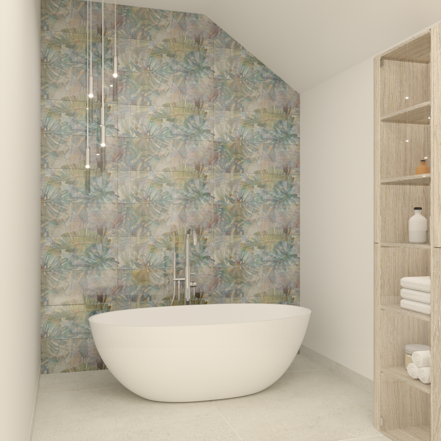 W łazience, na tle tropikalnego dekoru o stonowanej kolorystyce, znalazła miejsce wolnostojąca wanna, a w otwartej kabinie jasne prążkowane płytki imitujące beton. Meble z naturalnego drewna, przeszklona witryna na ręczniki i kosmetyki. Lustro w kształcie elipsy ozdobione delikatnymi lampami. Podłoga z białych płytek. Wygodny welurowy fotel.