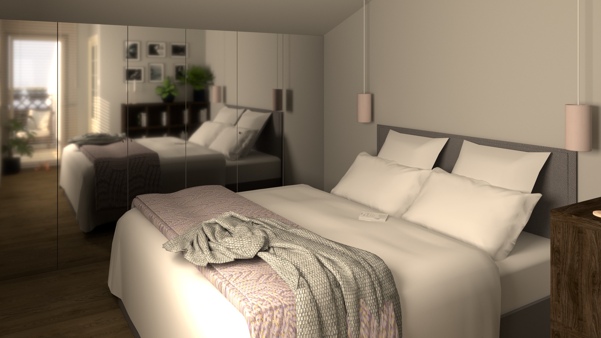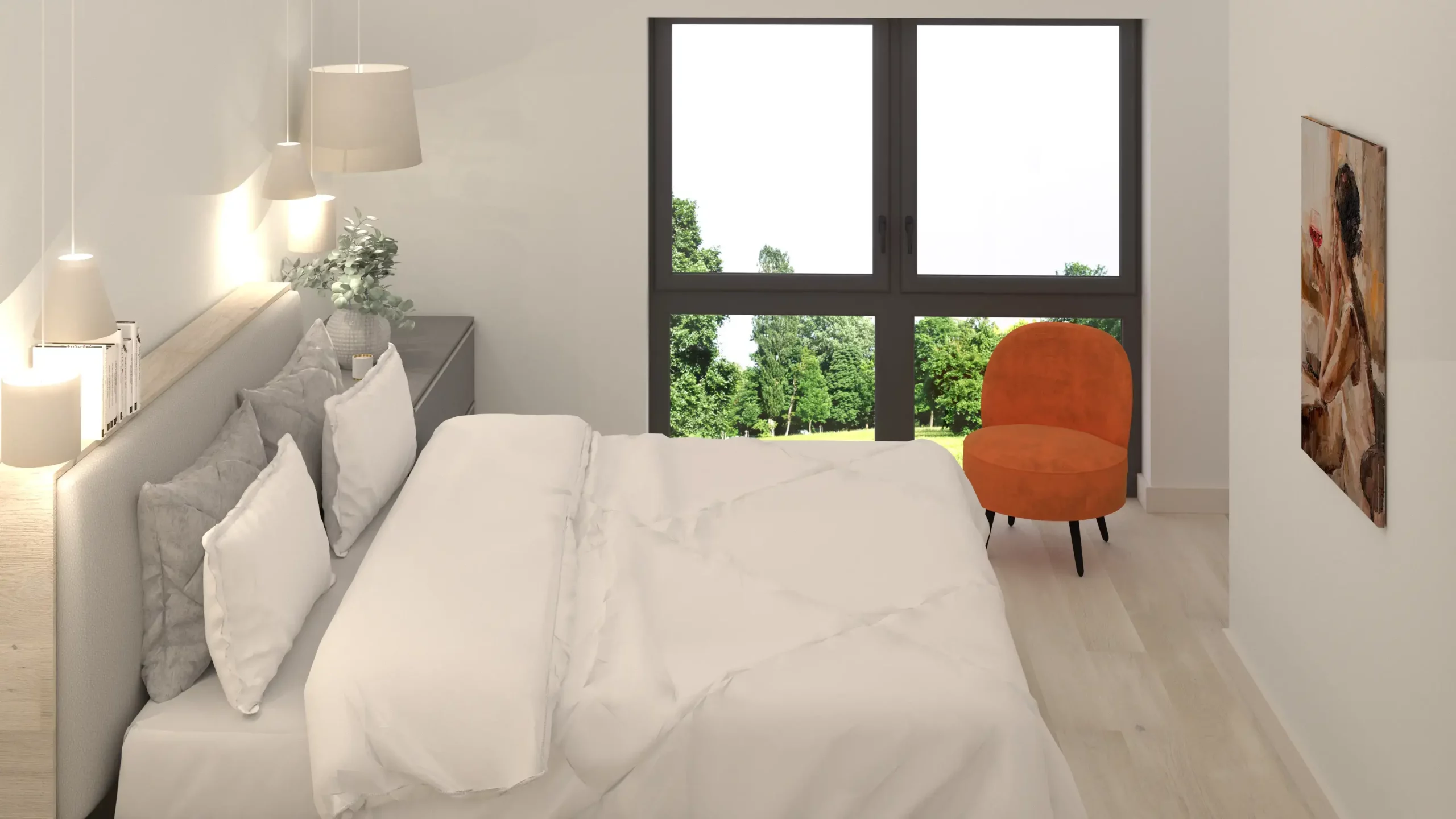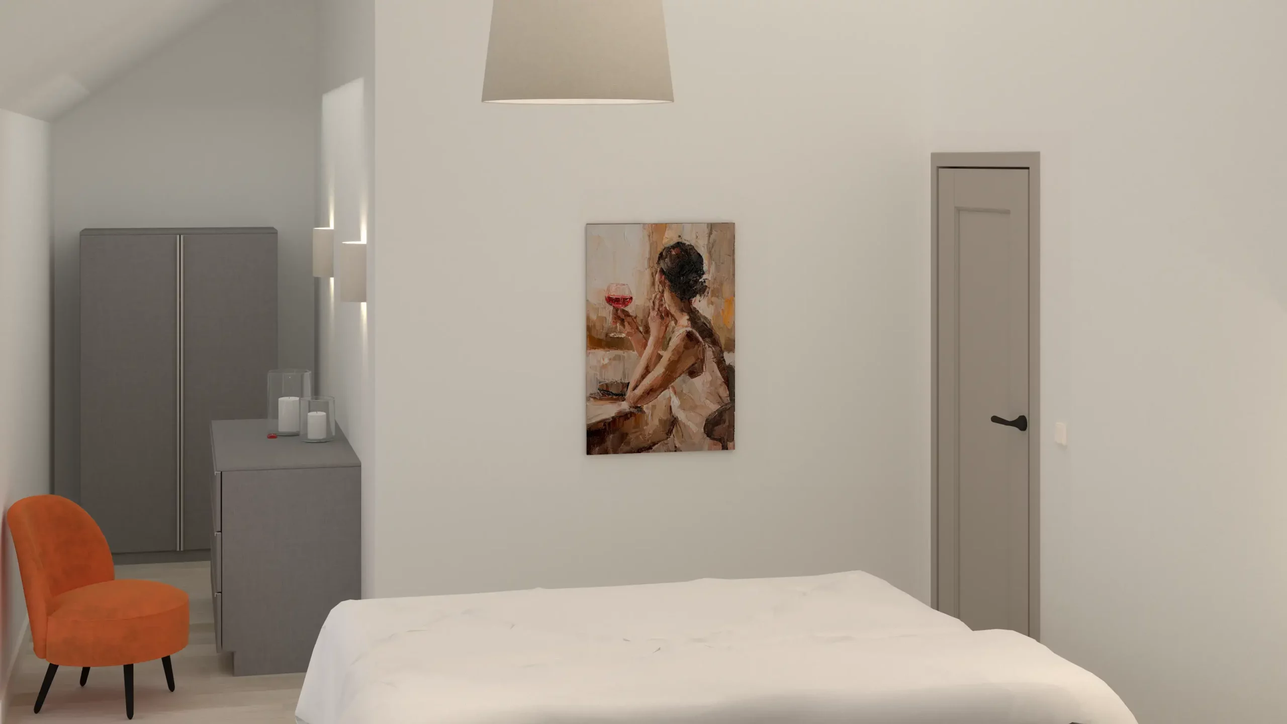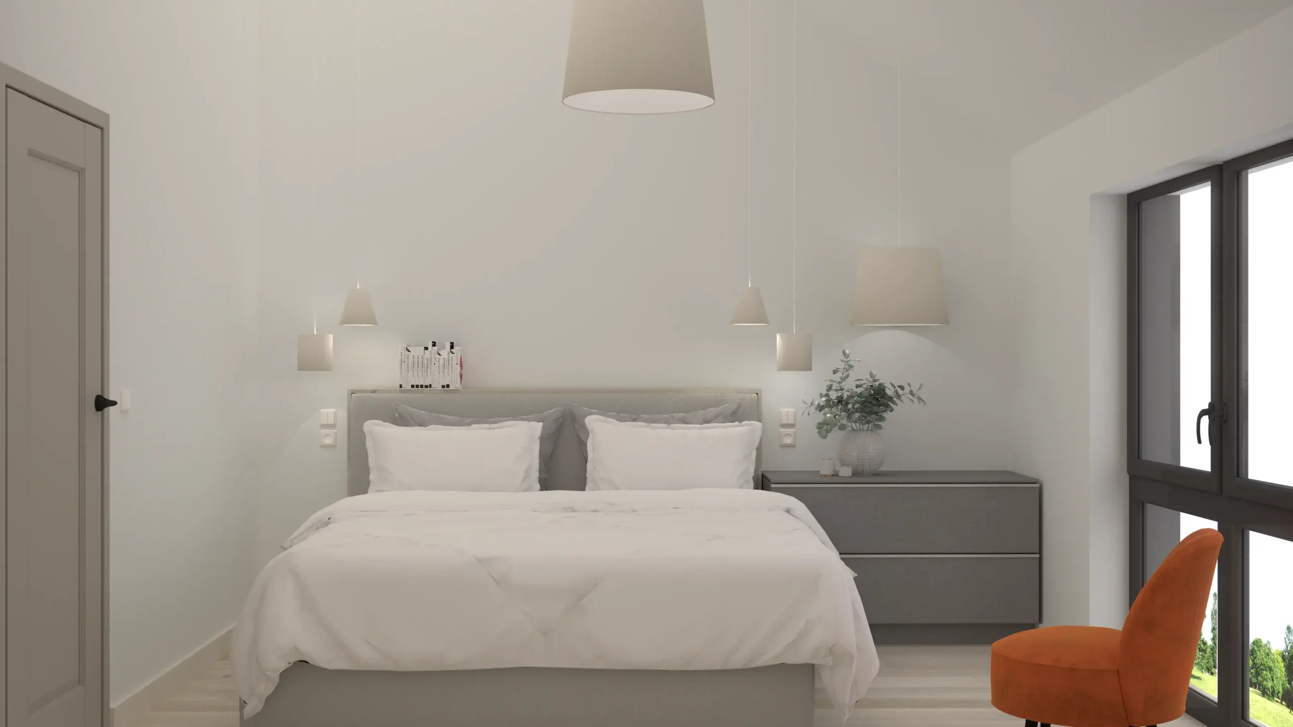 W sypialni gości wykorzystano istniejące meble w odcieniach szarości. Wezgłowie łóżka zabudowano drewnianą ramą, pełniącą funkcję półki. Białe lampy rozświetlają szare barwy, a pomarańczowy fotel przełamuje melancholijny charakter całości.
