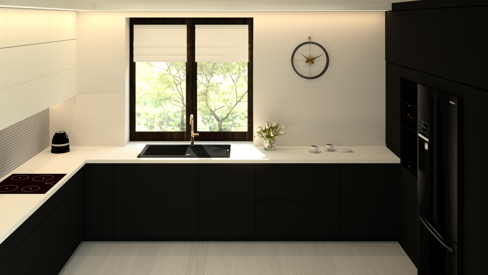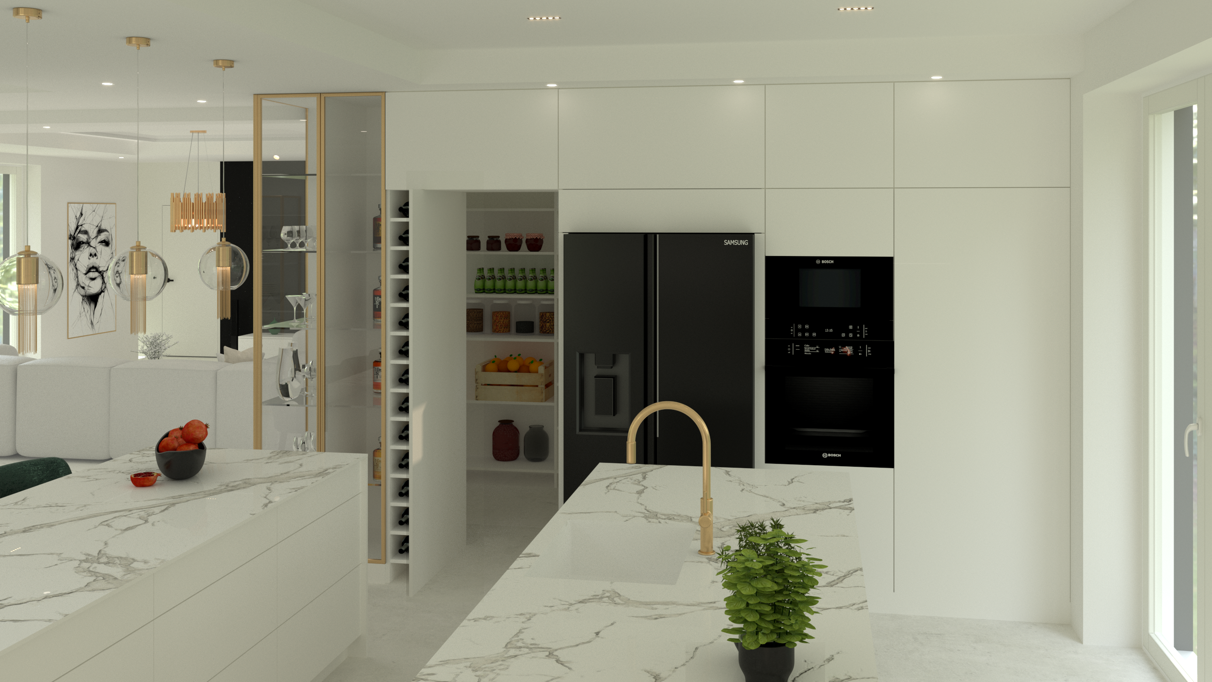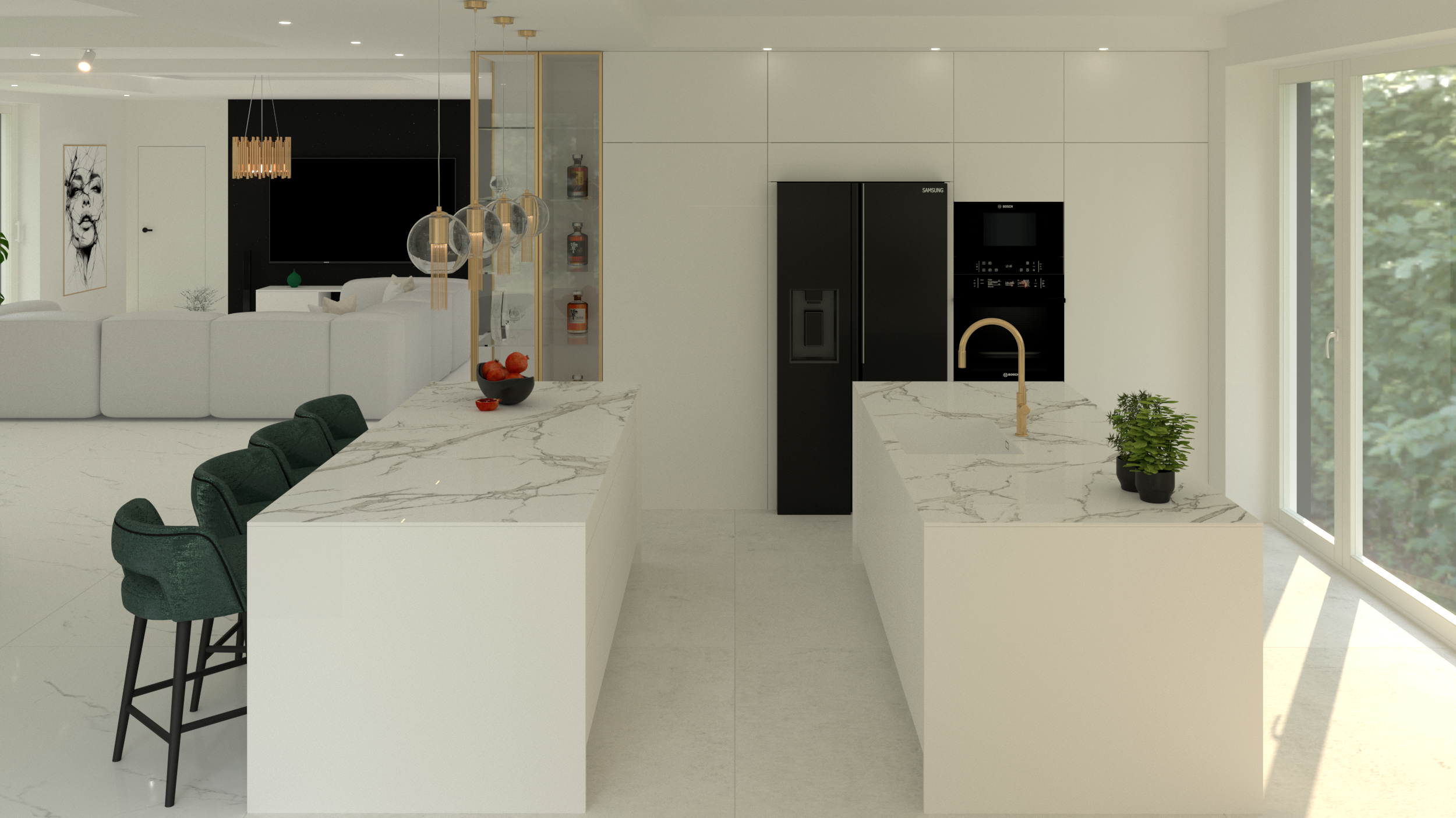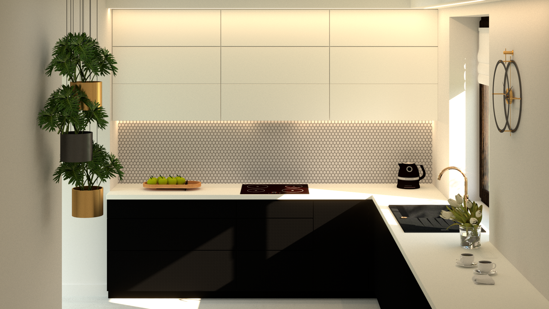 Kuchnia w nowoczesnym stylu. Meble czarne i białe. Złote dodatki. W szafkach i szufladach zaprojektowano mechanizmy wykorzystujące najnowsze technologie ruchu. W wysokiej zabudowie zamiast tradycyjnego kargo szuflady SPACE TOPWER firmy BLUM. Sprzęty takie jak ekspres do kawy czy themomix zostały ukryte za drzwiczkami szafek, na wysuwanych szufladach. Duża powierzchnia blatów roboczych pozwoli na swobodne przygotowywanie posiłków.