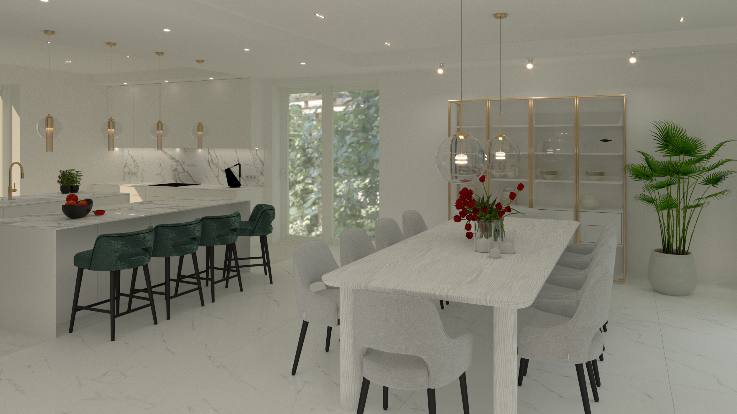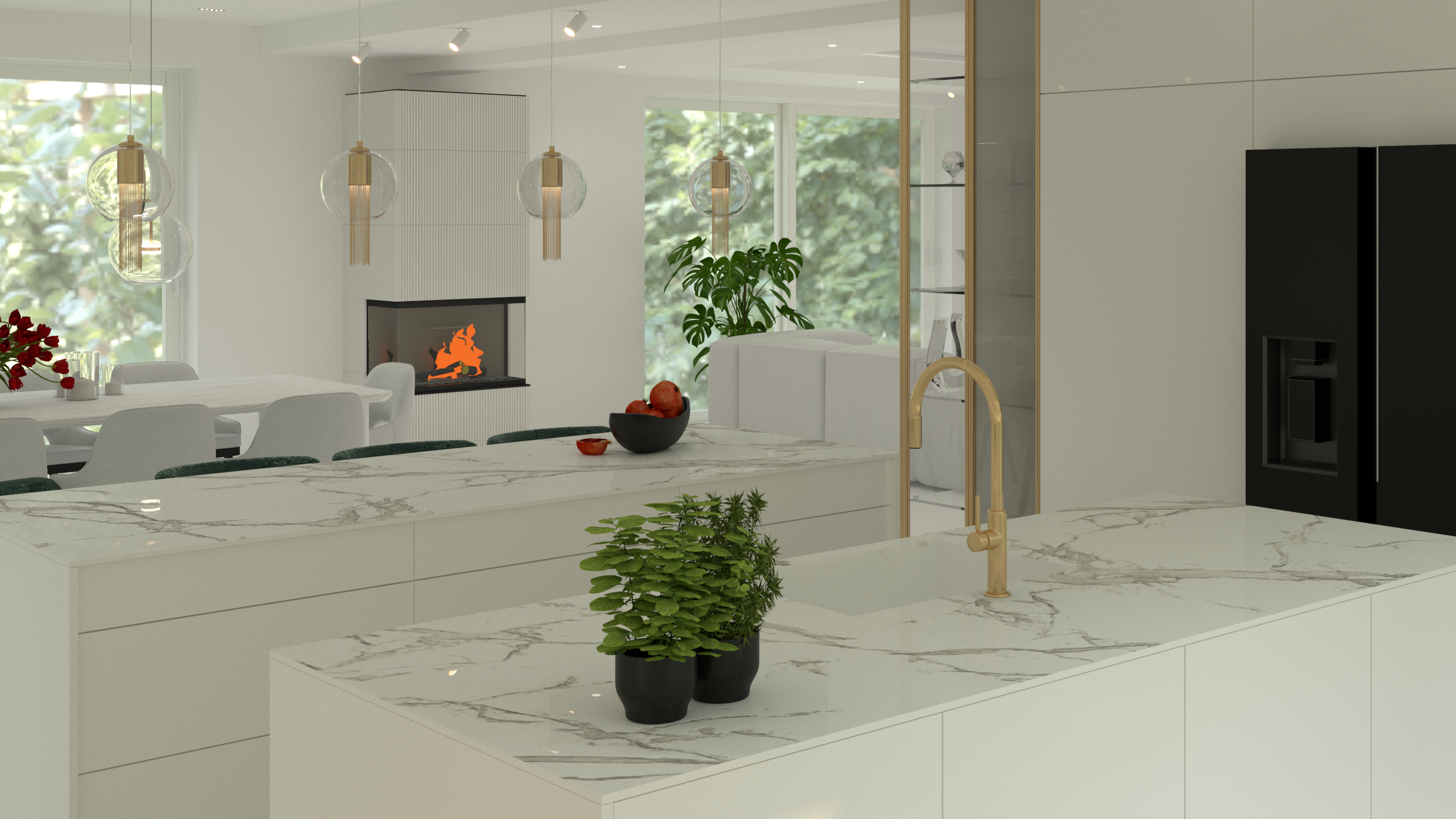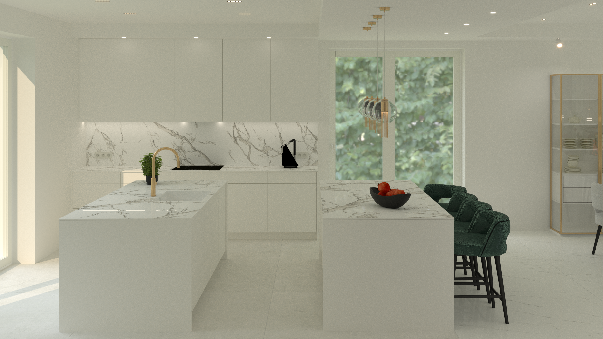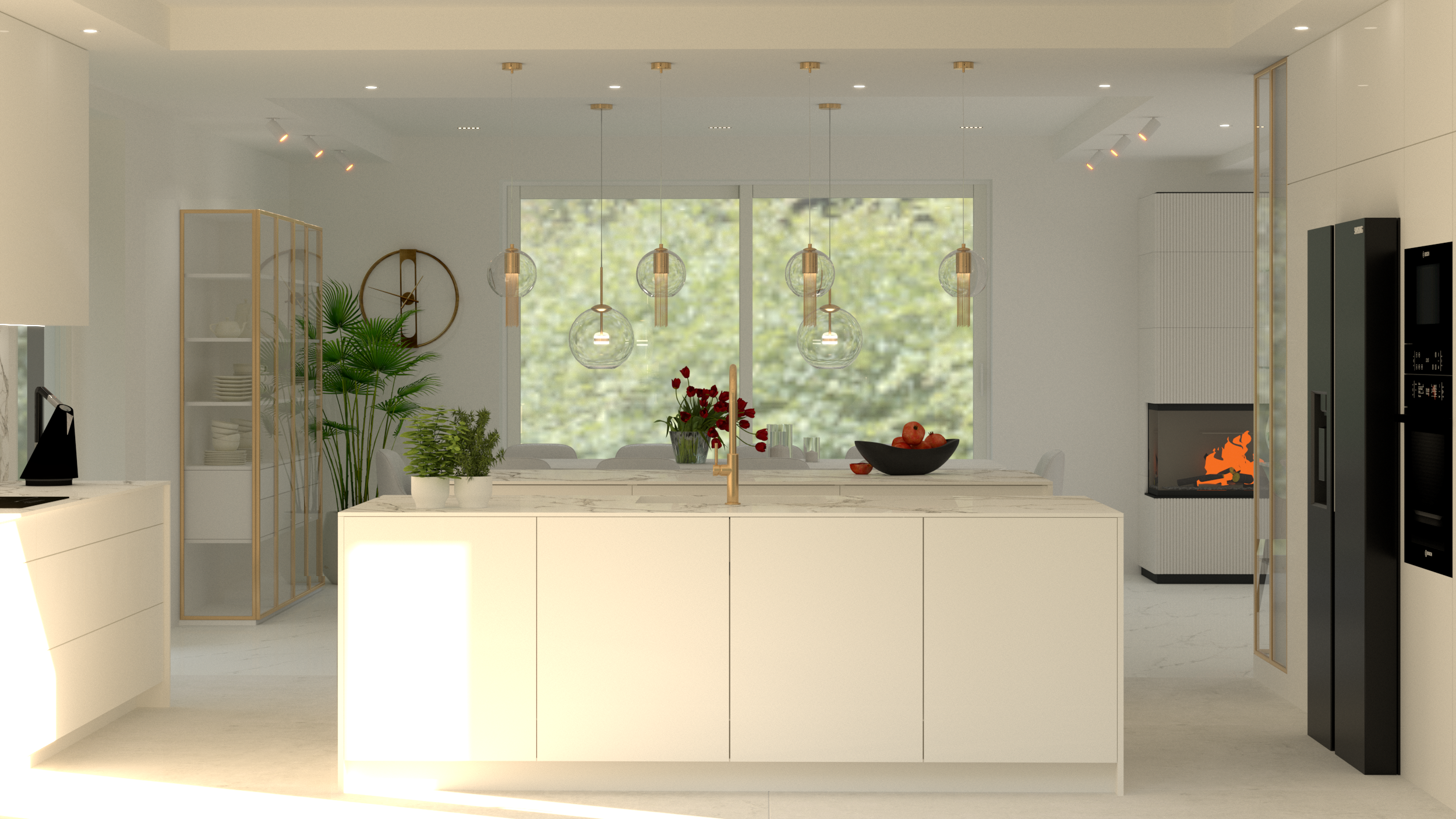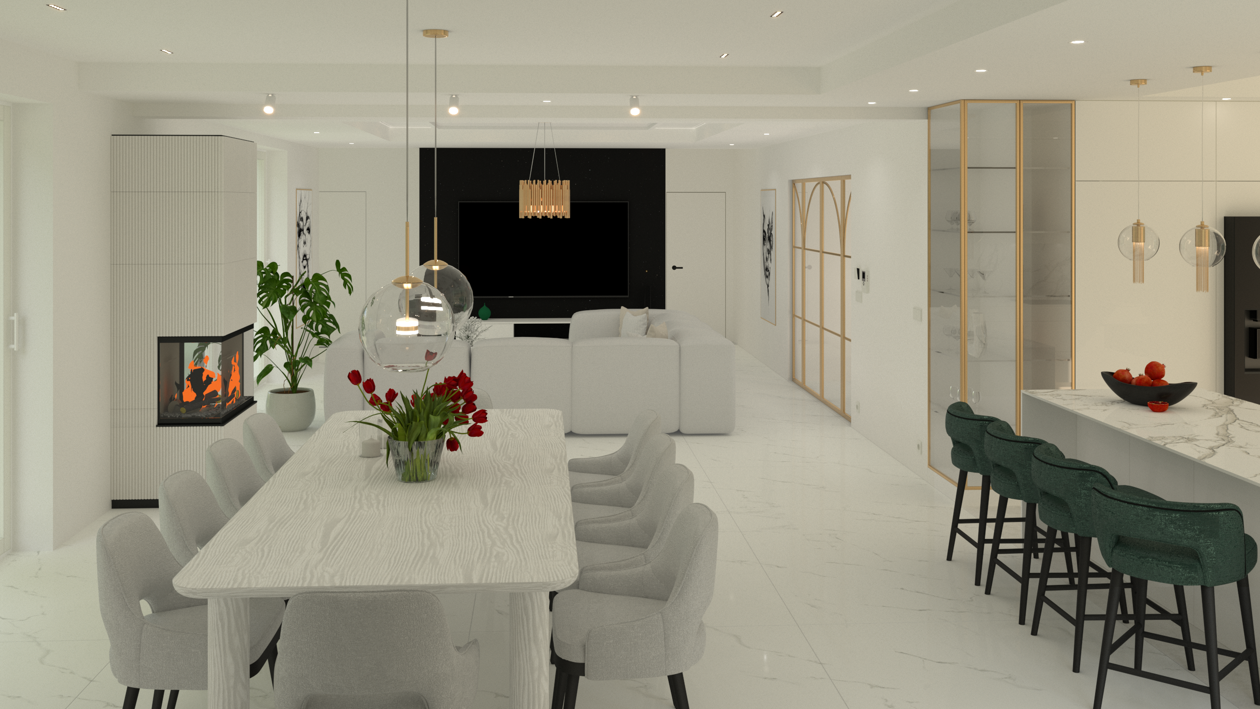 Kuchnia w nowoczesnym stylu. Meble czarne i białe. Złote dodatki. W szafkach i szufladach zaprojektowano mechanizmy wykorzystujące najnowsze technologie ruchu. W wysokiej zabudowie zamiast tradycyjnego kargo szuflady SPACE TOPWER firmy BLUM. Sprzęty takie jak ekspres do kawy czy themomix zostały ukryte za drzwiczkami szafek, na wysuwanych szufladach. Duża powierzchnia blatów roboczych pozwoli na swobodne przygotowywanie posiłków.