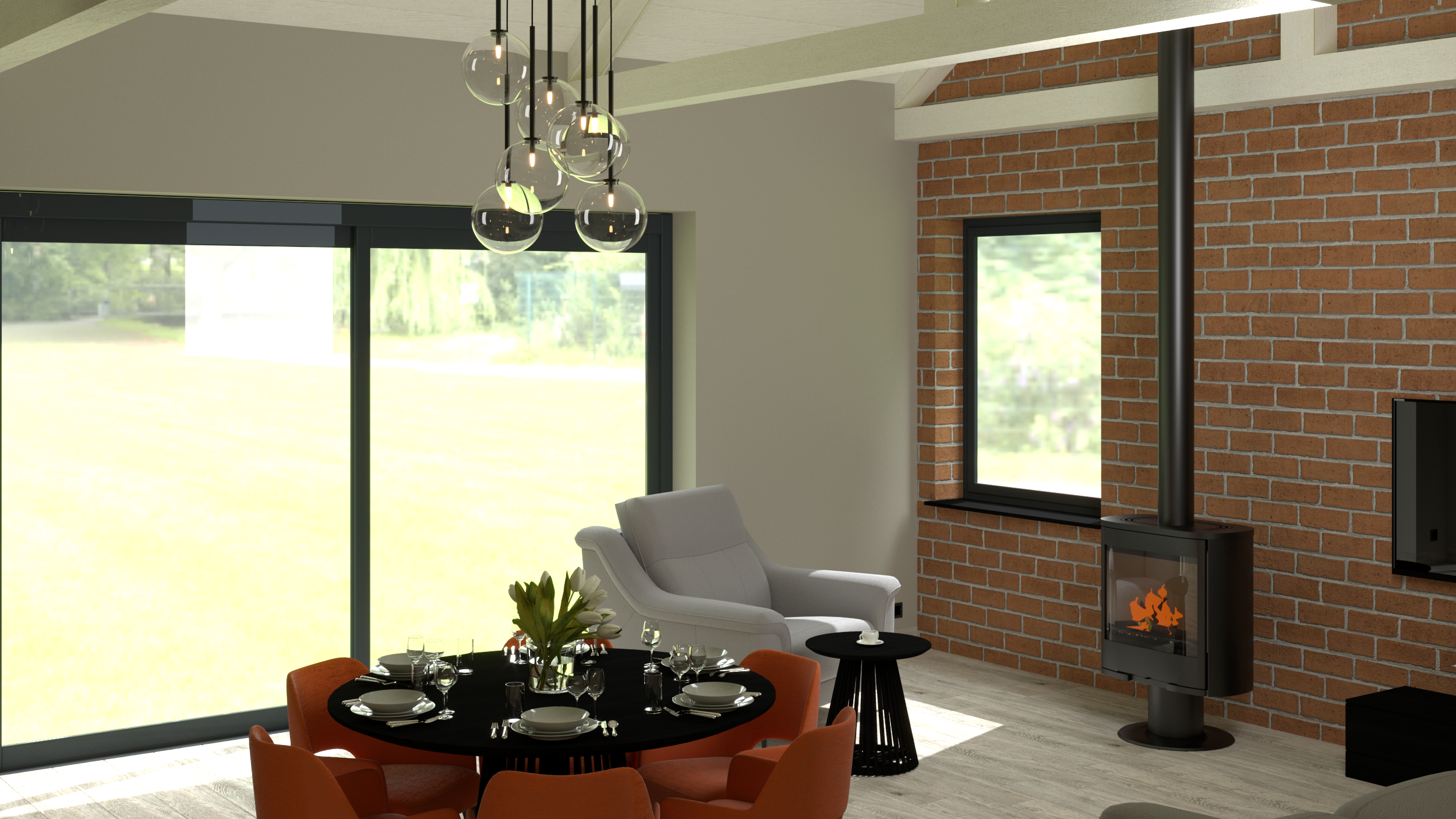 Nowoczesna bryła domu letniego z dużymi przeszkleniami. Kuchnia otwarta na salon, łazienka. Sypialnia na antresoli. Rozbudowa o część parterową z poddaszem użytkowym – przekształcenie na dom całoroczny.